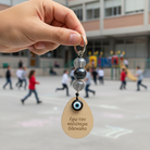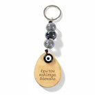 Χειροποίητο μπρελόκ με κεραμικές χάντρες, ματάκι και ξύλινο στοιχείο με χαραγμένη την φράση "έχω τον καλύτερο δάσκαλο".