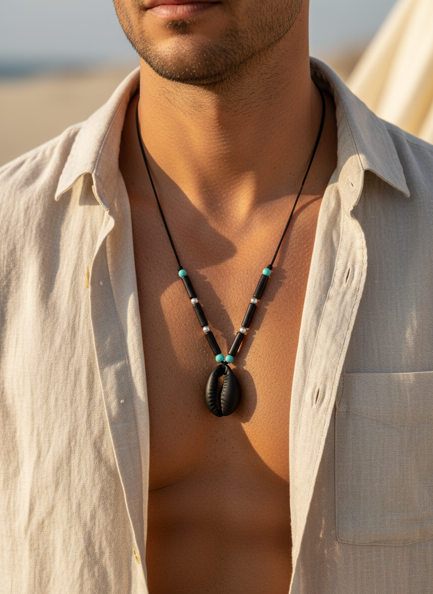 Χειροποίητο κολιέ με κορδόνι, χάντρες χαολίτη, κυλίνδρους από συνθετικό τυρκουάζ, επάργυρα στοιχεία από ορείχαλκο και φυσικό κοχύλι σε μαύρο ματ χρώμα. Περίμετρος 90 εκατοστά με αυξομείωση.