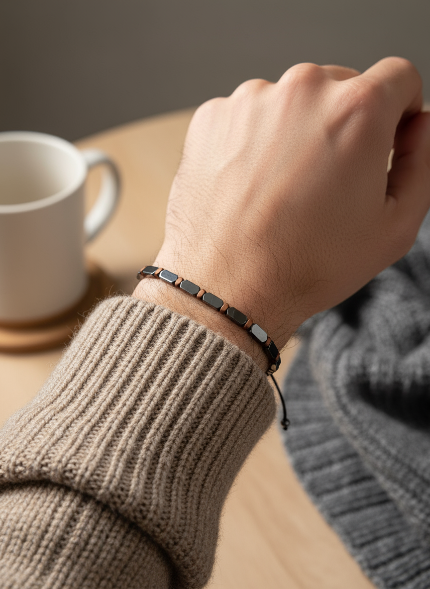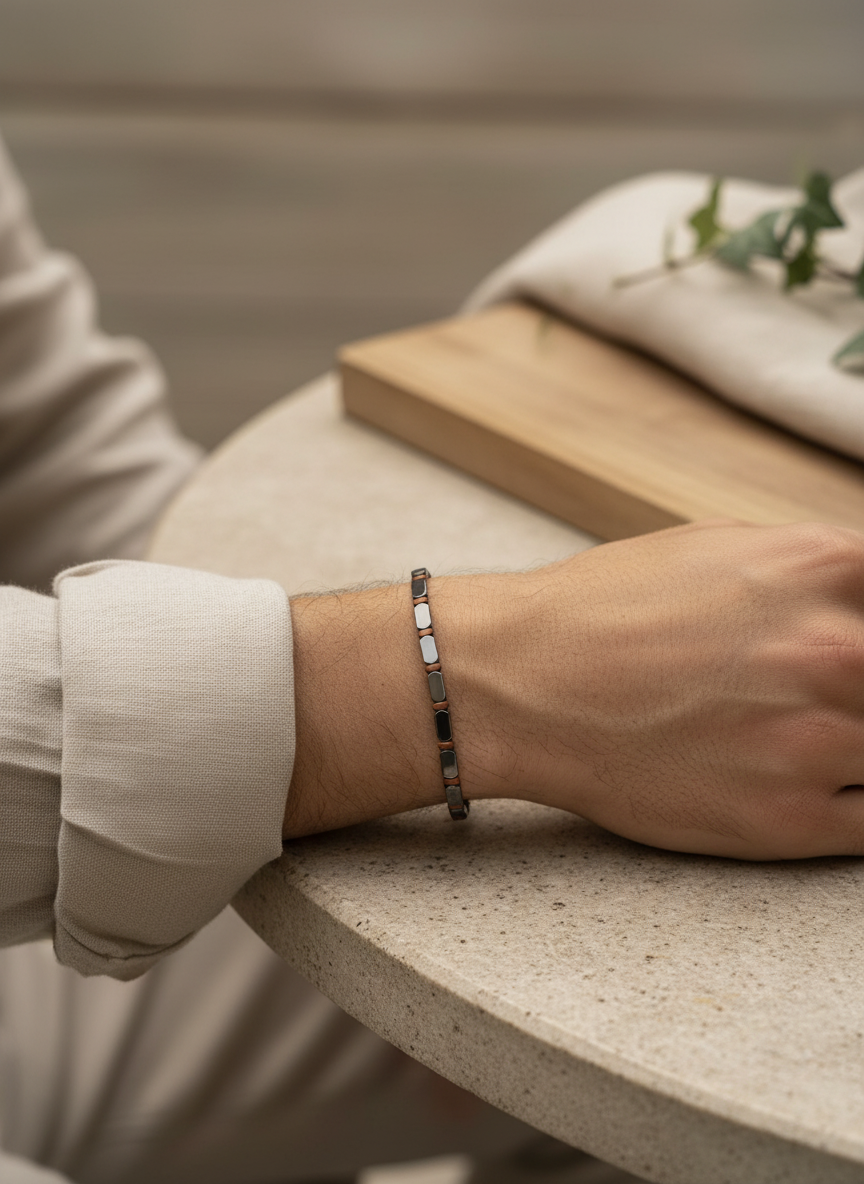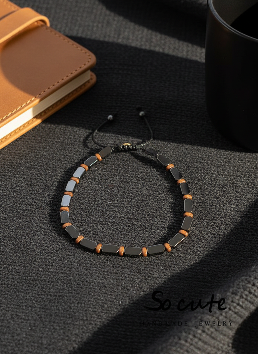 Ένα minimal χειροποίητο βραχιόλι με πλακέ πέτρες αιματίτη, ιδανικό για καθημερινό ανδρικό στυλ. Ο συνδυασμός της μεταλλικής λάμψης με τις λεπτές λεπτομέρειες το κάνει ένα διακριτικό αλλά πολύ κομψό κομμάτι που φοριέται από το πρωί μέχρι το βράδυ.