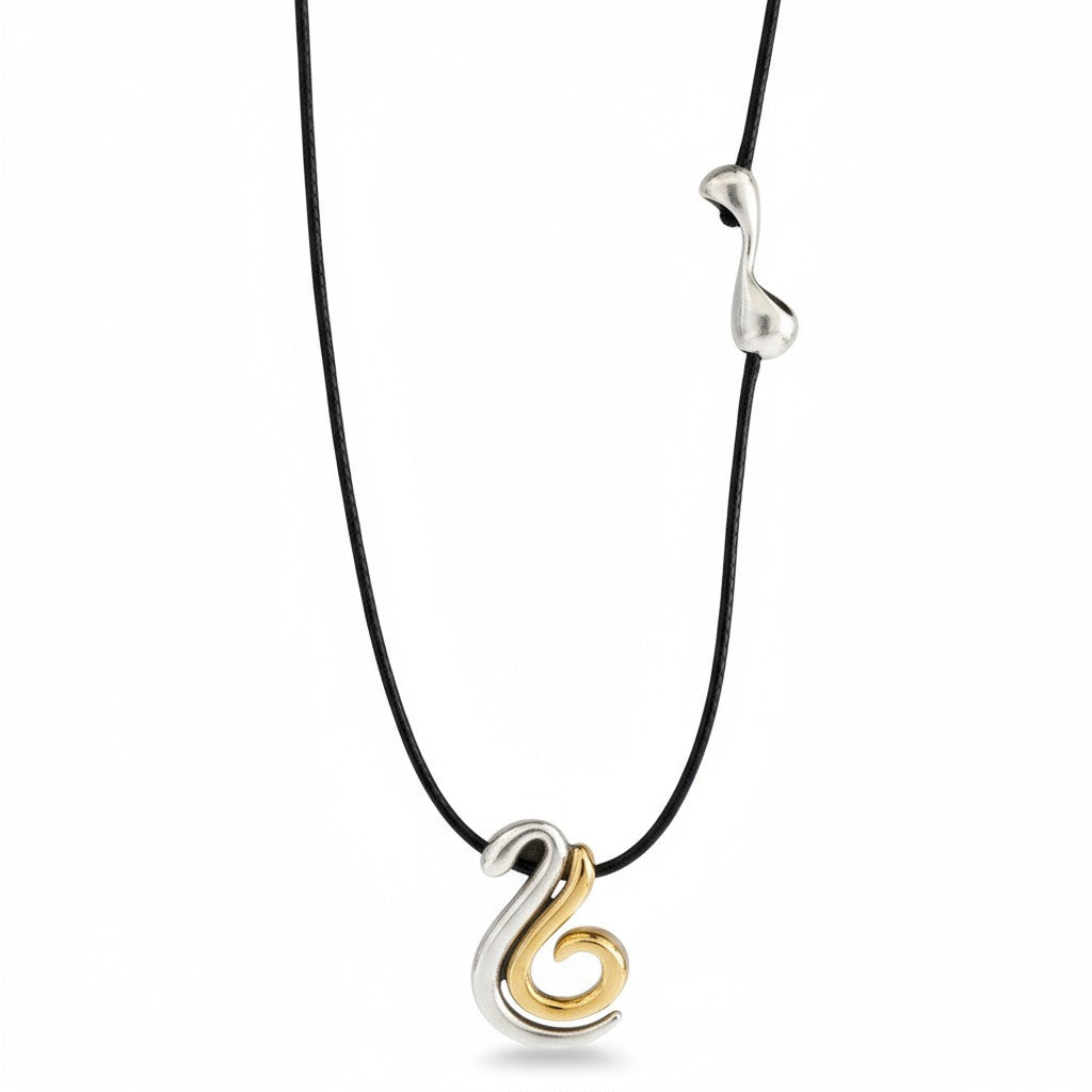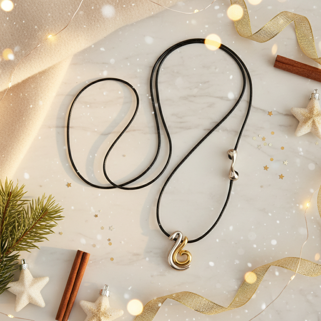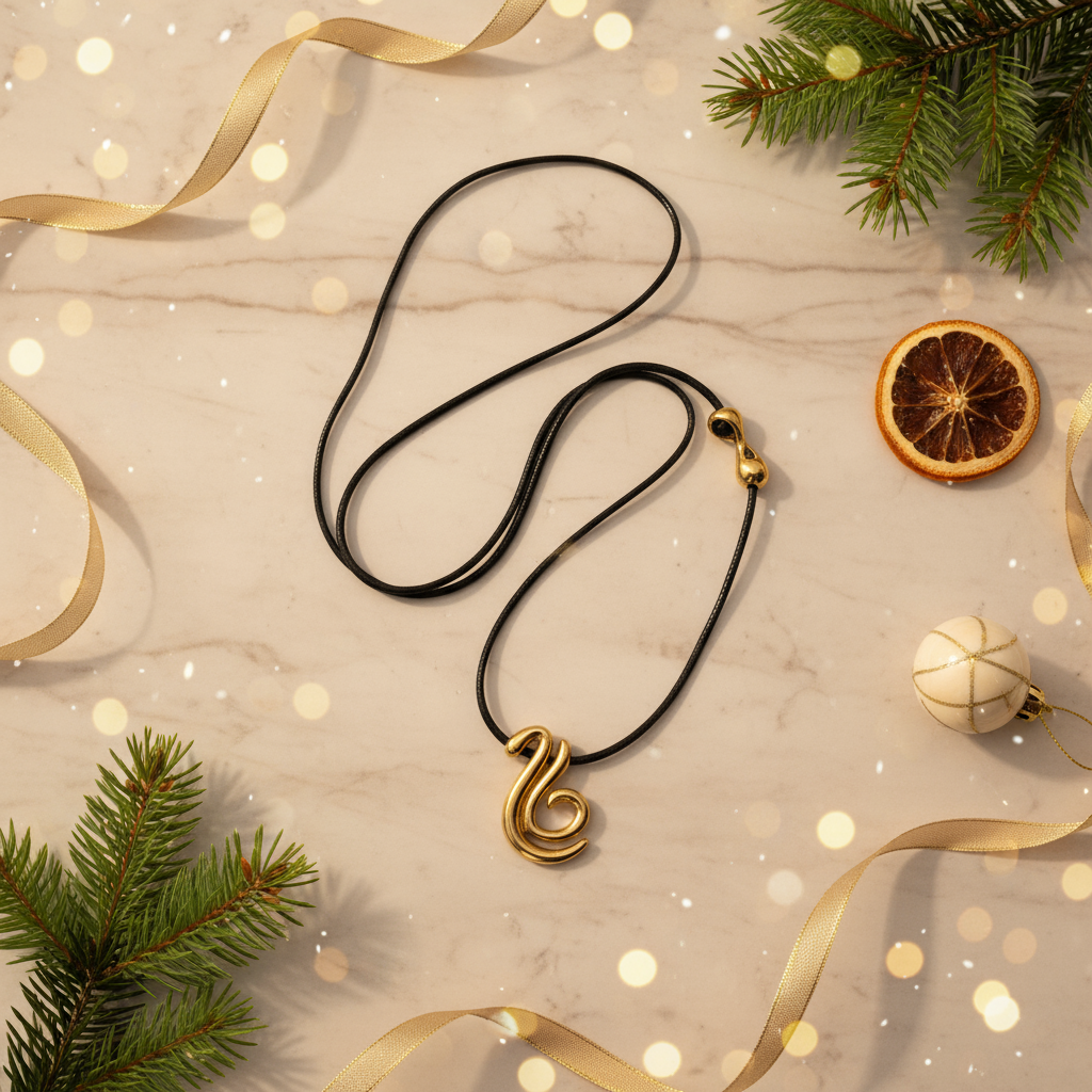 Χειροποίητο γούρι-κολιέ με διπλό μοτίφ 26 σε καμπυλωτό design που συμβολίζει τη νέα χρονιά. Το κρεμαστό συνδυάζει μοντέρνα αισθητική με διαχρονικότητα, ενώ το μαύρο κορδόνι (μήκος 80 εκ., αυξομειούμενο) προσφέρει άνετη εφαρμογή για κάθε στυλ.