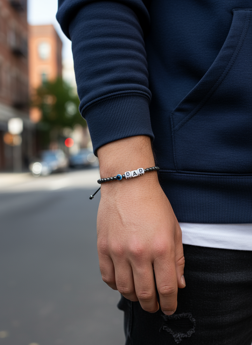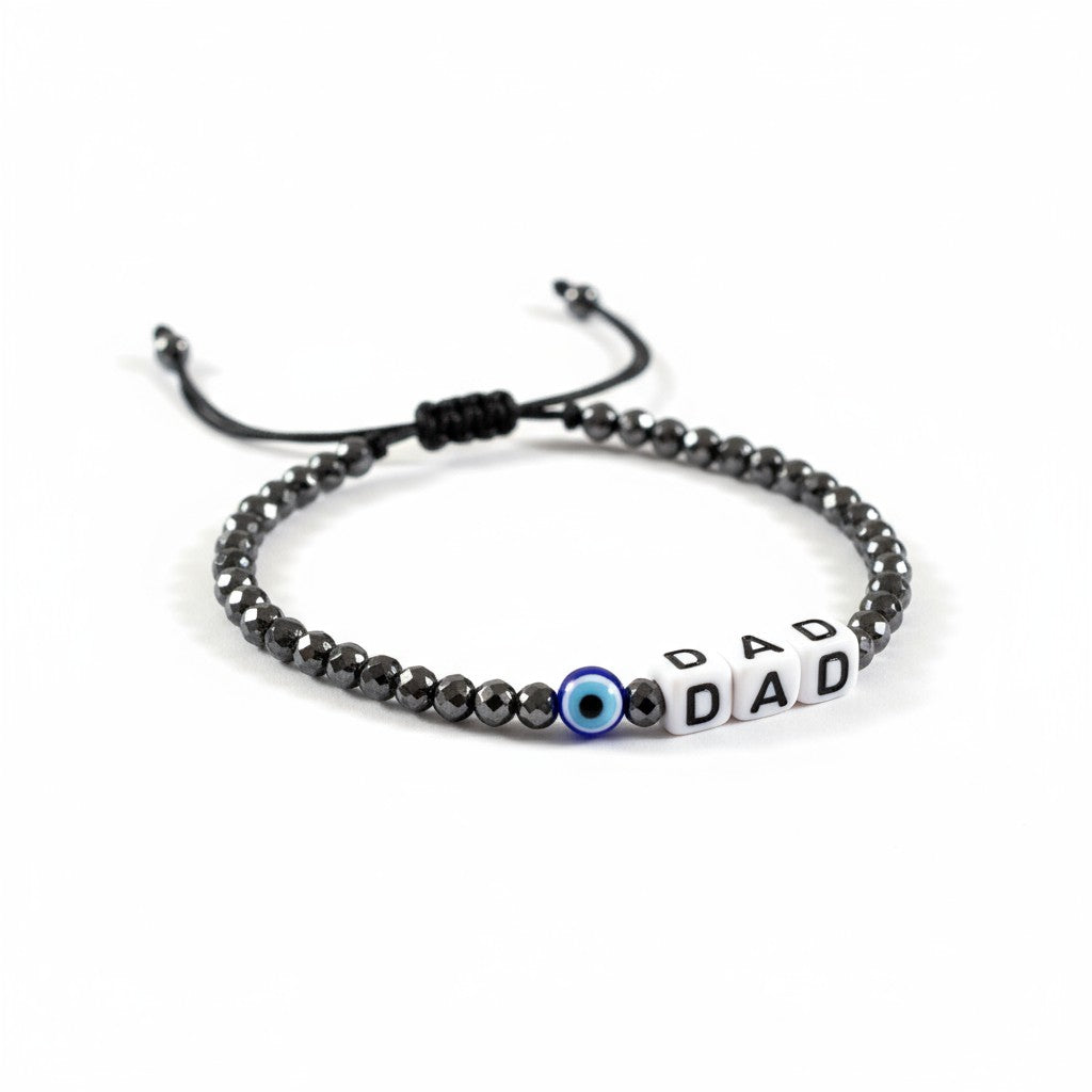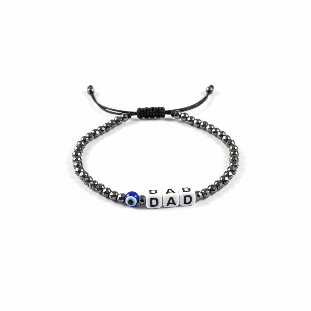 Χειροποίητο βραχιόλι με χάντρες αιματίτη και κύβους με γράμματα από την αγγλική αλφάβητο. Διάλεξε από τις υπάρχουσες λέξεις ή ζήτα μας την δική σου με μήνυμα στο καλάθι (σε αυτή την περίπτωση απαιτείται προπληρωμή μέσω κατάθεσης ή κάρτας)