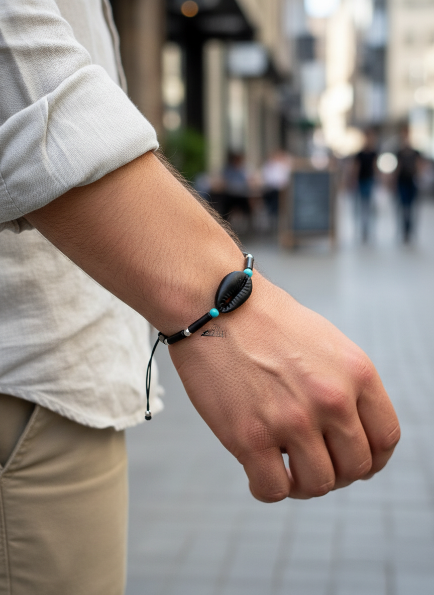 Χειροποίητο βραχιόλι με χάντρες χαολίτη, κυλίνδρους από συνθετικό τυρκουάζ, επάργυρα στοιχεία από ορείχαλκο και φυσικό κοχύλι σε μαύρο ματ χρώμα. Το μέγεθος αυξομειώνει.