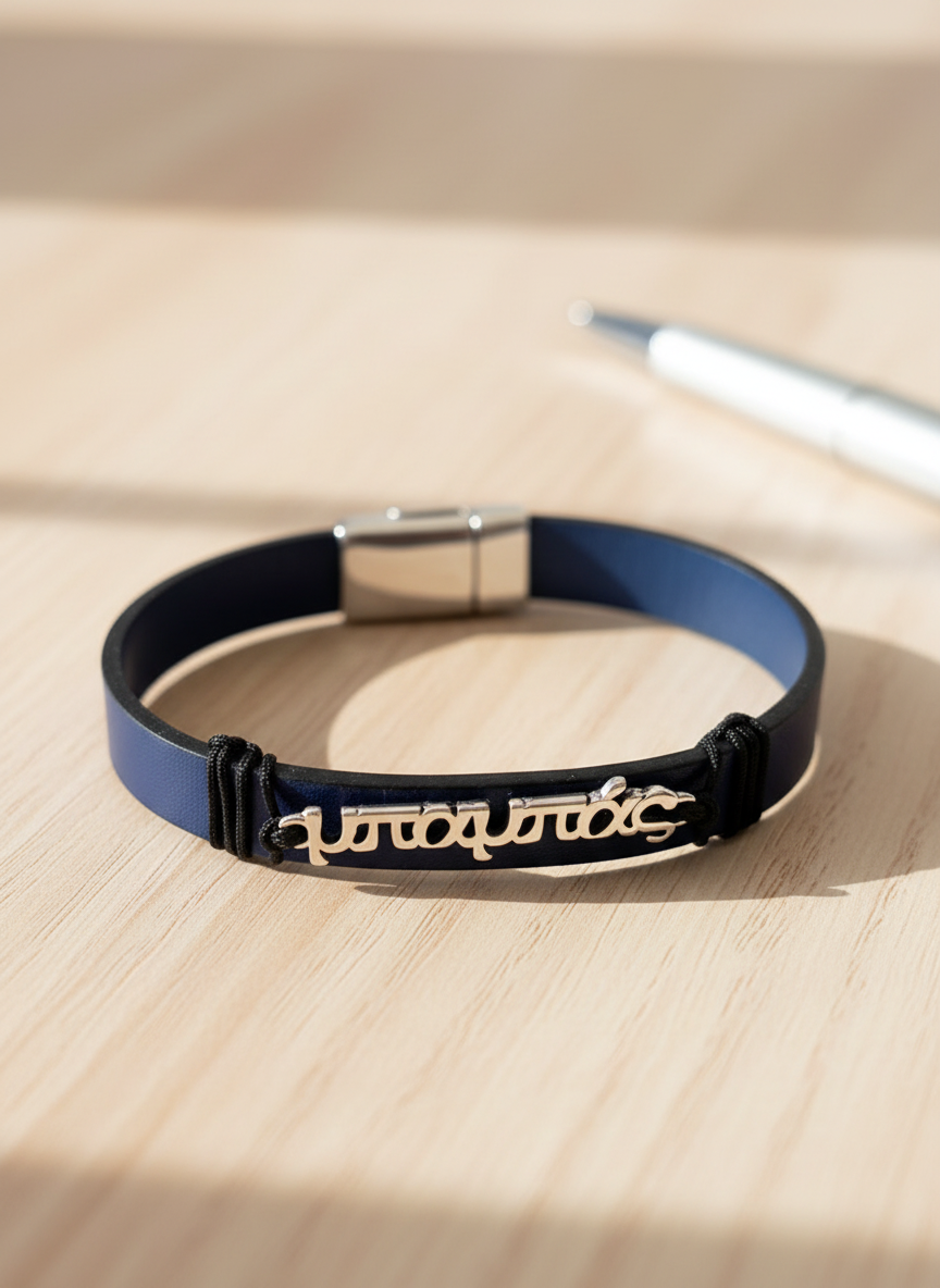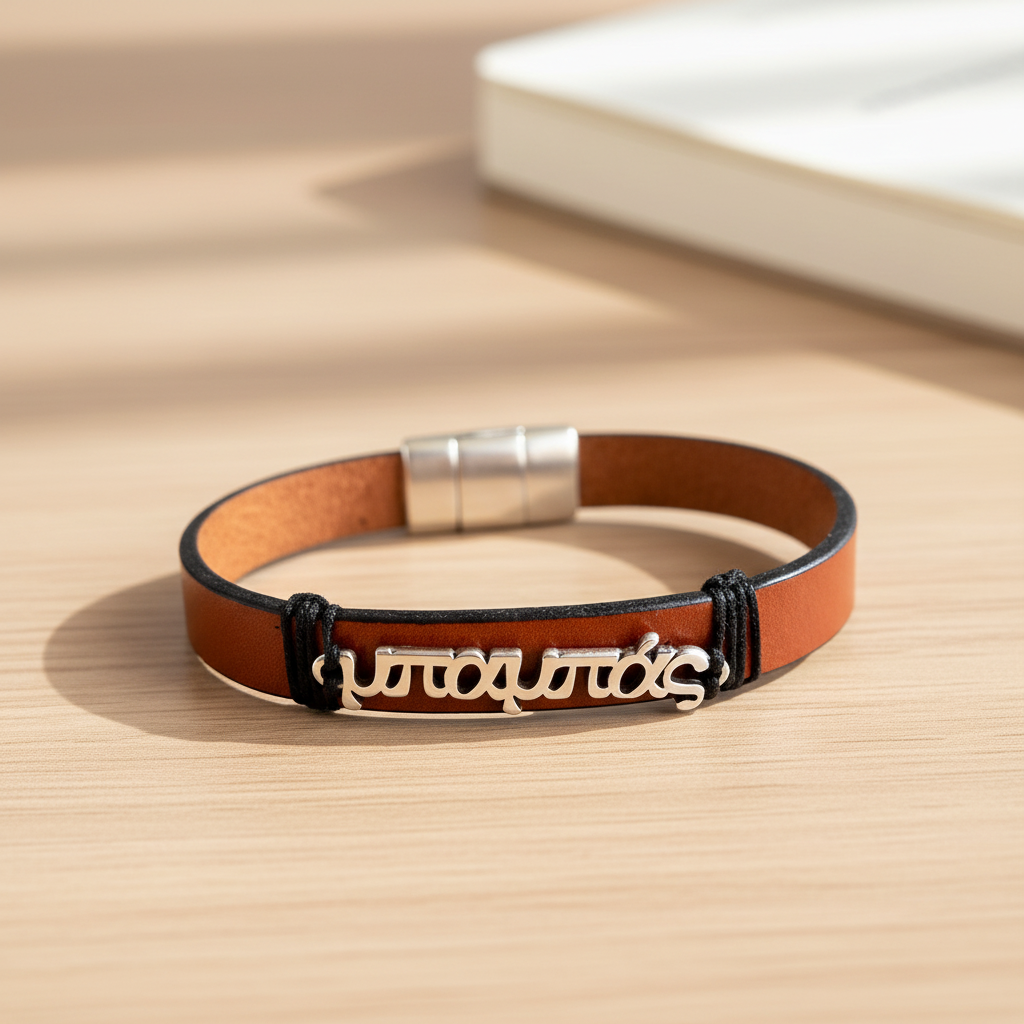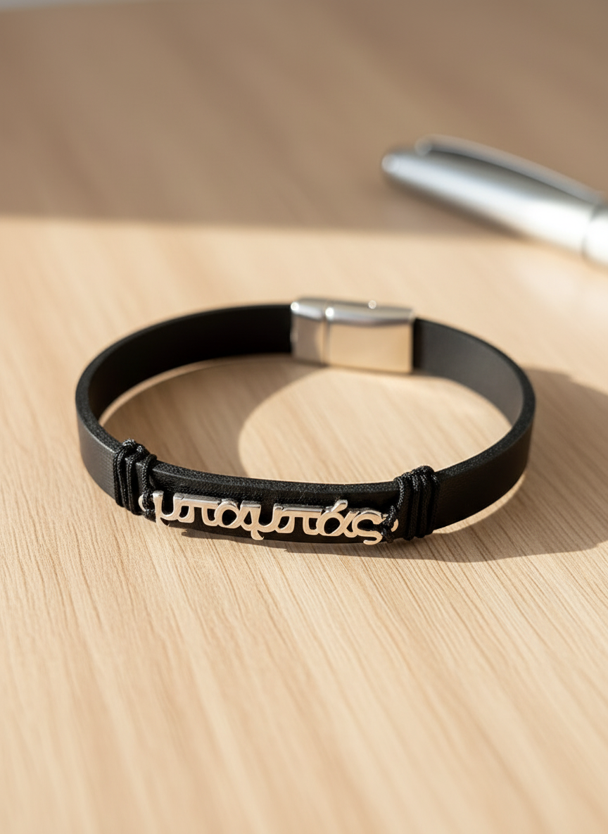 Ένα minimal και απόλυτα ανδρικό κόσμημα για τον πιο σημαντικό άνθρωπο της ζωής σου. Δερμάτινο χειροποίητο βραχιόλι με επάργυρη ταυτότητα “μπαμπάς” και μαγνητικό κούμπωμα ασφαλείας από ορείχαλκο ελληνικής κατασκευής — στιβαρό, άνετο και ιδανικό για καθημερινή χρήση.