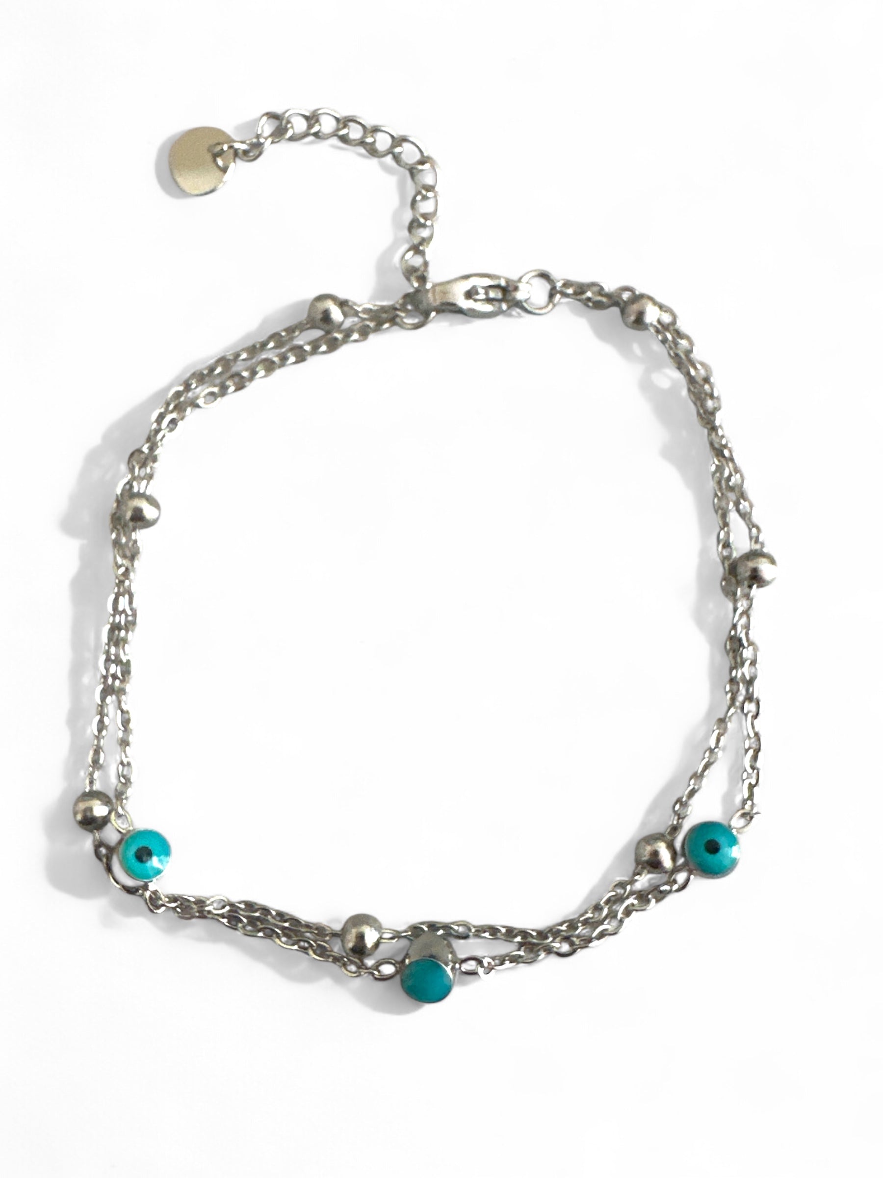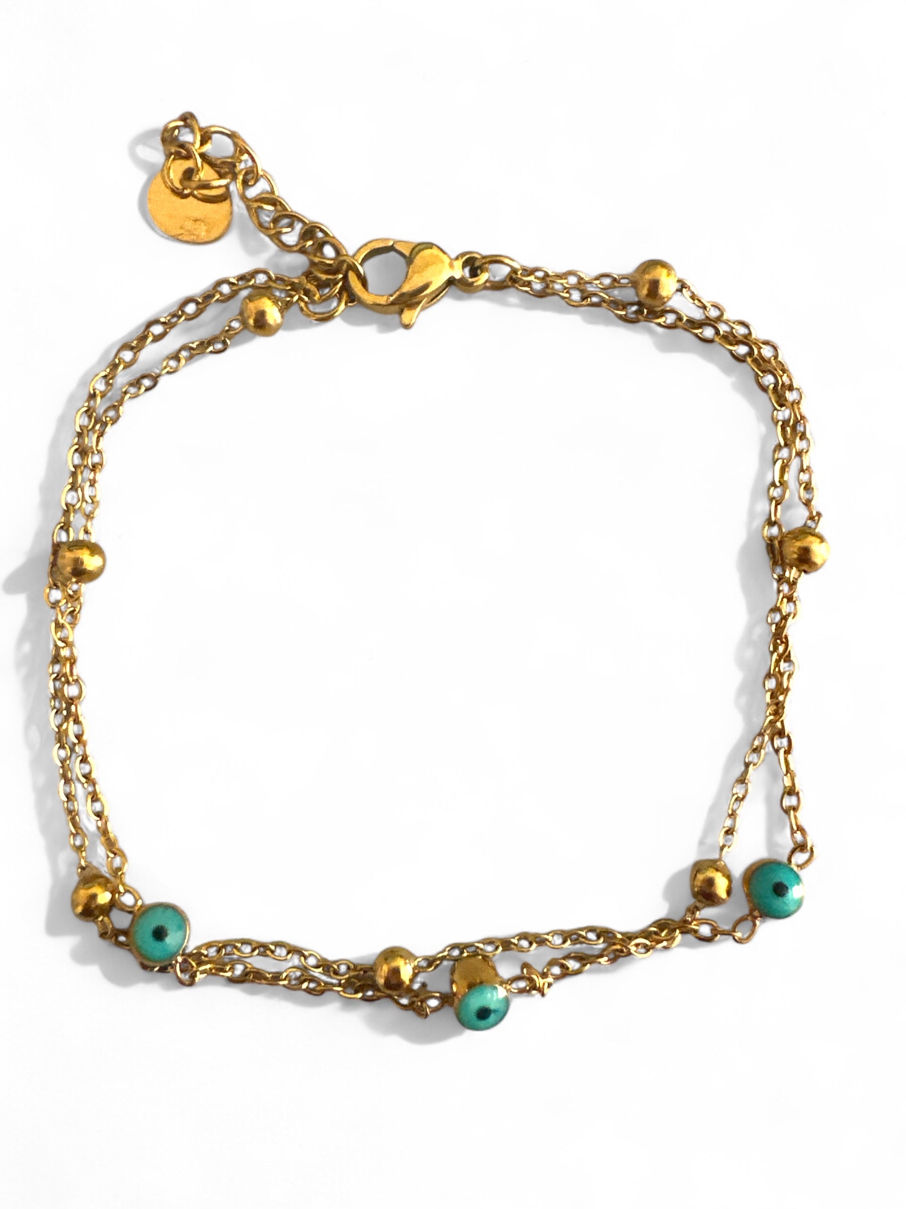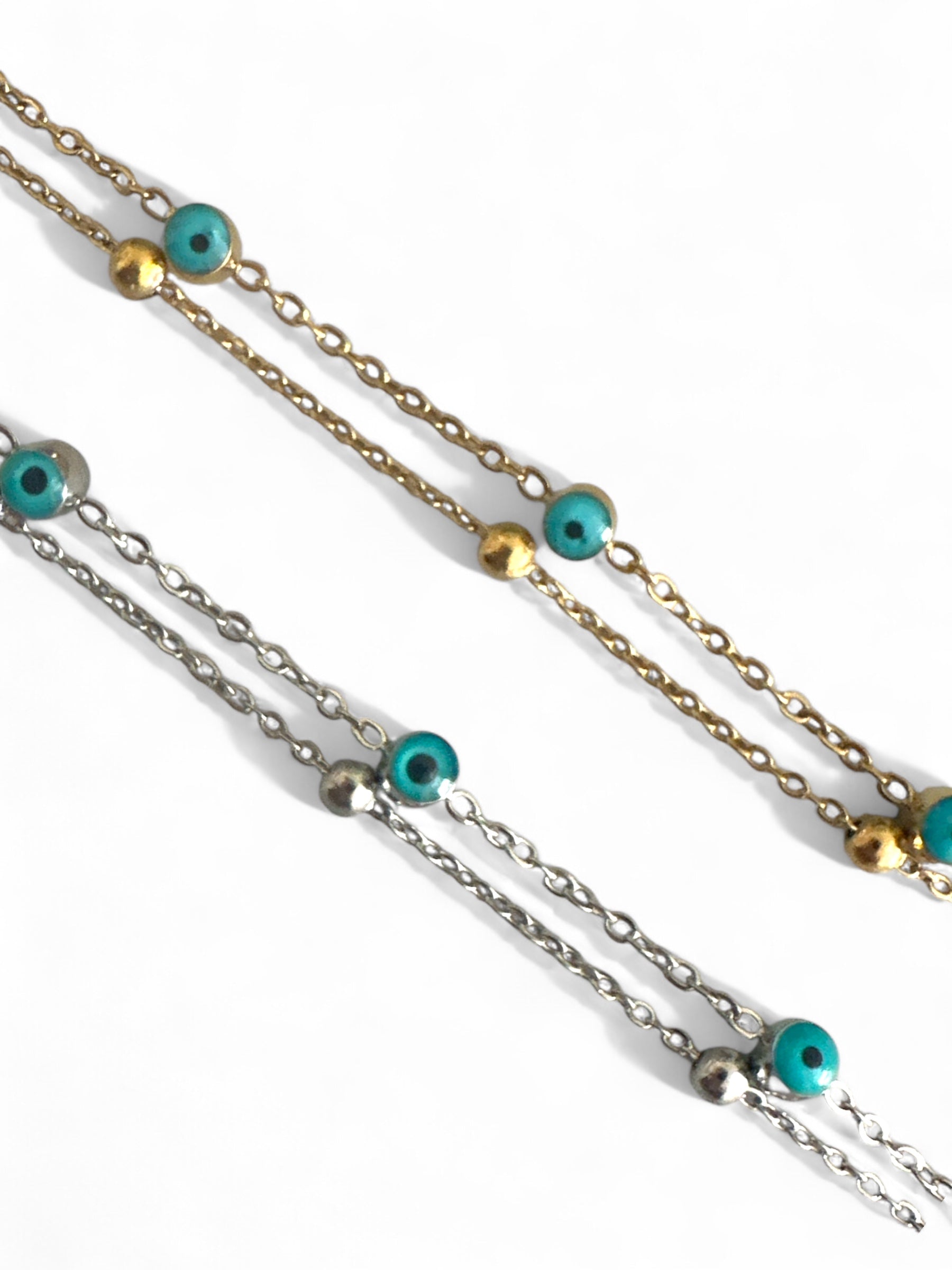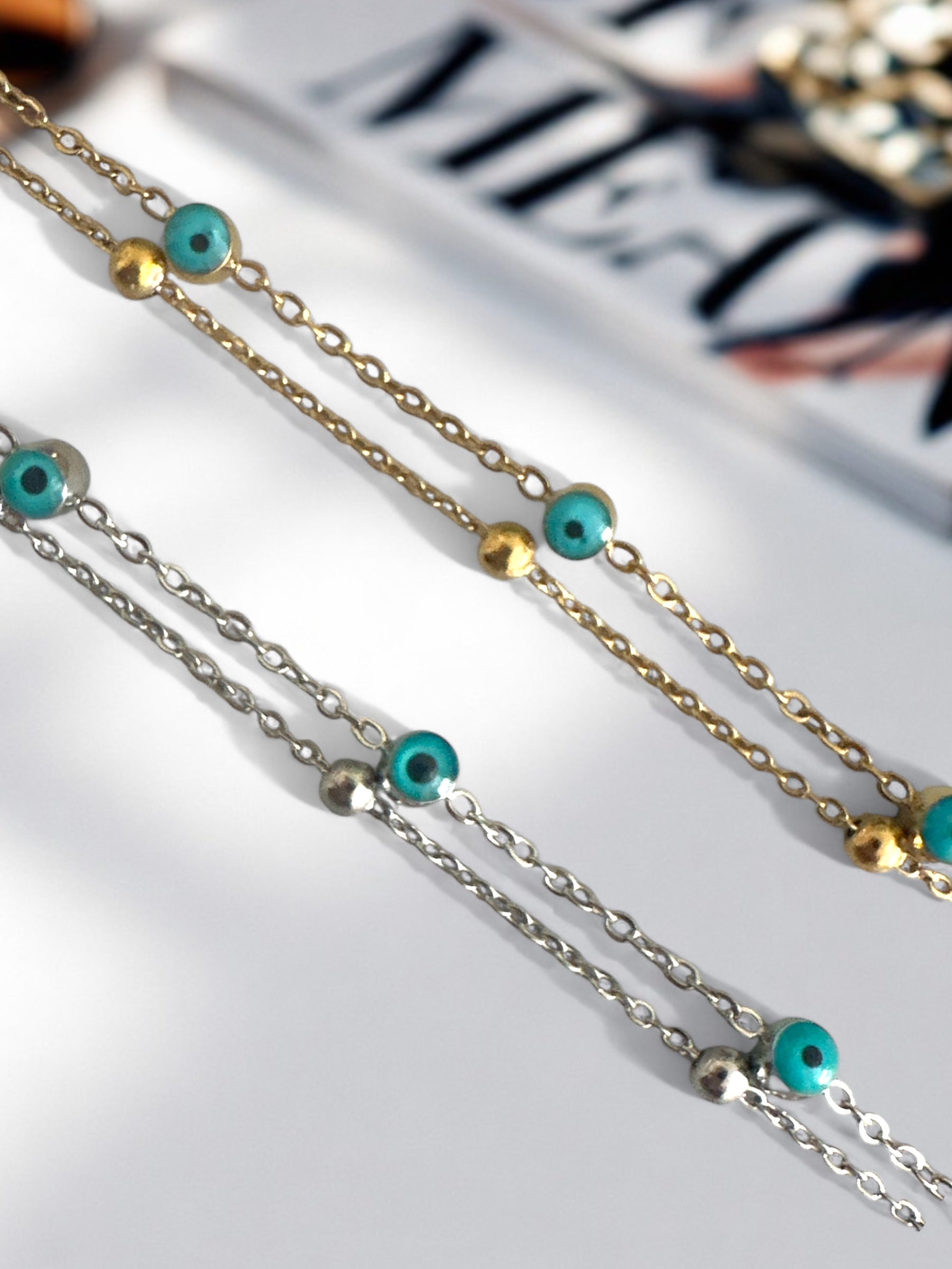 Δώσε στυλ και προστασία σε κάθε σου εμφάνιση με το ατσάλινο διπλό βραχιόλι με ματάκια. Η διπλή λεπτή αλυσίδα του διακοσμείται με στρογγυλές μπίλιες και μικρά γαλάζια ματάκια, δημιουργώντας έναν τέλειο συνδυασμό girly και boho αισθητικής. Διατίθεται σε ασημί και χρυσή απόχρωση για να ταιριάζει με κάθε look.
