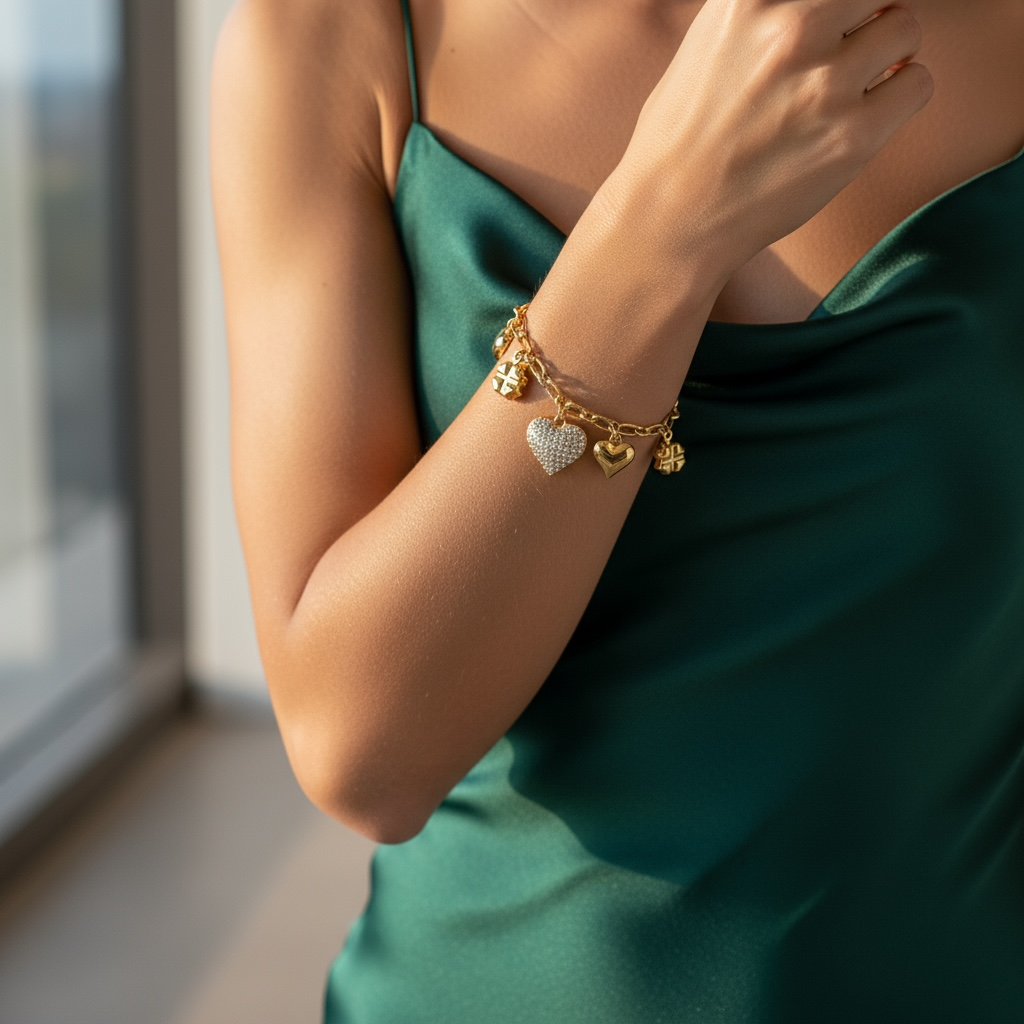 Με λαμπερά charms σε αποχρώσεις χρυσού ή ασημιού, και καρδιές με στρας που κλέβουν την παράσταση, αυτό το βραχιόλι θα γίνει το νέο σου everyday lucky piece!