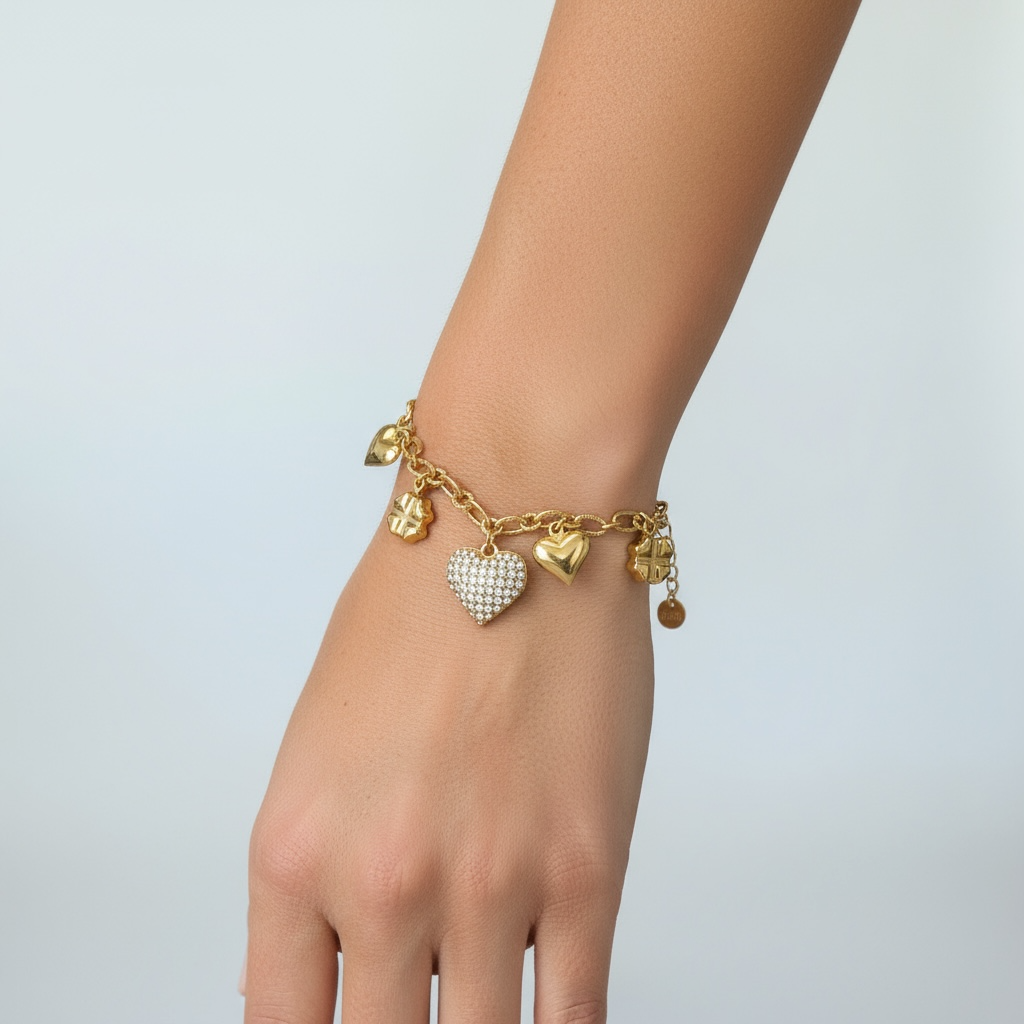Ένα βραχιόλι που συνδυάζει καρδιές γεμάτες αγάπη και τετράφυλλα σύμβολα τύχης, γιατί τα πιο όμορφα πράγματα συμβαίνουν όταν έχεις και τα δύο ✨