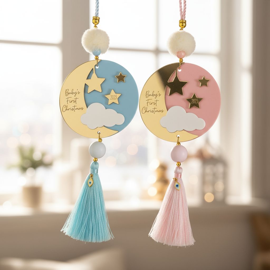Κατασκευασμένο από παστέλ plexiglass σε ροζ ή γαλάζιο, με ημισέληνο από χρυσό καθρέφτη που φέρει χάραξη Baby’s First Christmas. Στολίζεται με αστεράκια, σύννεφο, χάντρες, πον πον από τούλι και ολοκληρώνεται με φούντα και ματάκι για προστασία.