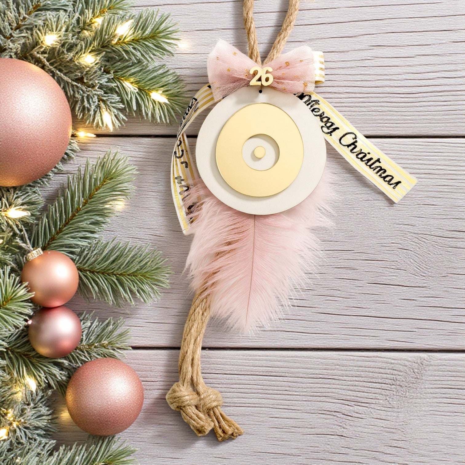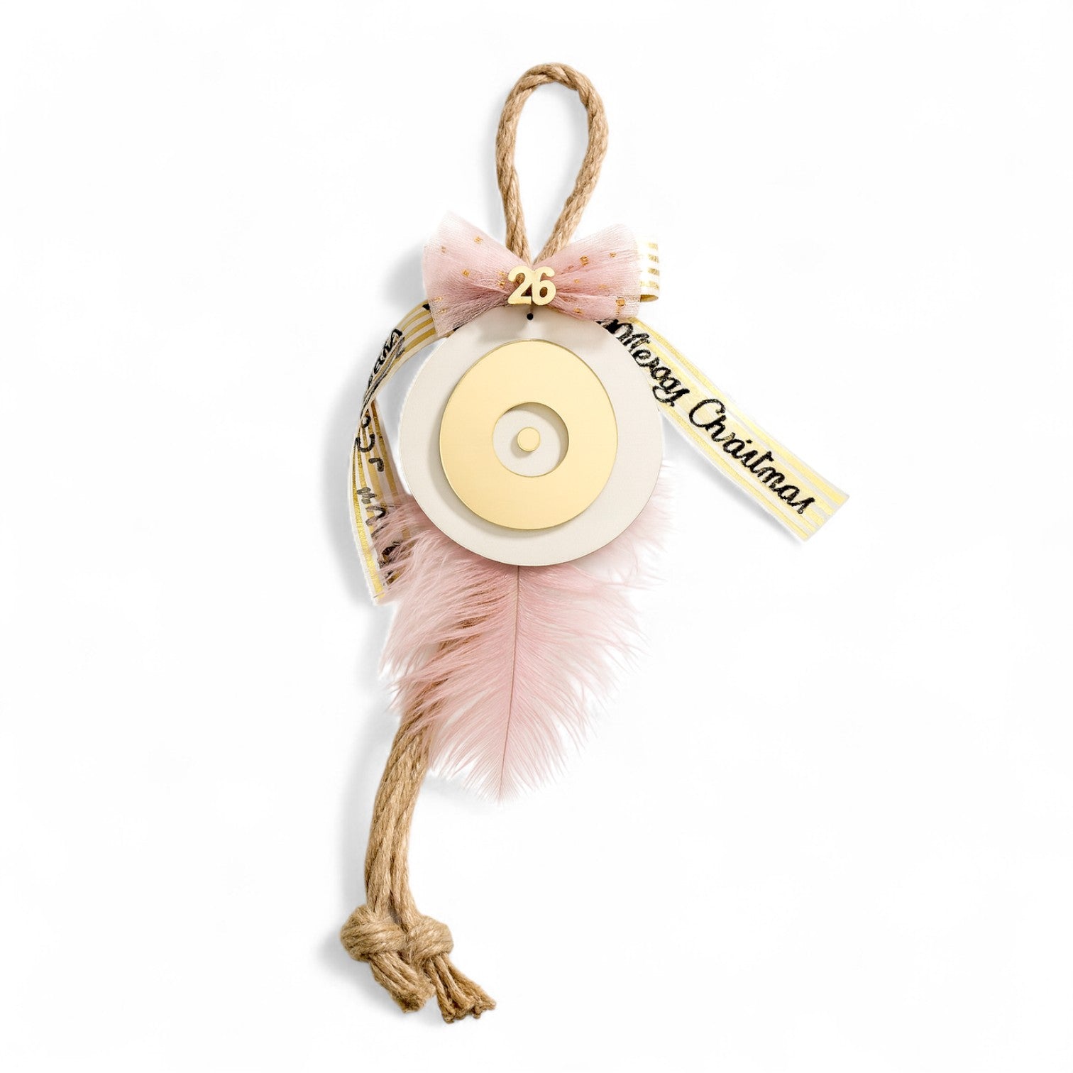 Ένα κομψό, χειροποίητο κρεμαστό γούρι με λευκή βάση, χρυσό μάτι καθρέφτη και ροζ φτερό που προσθέτει girly boho ενέργεια. Ιδανικό για να στολίσει τον χώρο σου ή να προσφερθεί ως γιορτινό, τρυφερό δώρο.