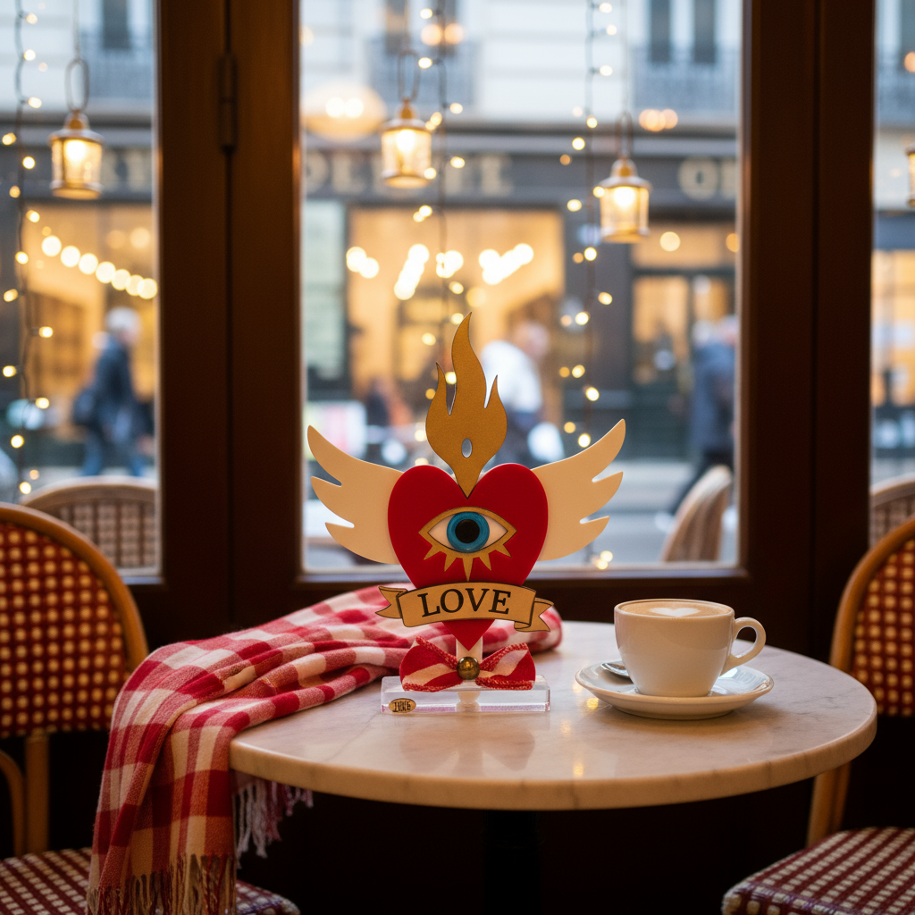 Δώσε αγάπη και θετική ενέργεια στις γιορτές με το χειροποίητο επιτραπέζιο γούρι «Christmas Pop Love Heart»! Φτιαγμένο εξ ολοκλήρου από plexiglass, σε σχήμα καρδιάς με φτερά, φλόγα και μάτι προστασίας στο κέντρο, φέρει banner με τη λέξη LOVE.