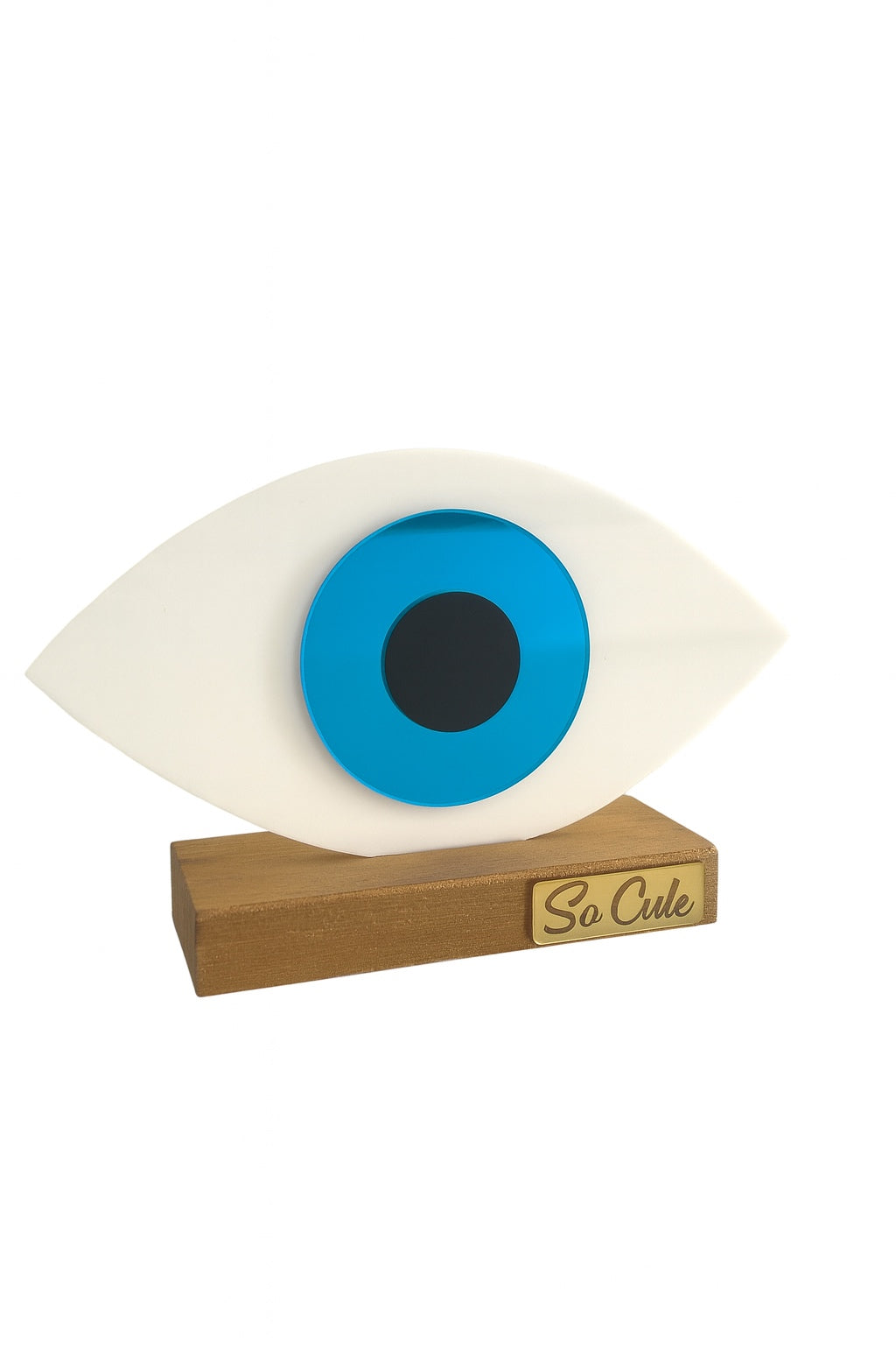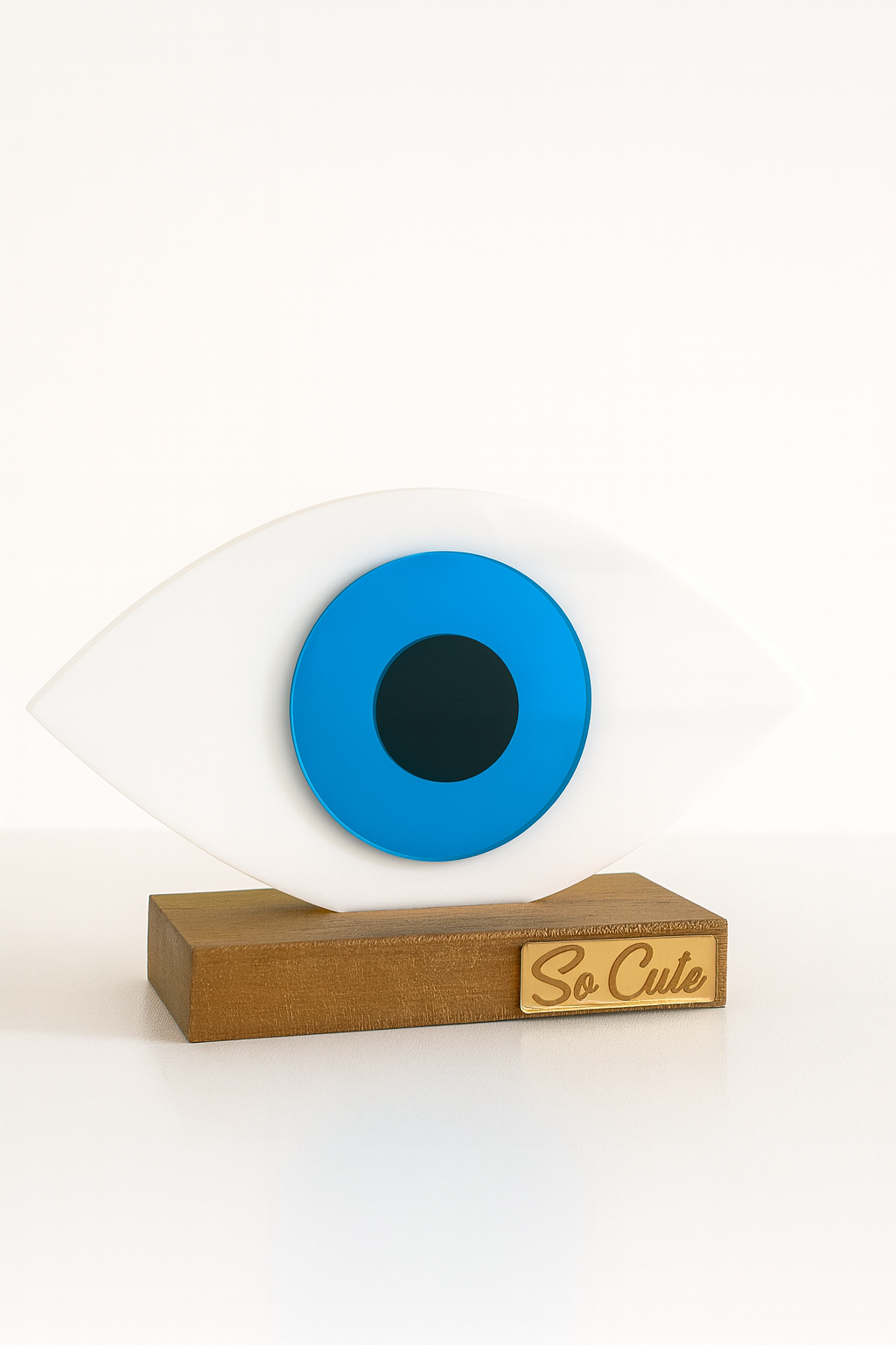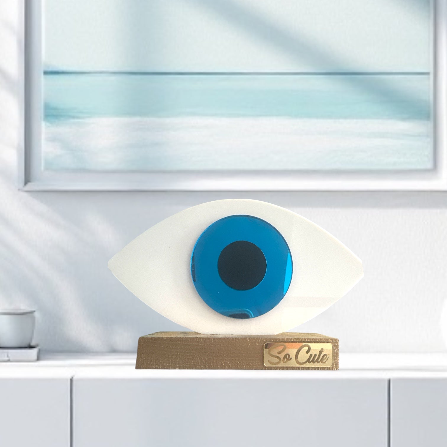 Ένα εντυπωσιακό χειροποίητο γούρι μάτι από plexiglass σε οβάλ σχήμα, με λαμπερή λεπτομέρεια σε μπλε γκλίτερ plexiglass και ξύλινη επιτραπέζια βάση.