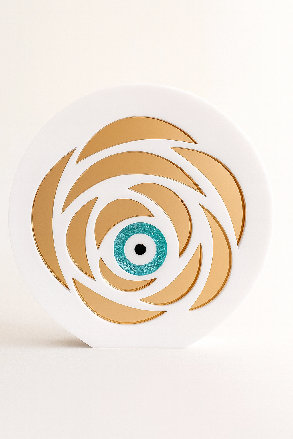 Ένα ιδιαίτερο χειροποίητο επιτραπέζιο γούρι που συνδυάζει την προστασία του ματιού με ένα floral–inspired σχέδιο. Το σώμα είναι από plexiglass καθρέφτη (λευκό ή μαύρο), στολισμένο με χρυσά πέταλα που δημιουργούν ένα εντυπωσιακό μοτίβο γύρω από το μάτι.