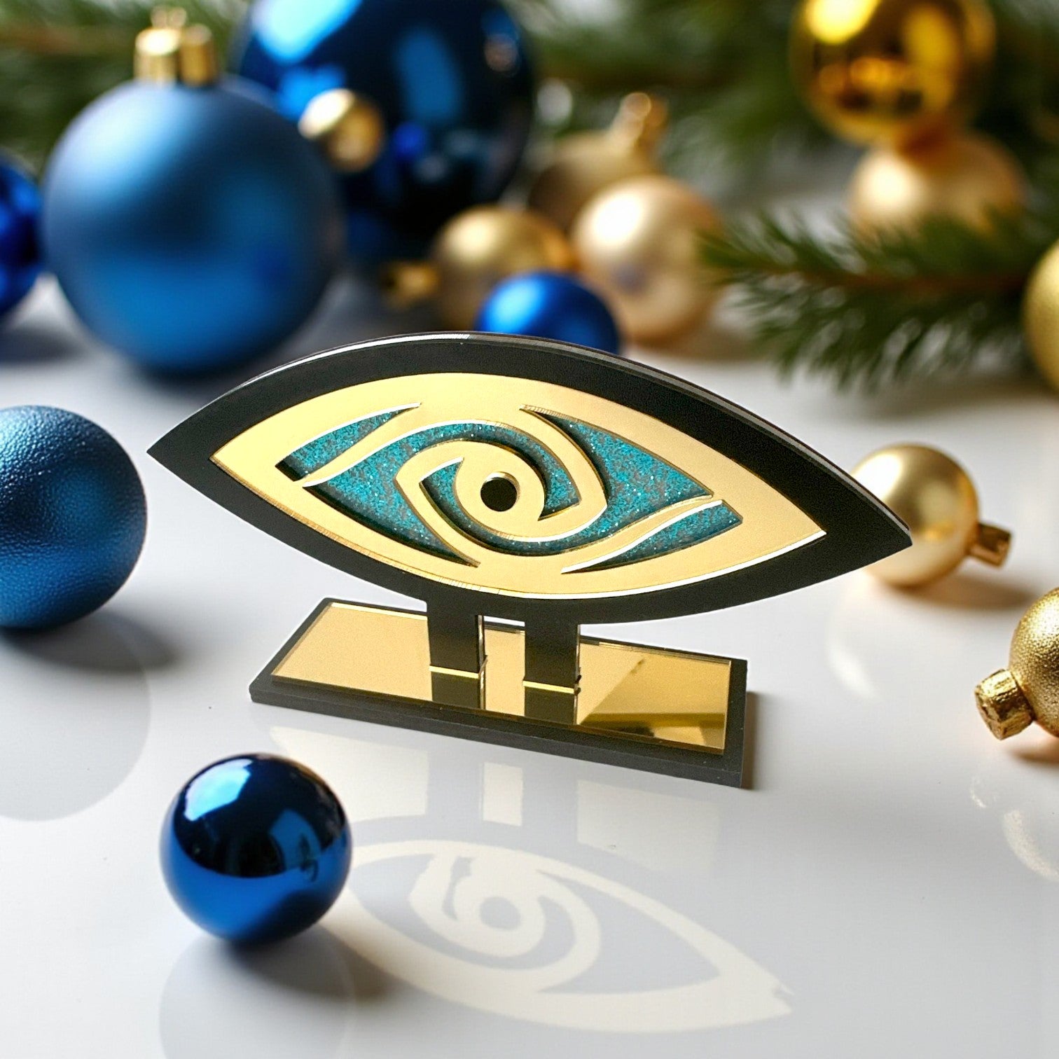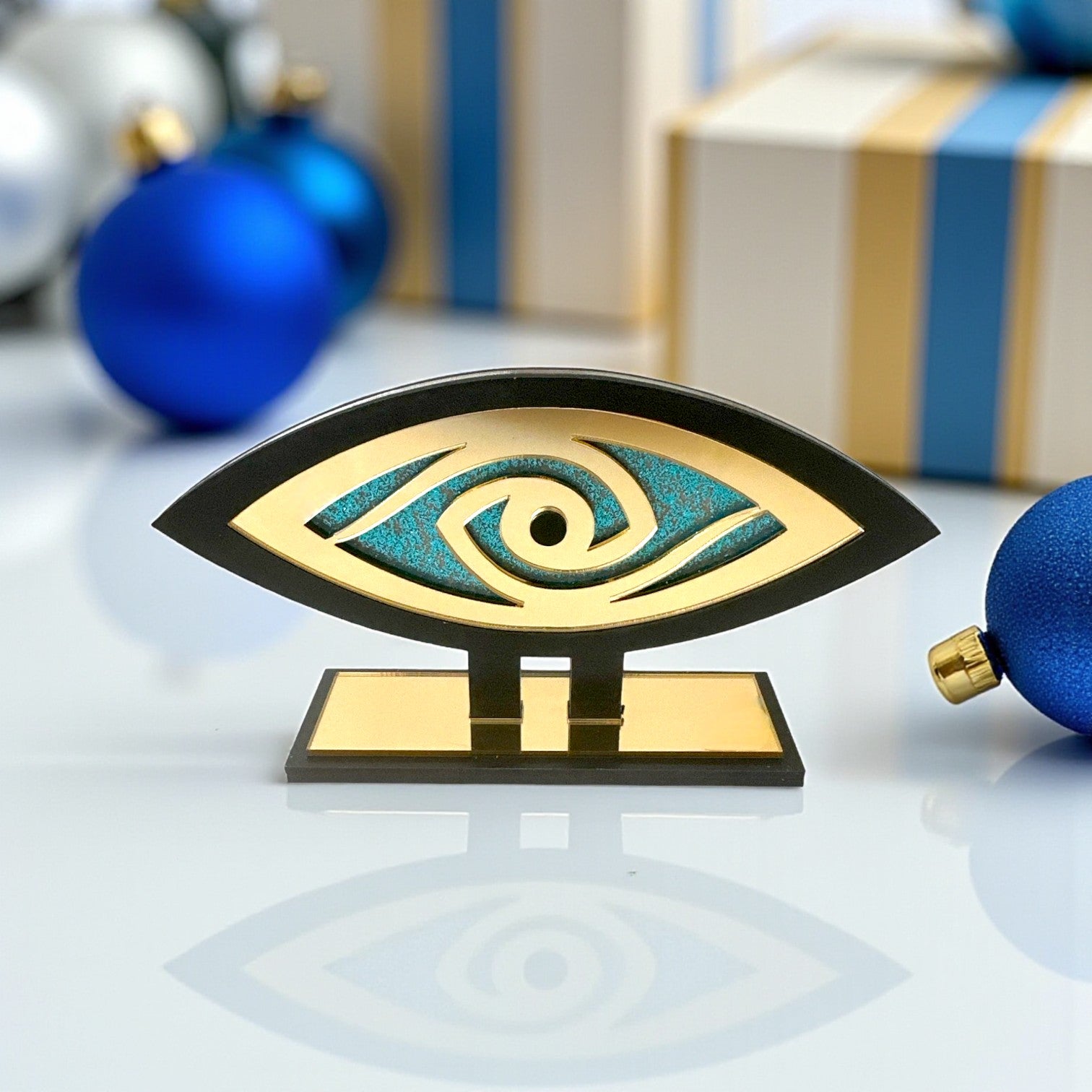 Ένα εντυπωσιακό χειροποίητο γούρι μάτι από plexiglass, με σπειροειδές σχέδιο σε χρυσό καθρέφτη και εσωτερική επένδυση από λαμπερά στρας. Το ιδιαίτερο design του συμβολίζει προστασία και θετική ενέργεια, ενώ η πολυτελής λάμψη του το καθιστά ιδανικό για δώρο που ξεχωρίζει.