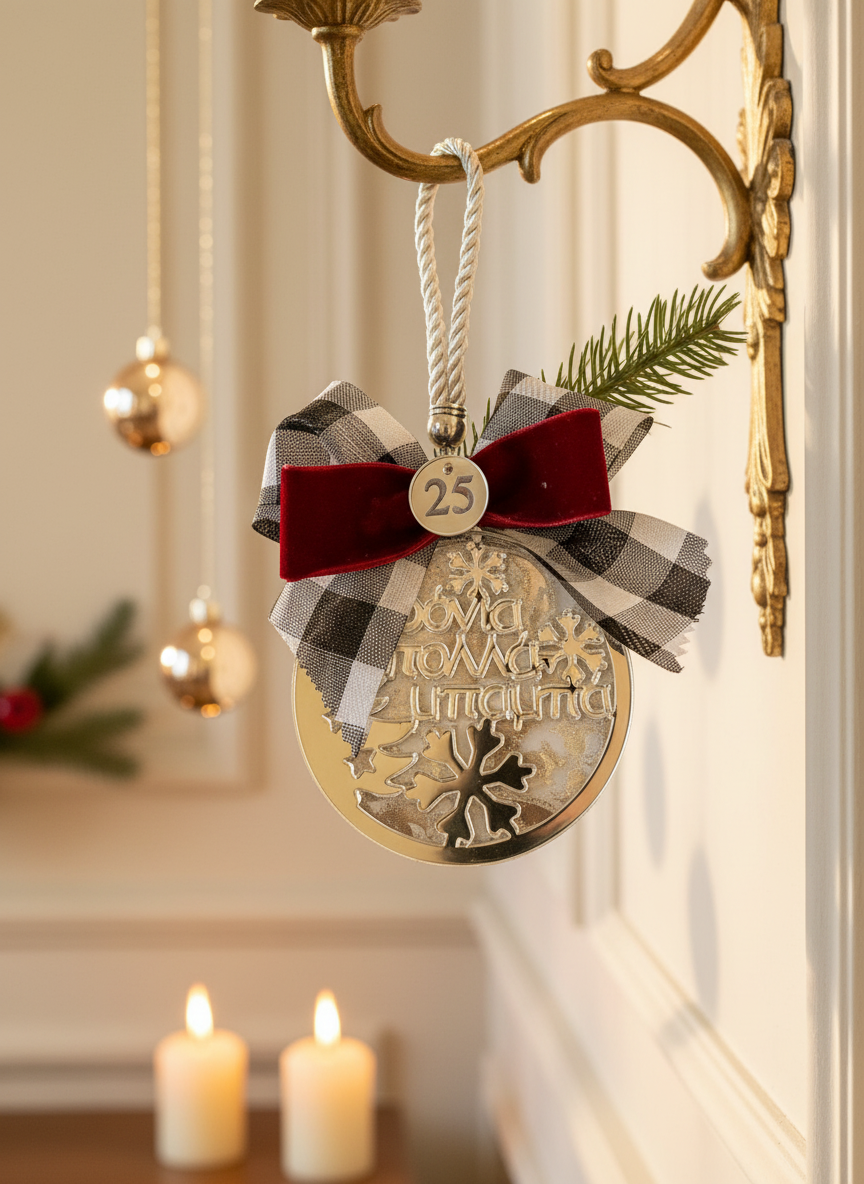 Χειροποίητο κρεμαστό γούρι με σατέν κορδόνι, διπλό φιόγκος με καρό και βελούδινη κορδέλα, μοτίφ με χάραξη 26 και στοχείο από πλεξιγκλάς ασημί καθρέφτη με χάραξη Χρόνια πολλά Μπαμπά.
