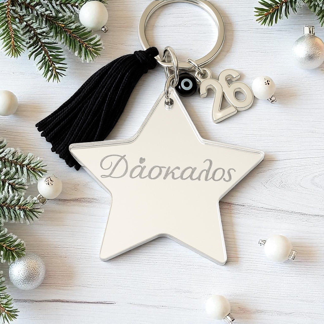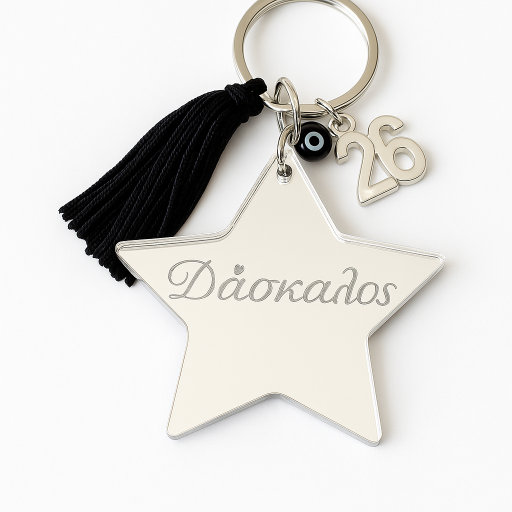 Ένα ξεχωριστό γούρι–μπρελόκ για τον δάσκαλο! Χειροποίητο αστέρι από ασημί πλεξιγκλάς καθρέφτη με χάραξη «Δάσκαλος», διακοσμημένο με φούντα, ματάκι και μεταλλικό charm 26. Ένα δώρο που συνδυάζει στυλ, συμβολισμό και ευγνωμοσύνη.