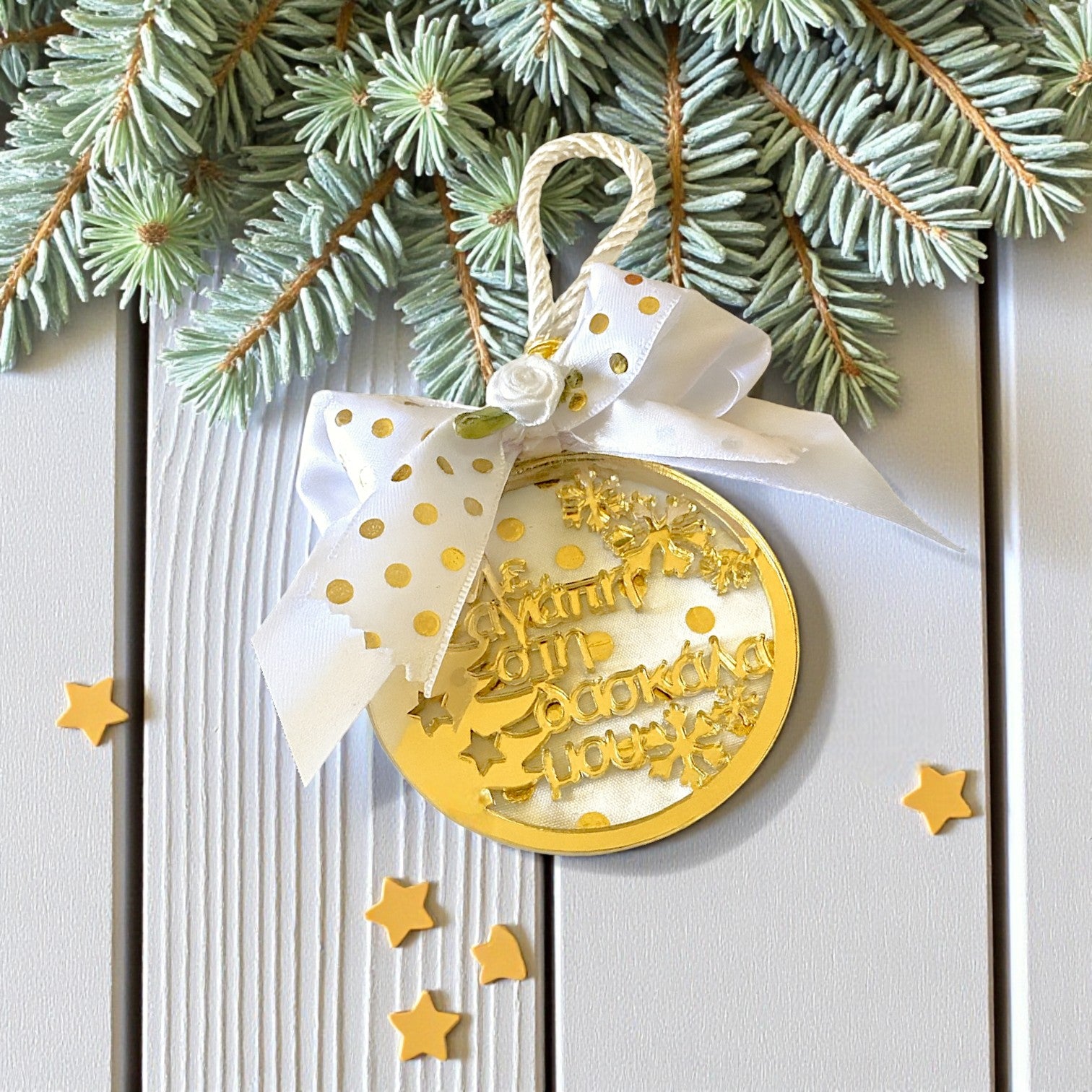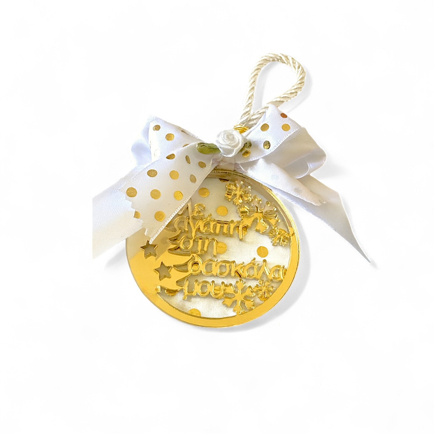 Το χειροποίητο αυτό κρεμαστό γούρι διαθέτει σατέν κορδόνι, φιόγκους από σατέν κορδέλες, λευκό τριανταφυλλάκι και εντυπωσιακό στοιχείο από χρυσό πλεξιγκλάς καθρέφτη με χάραξη “Με αγάπη στη Δασκάλα μου”. Ένα ξεχωριστό δώρο για τη γιορτινή περίοδο που θα συγκινήσει κάθε εκπαιδευτικό.