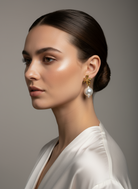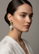 Χειροποίητα σκουλαρίκια με επίχρυσο λουλούδι με ατσάλινο καρφί και μεγάλη κρεμαστή πέρλα.