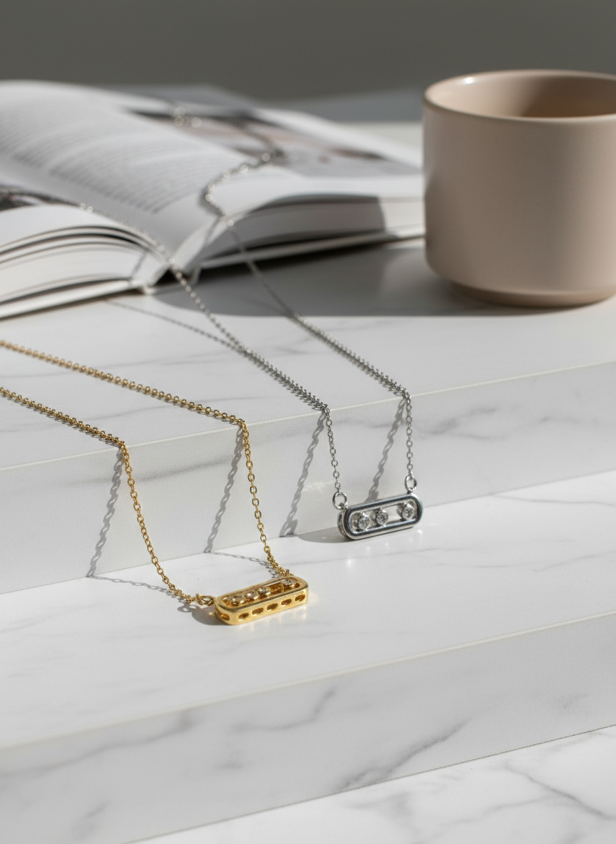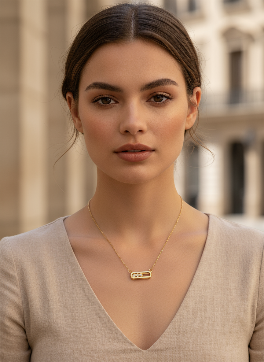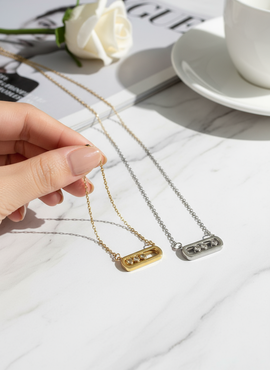 Minimal αλλά με διακριτική λάμψη, το “Trio Spark” είναι το everyday κόσμημα που ταιριάζει με τα πάντα! Ατσάλινο λεπτεπίλεπτο κολιέ με κεντρικό ορθογώνιο στοιχείο και τρεις λαμπερές ζιργκόν πέτρες, διαθέσιμο σε χρυσό και ασημί. Η ιδανική επιλογή για layering, δώρο ή για να αναδείξεις τη λιτή πλευρά της κομψότητας.
