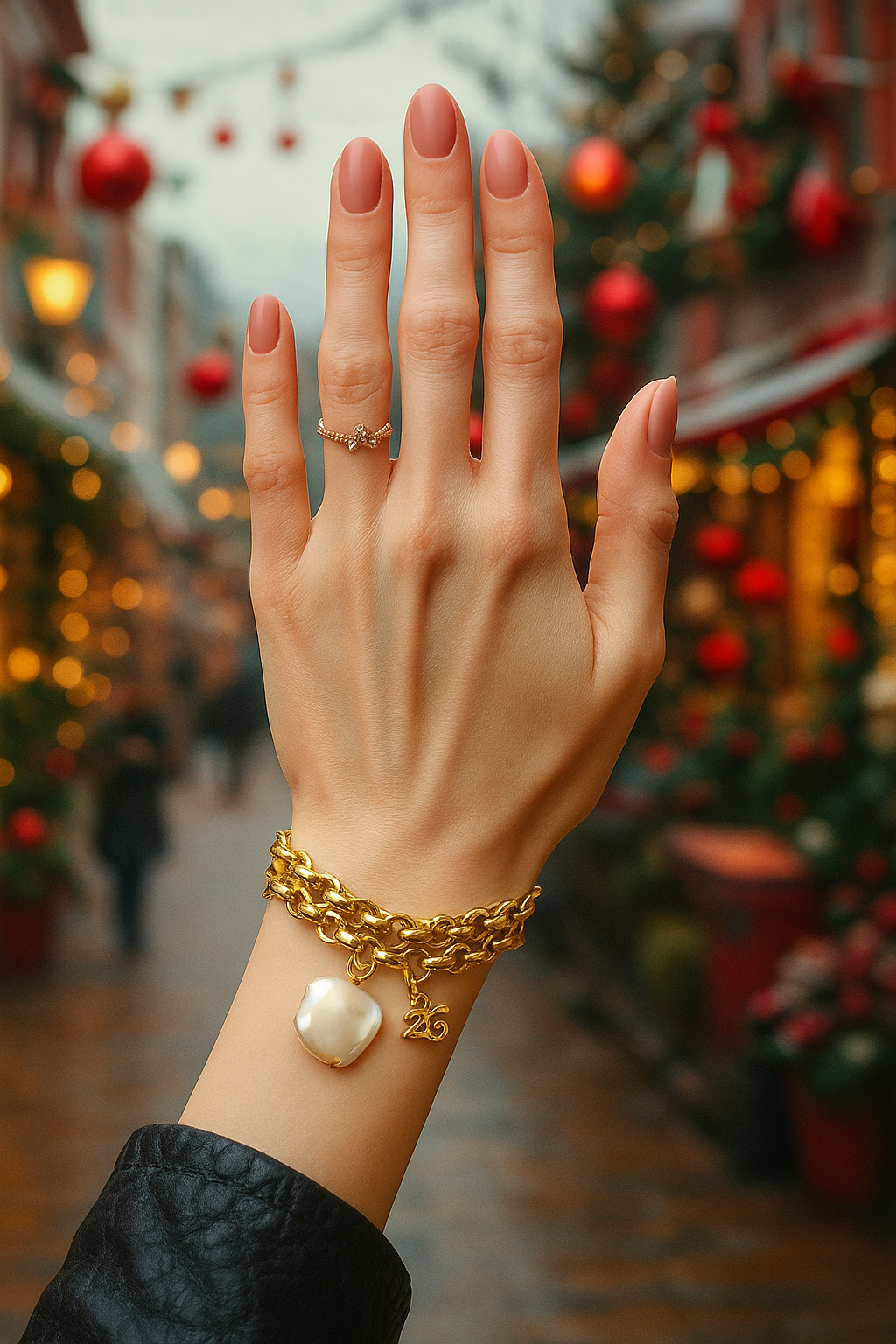 Η φαρδιά αλυσίδα από ατσάλι αγκαλιάζει τον καρπό με δυναμικό στυλ, ενώ το κρεμαστό μοτίφ πέρλας και το διακριτικό charm 26 προσθέτουν λάμψη και festive χαρακτήρα.