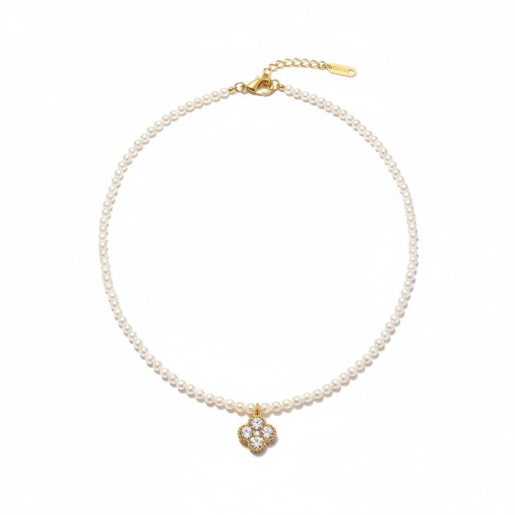 Κομψό, φωτεινό και so elegant! Το Clover Glow Necklace συνδυάζει τη διαχρονική λάμψη της πέρλας με το μοτίφ τύπου clover διακοσμημένο με ζιργκόν, δημιουργώντας ένα κόσμημα που αποπνέει τύχη, φινέτσα και θηλυκότητα.