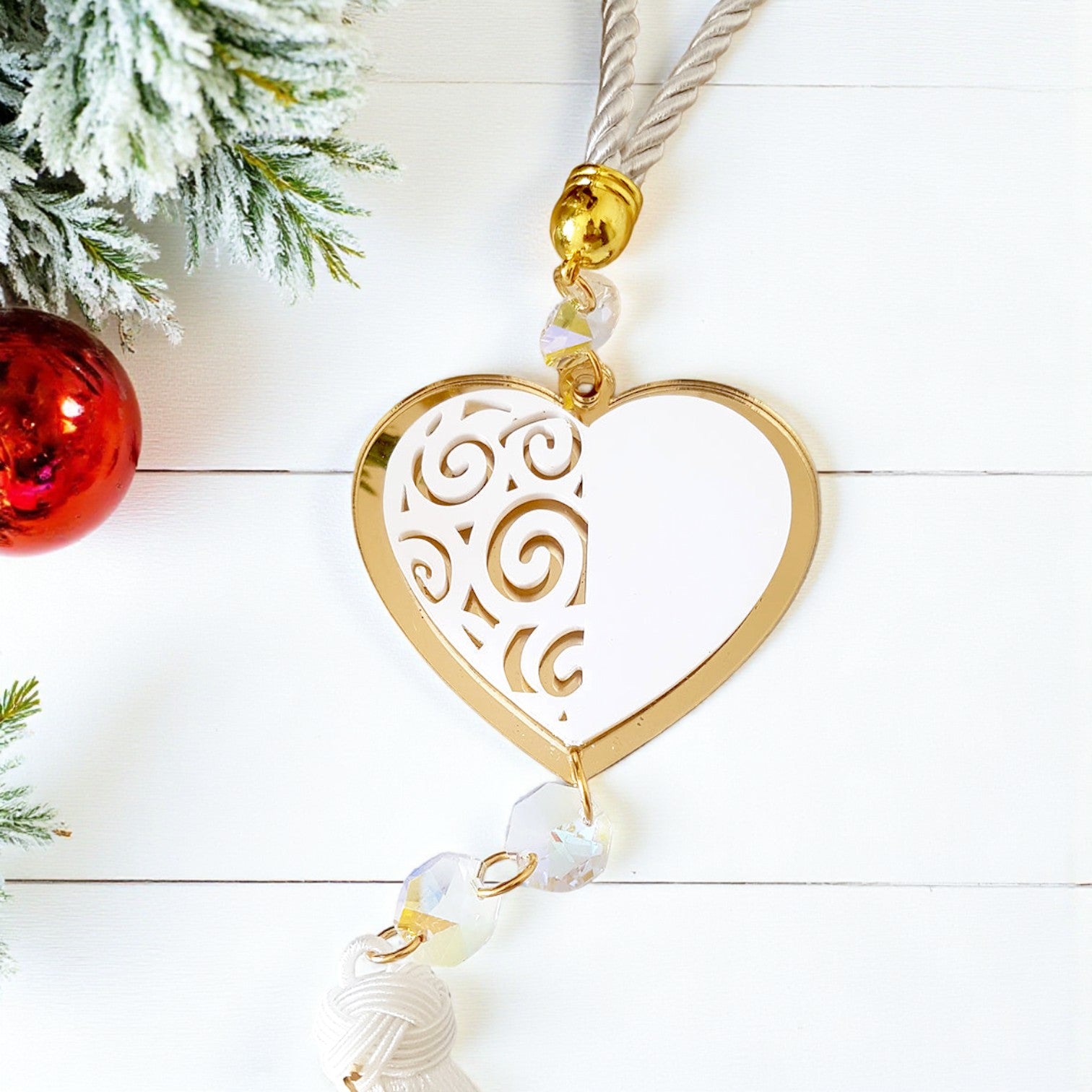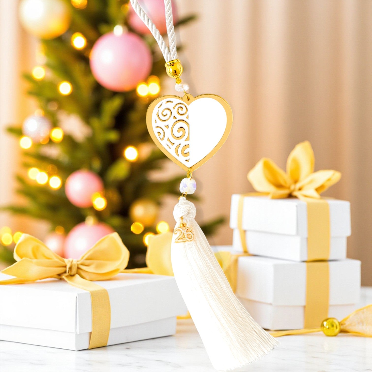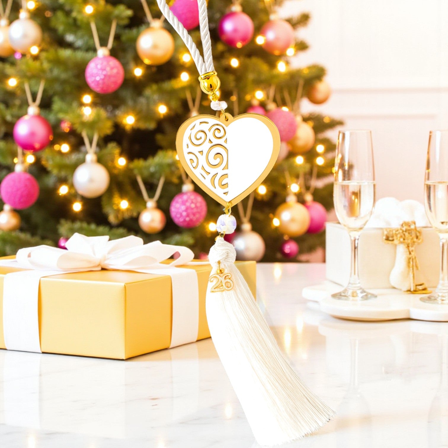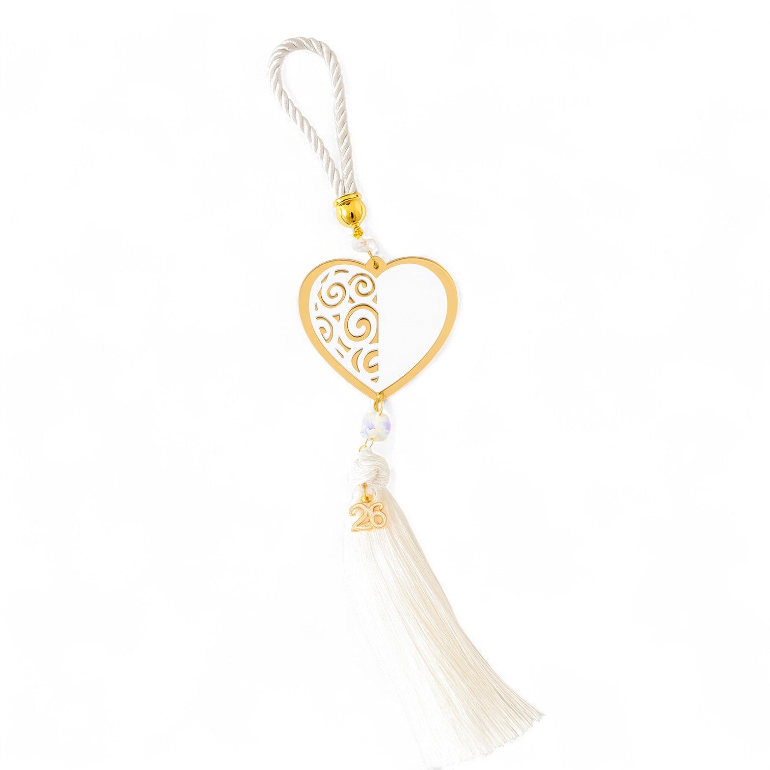 Χειροποίητο κρεμαστό γούρι με θηλειά από σατέν κορδόνι, διάφανα κρύσταλλα και εντυπωσιακή πλούσια φούντα. Το κεντρικό στοιχείο είναι μια καρδιά από λευκό πλεξιγκλάς με διάτρητα σχέδια, τοποθετημένη πάνω σε βάση από χρυσό πλεξιγκλάς καθρέφτη, που της χαρίζει ιδιαίτερη πολυτέλεια. Συνοδεύεται από μεταλλικό μοτίφ “26”.