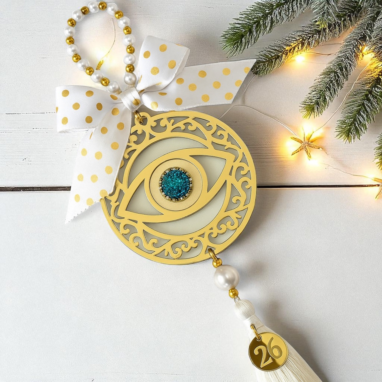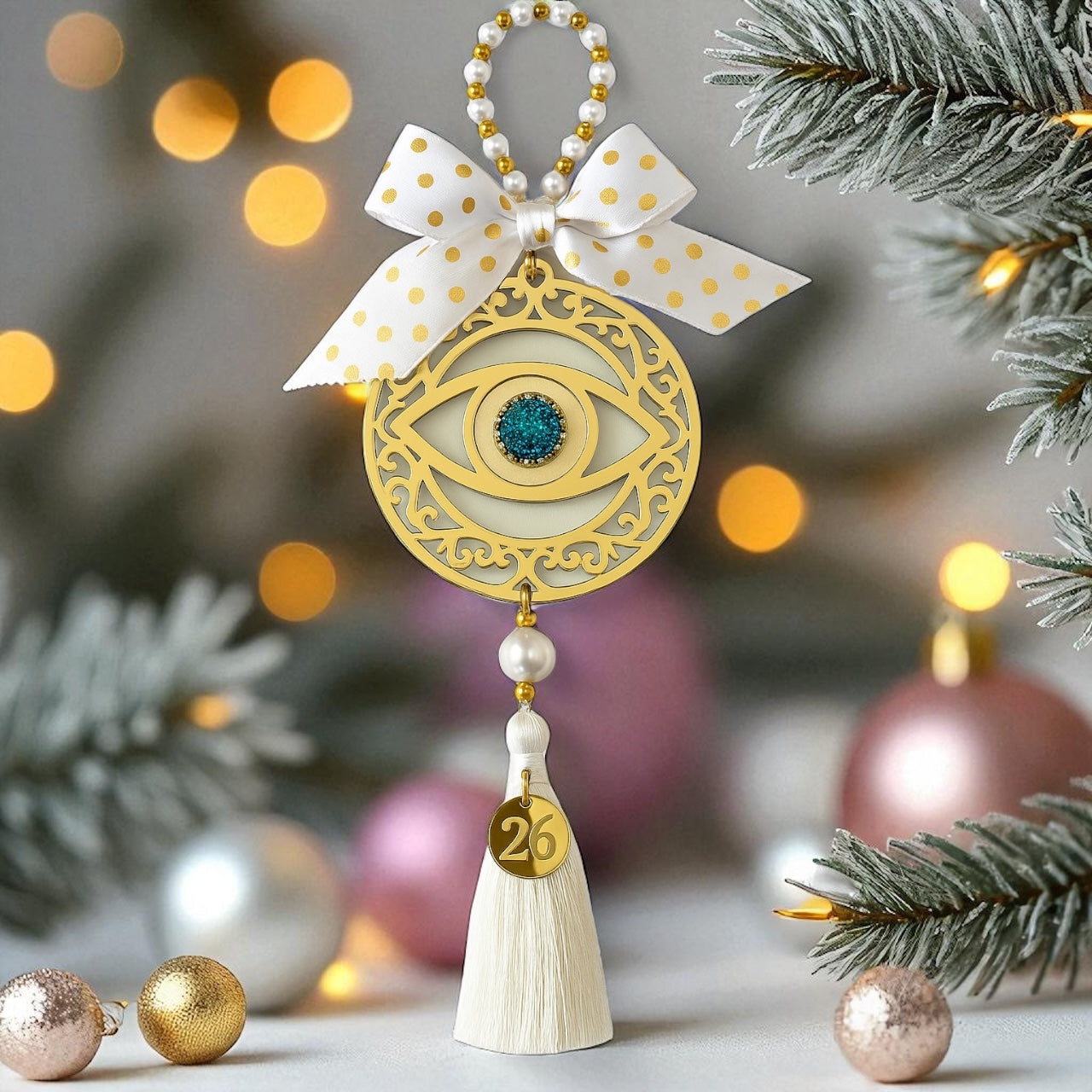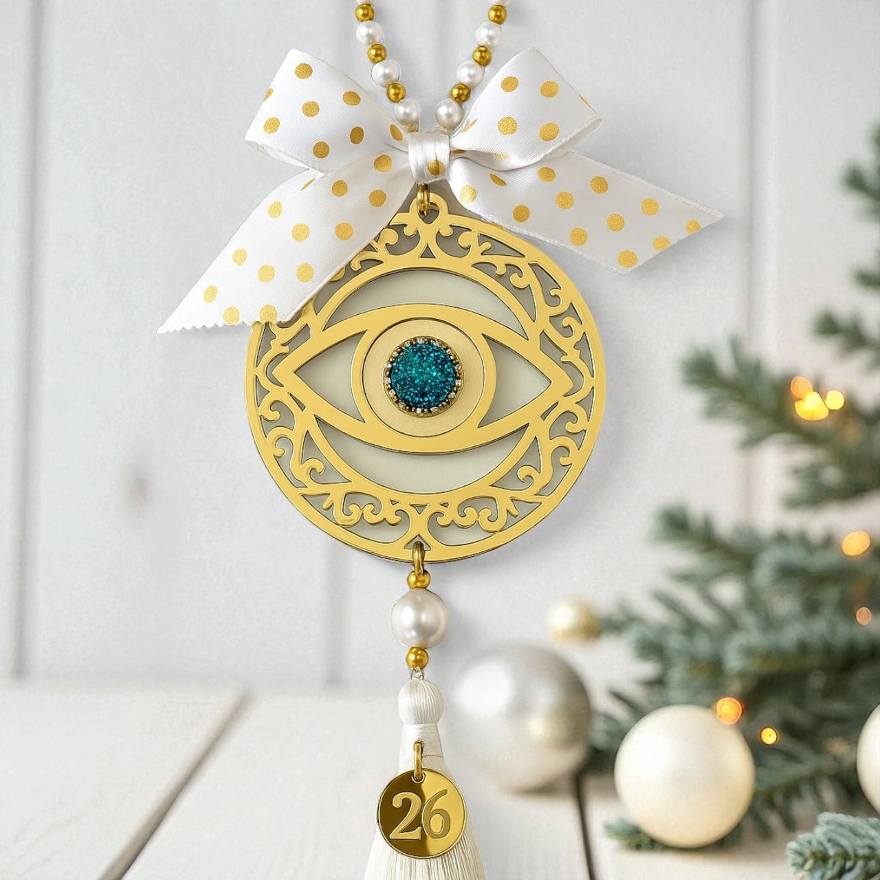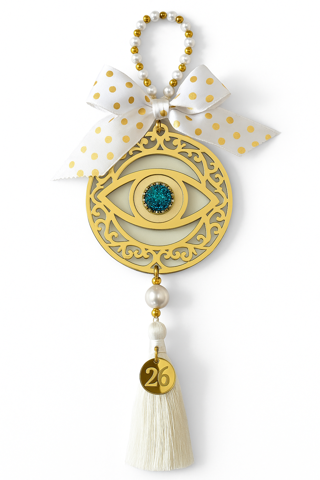 Το μοτίφ μάτι στο κέντρο συμβολίζει την προστασία και τη θετική ενέργεια, ενώ το charm 26 και η πλούσια φούντα ολοκληρώνουν το glamorous αποτέλεσμα.