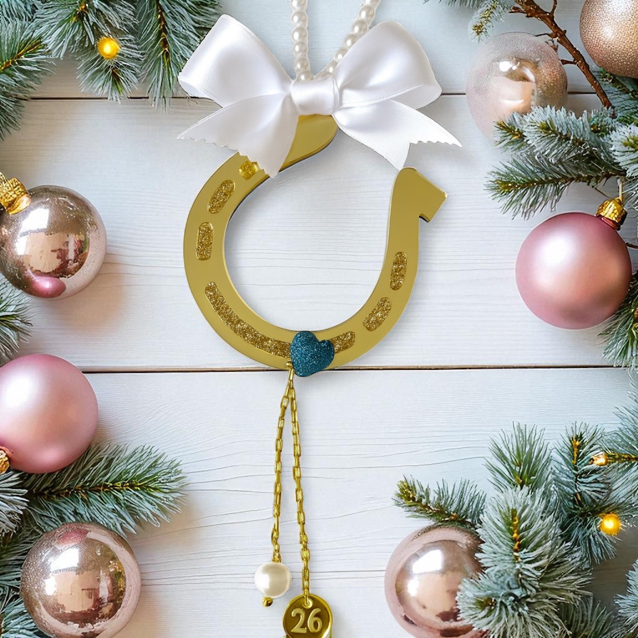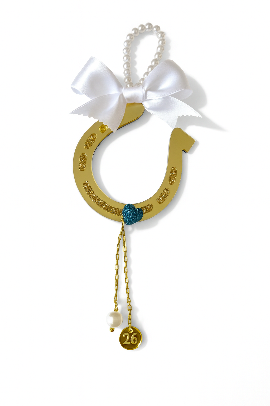 Φτιαγμένο από χρυσό plexiglass καθρέφτη με λεπτομέρειες σε glitter, στολισμένο με σατέν λευκό φιόγκο, αλυσίδα με μαργαριτάρι και μοτίφ 26, και καρδιά με γκλίτερ που χαρίζει sparkle. Η θηλιά του από πέρλες το κάνει να ξεχωρίζει ακόμα περισσότερο.