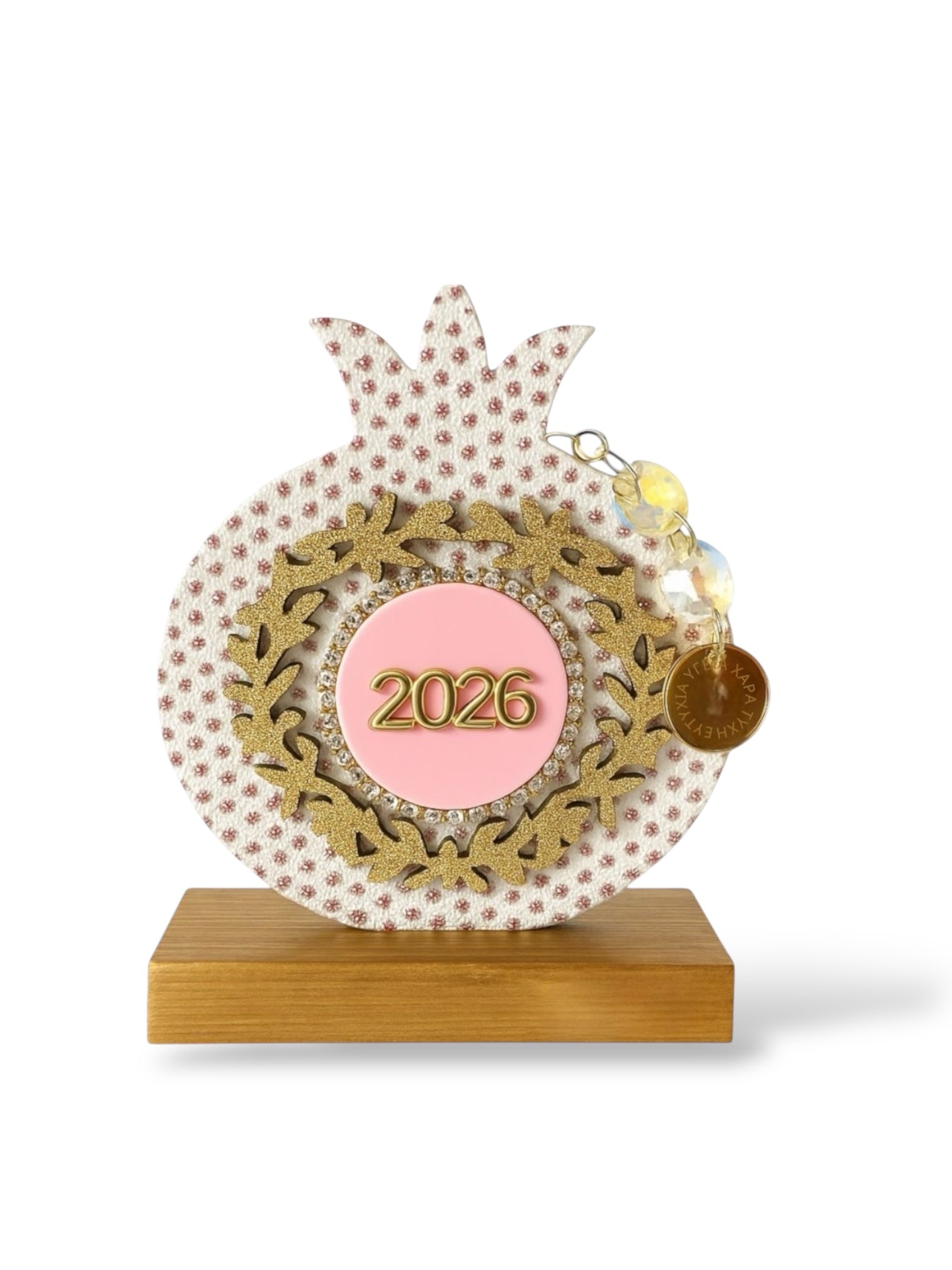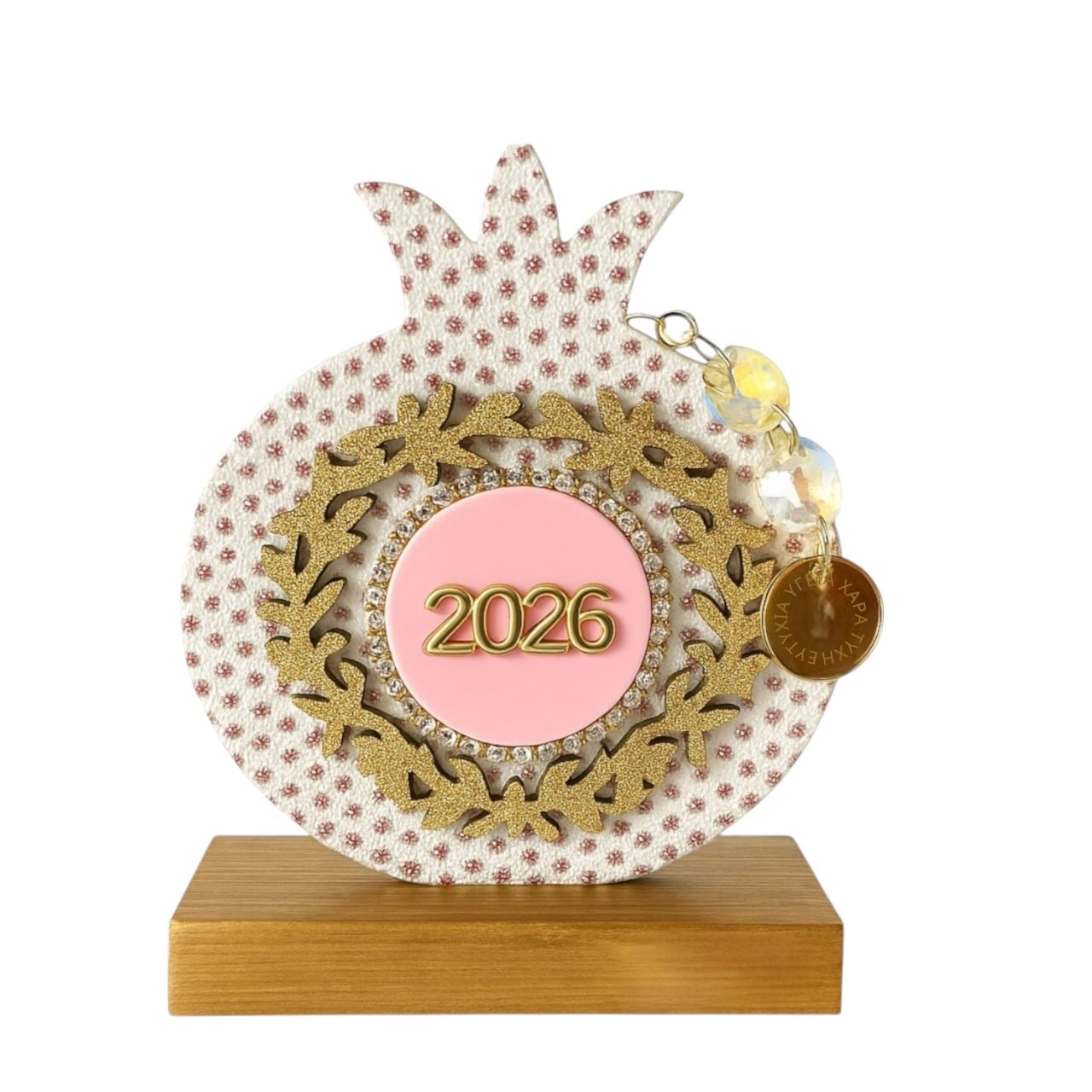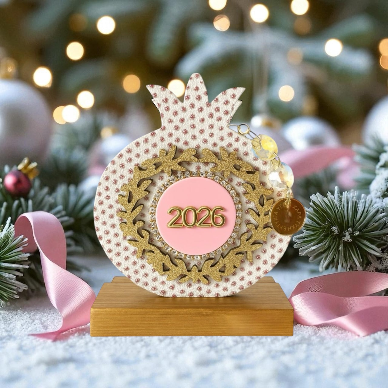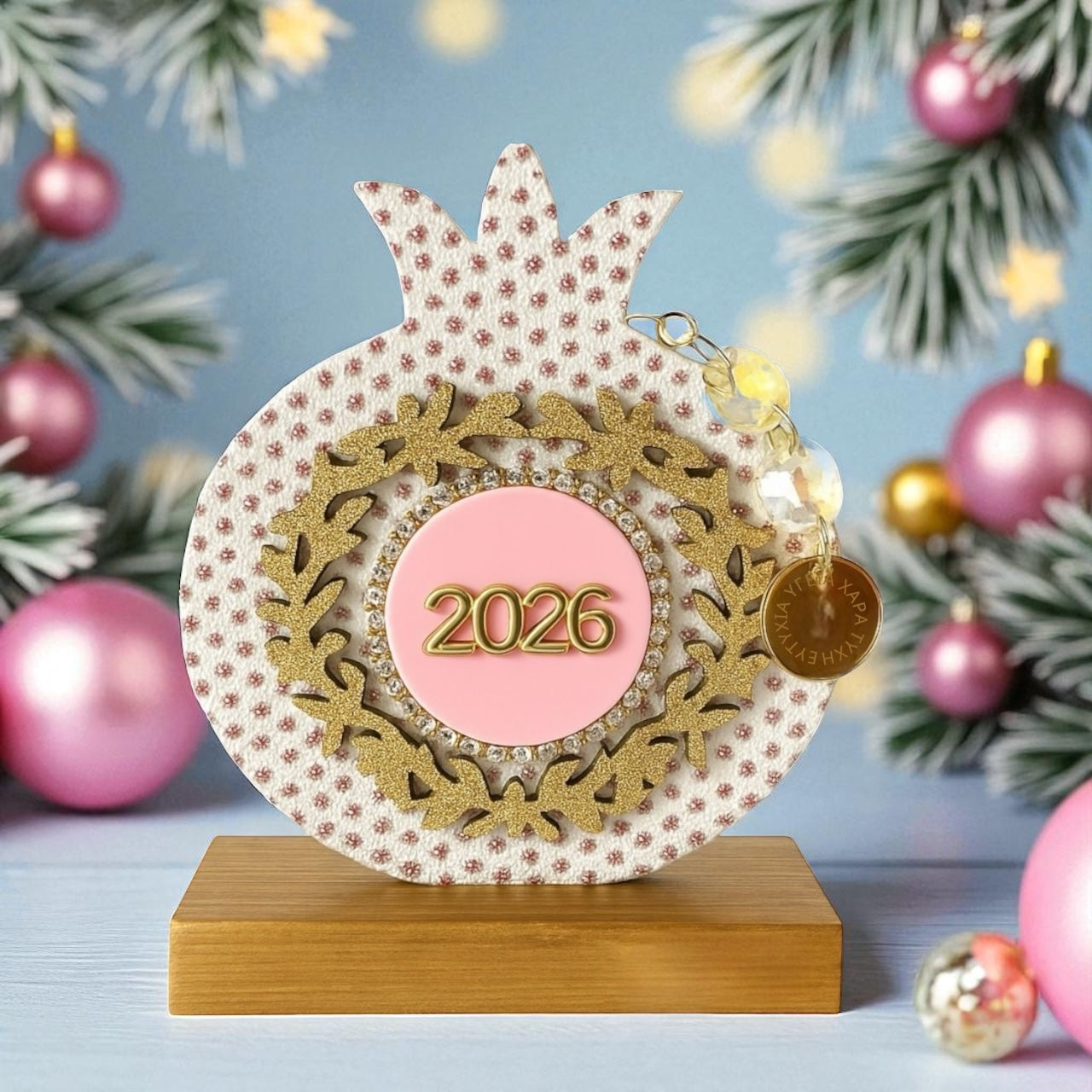 Η αλυσίδα από κρύσταλλα με charm ευχών ολοκληρώνει το festive design, ενώ η ξύλινη βάση βαμμένη στο χέρι χαρίζει πολυτέλεια και σταθερότητα.