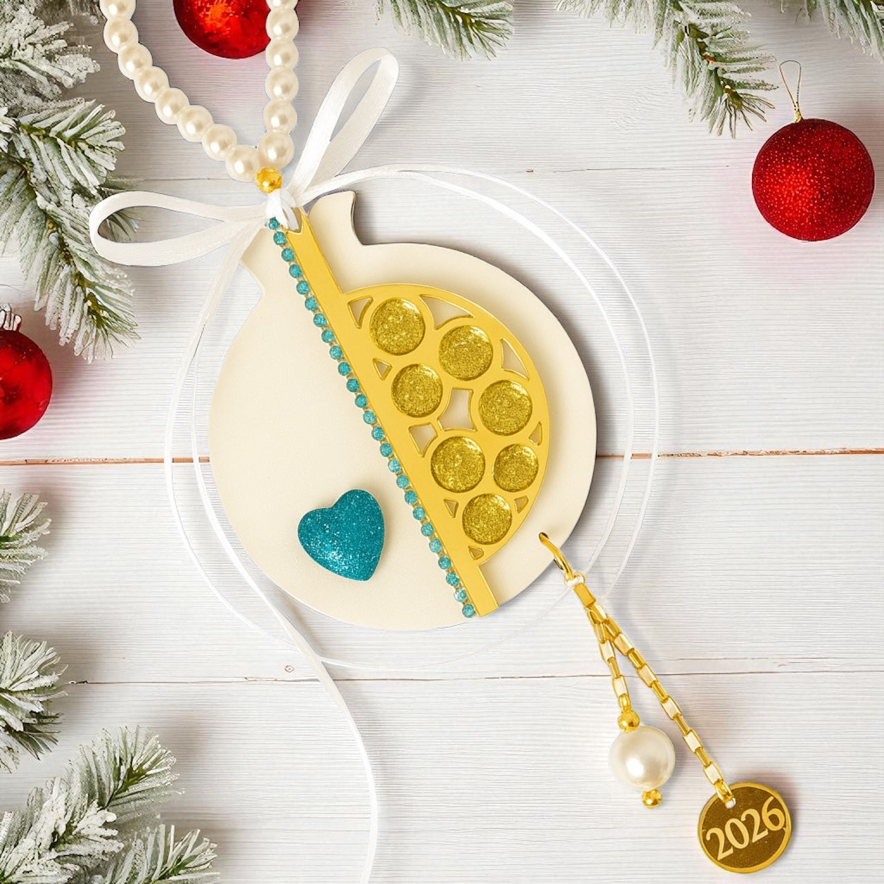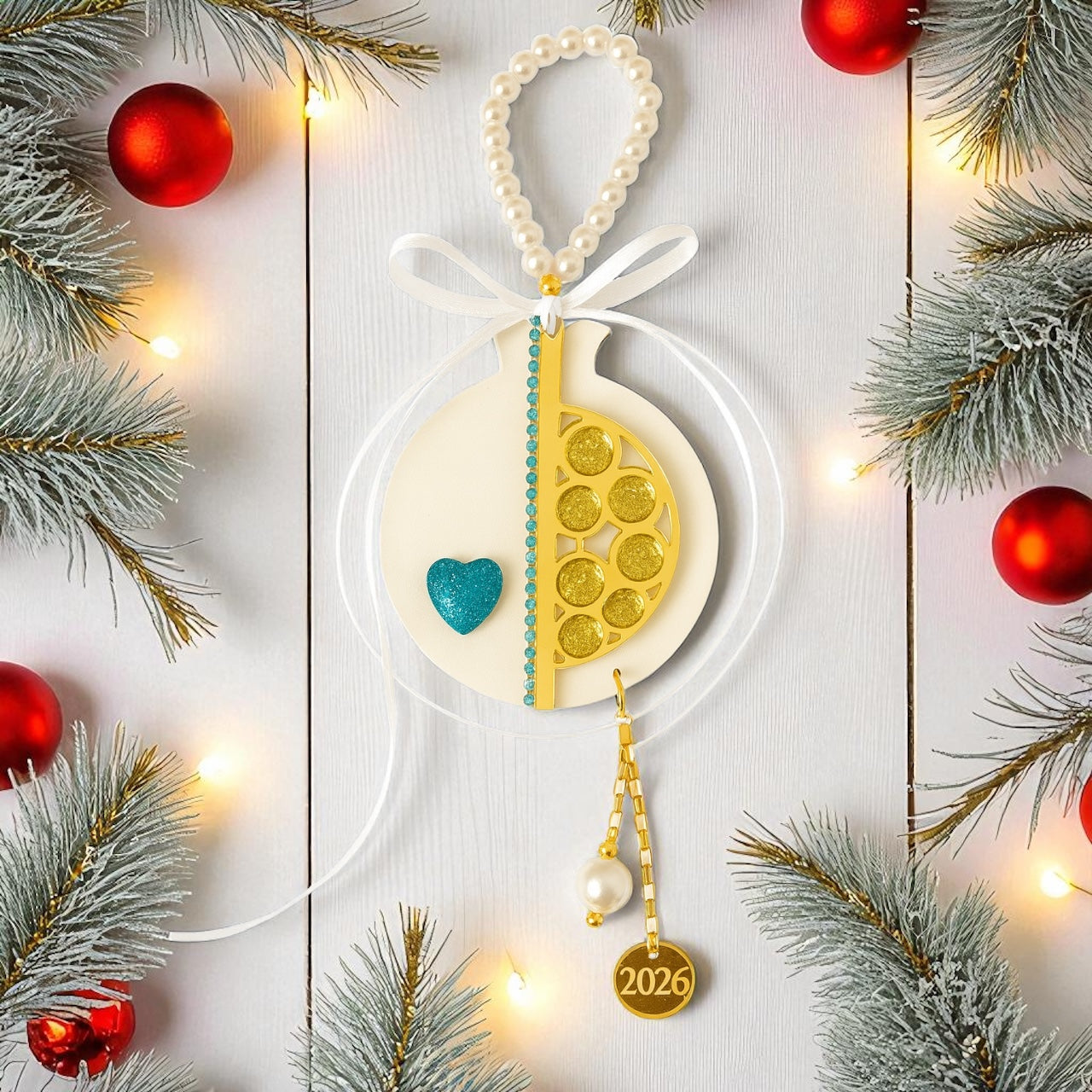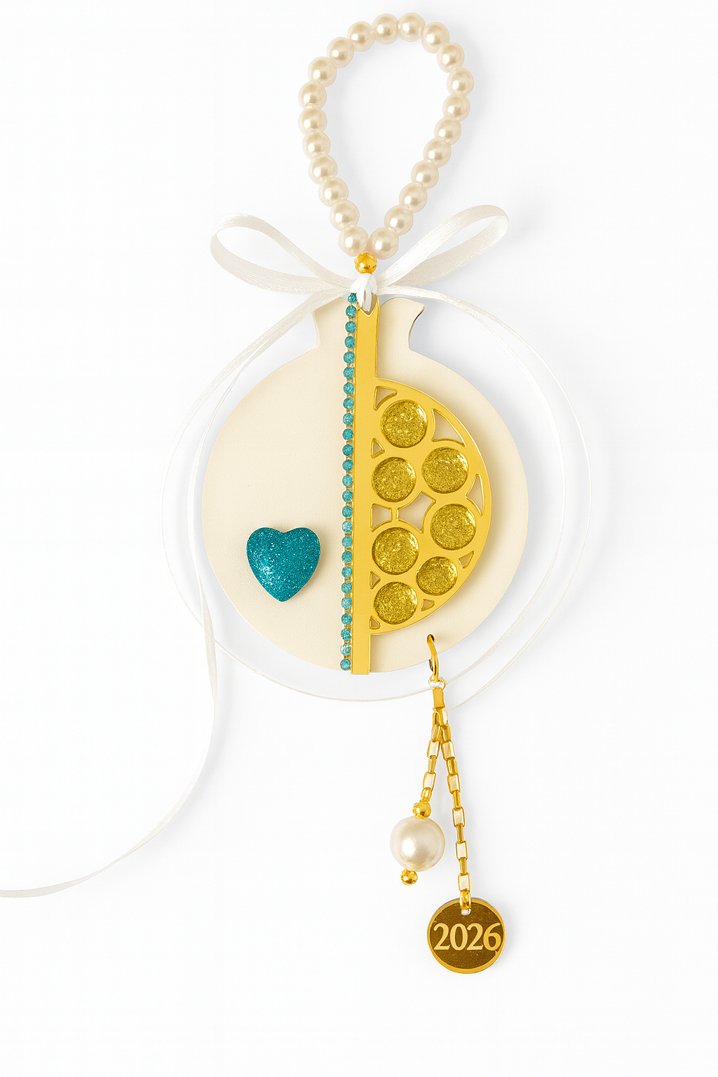 Ένα πολυτελές χειροποίητο ρόδι από πλεξιγκλάς, διακοσμημένο με χρυσό καθρέφτη, στρας, γκλίτερ καρδούλα, πέρλες και σατέν φιόγκους. Η ατσάλινη αλυσίδα του καταλήγει σε charm “26” και κρεμαστή πέρλα, ολοκληρώνοντας με κομψότητα το festive design.