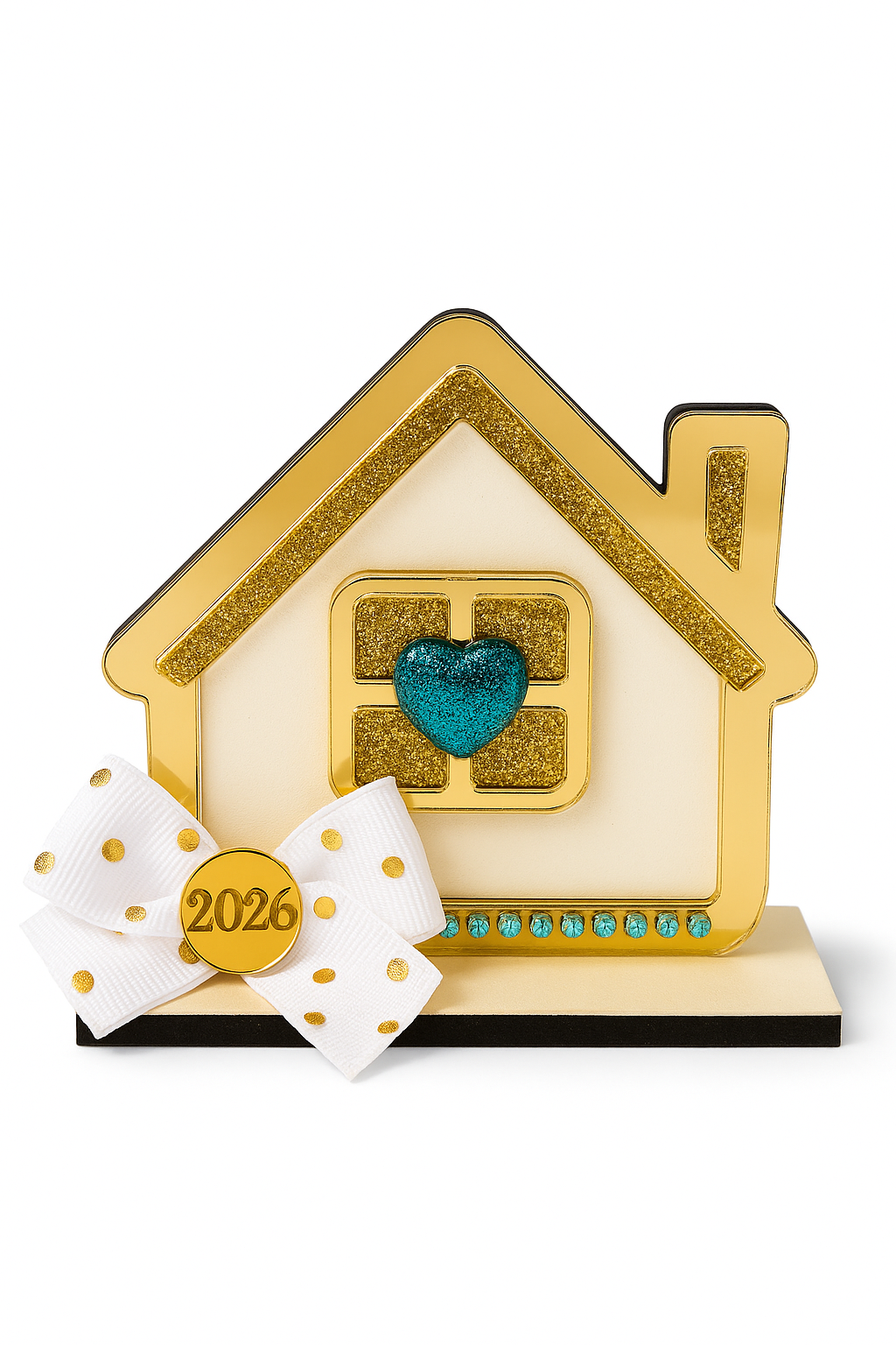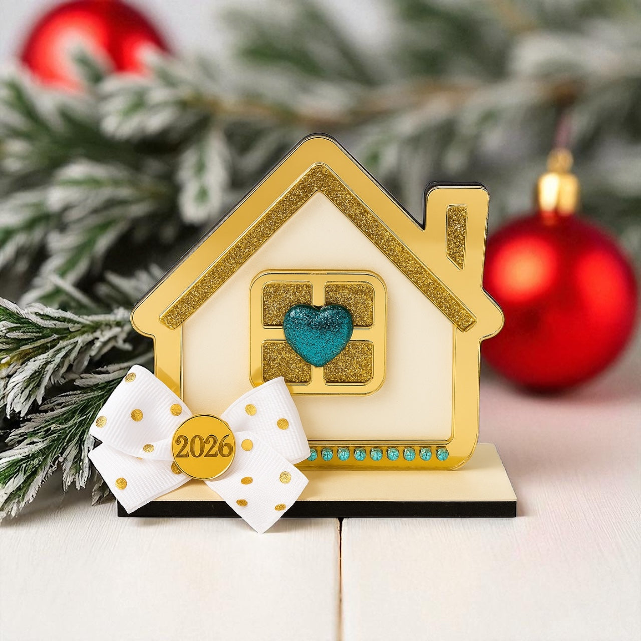 Το σπιτάκι της συλλογής Greek Wishes στολίζεται με περίγραμμα και παράθυρα από χρυσό plexiglass καθρέφτη, γκλίτερ καρδιά, παιχνιδιάρικο φιόγκο με πουά λεπτομέρειες και μοτίφ plexiglass. Η ξύλινη βάση είναι βαμμένη στο χέρι, δίνοντας στο γούρι μια αίσθηση πολυτέλειας και διαχρονικότητας.