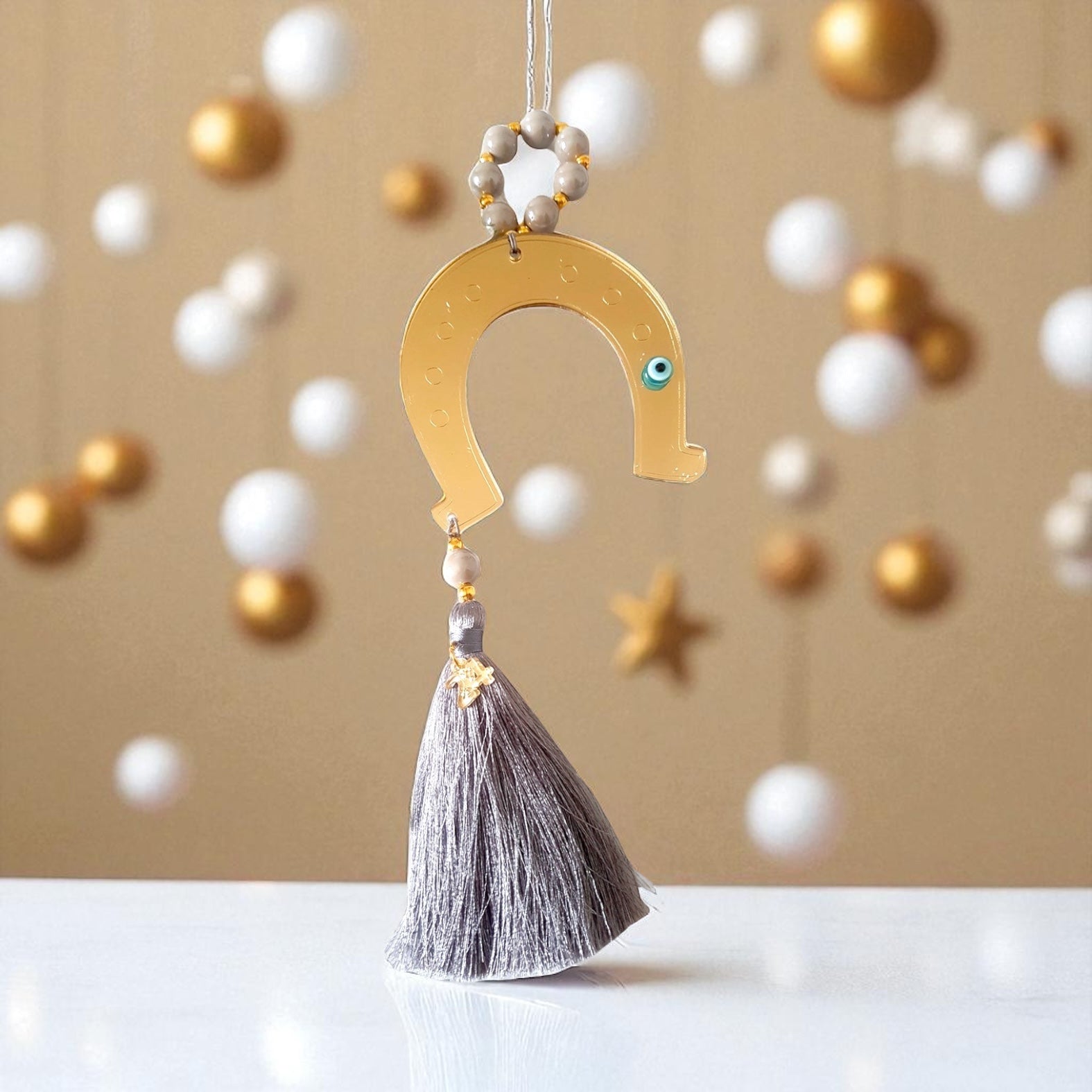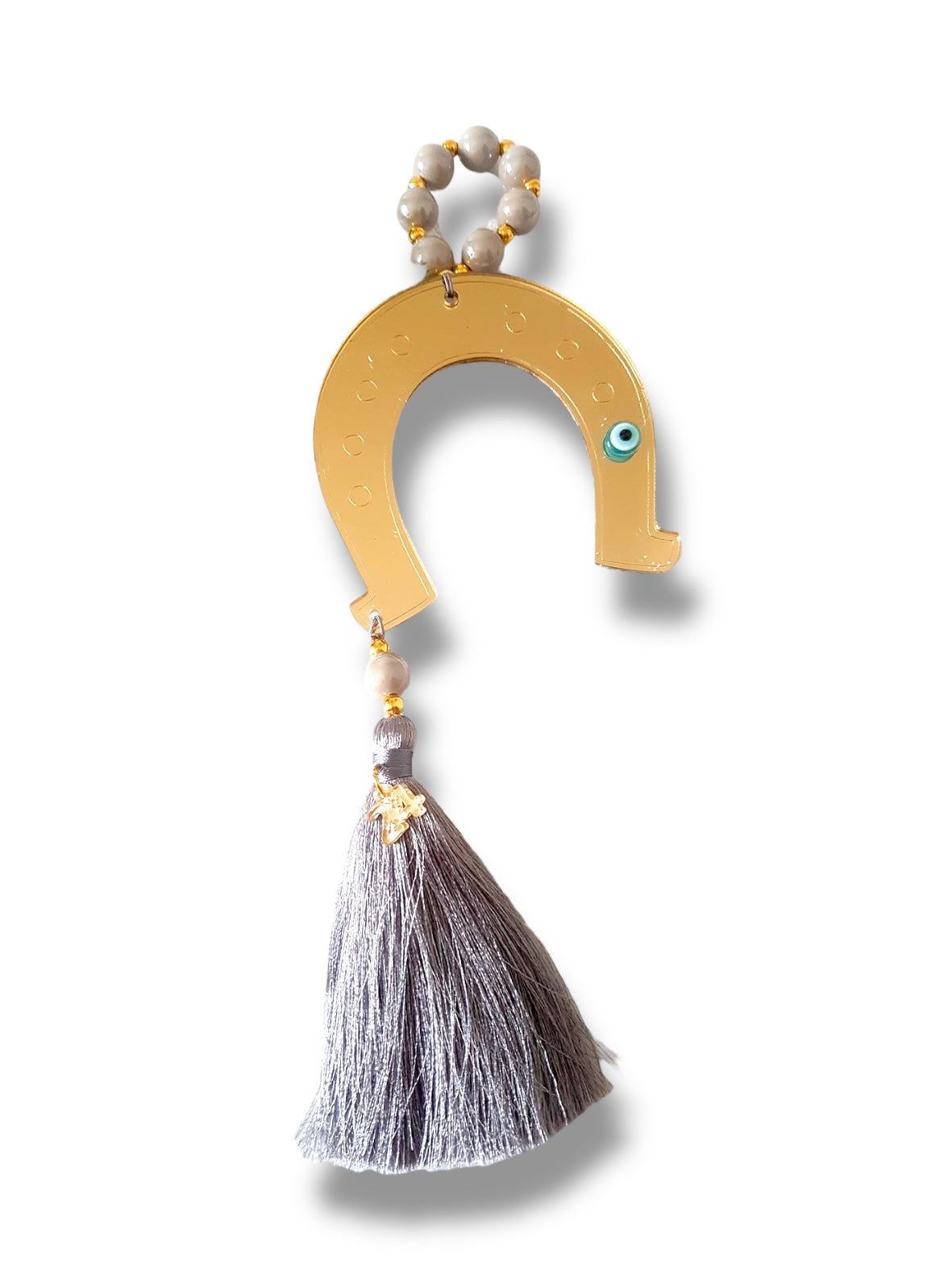 Χειροποίητο κρεμαστό γούρι με πέταλο από plexiglass χρυσό καθρέφτη, διακοσμημένο με ματάκι και εντυπωσιακή φούντα σε γκρι απόχρωση.