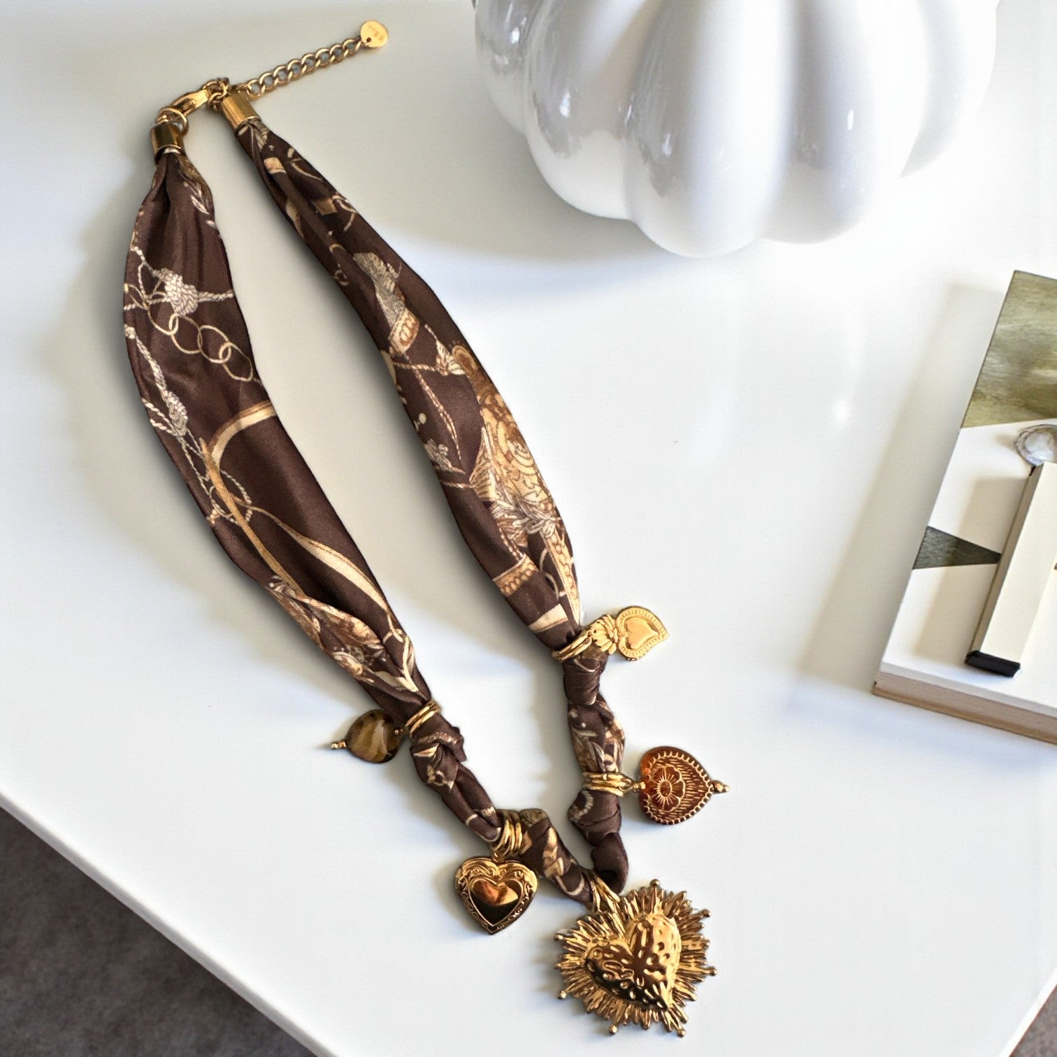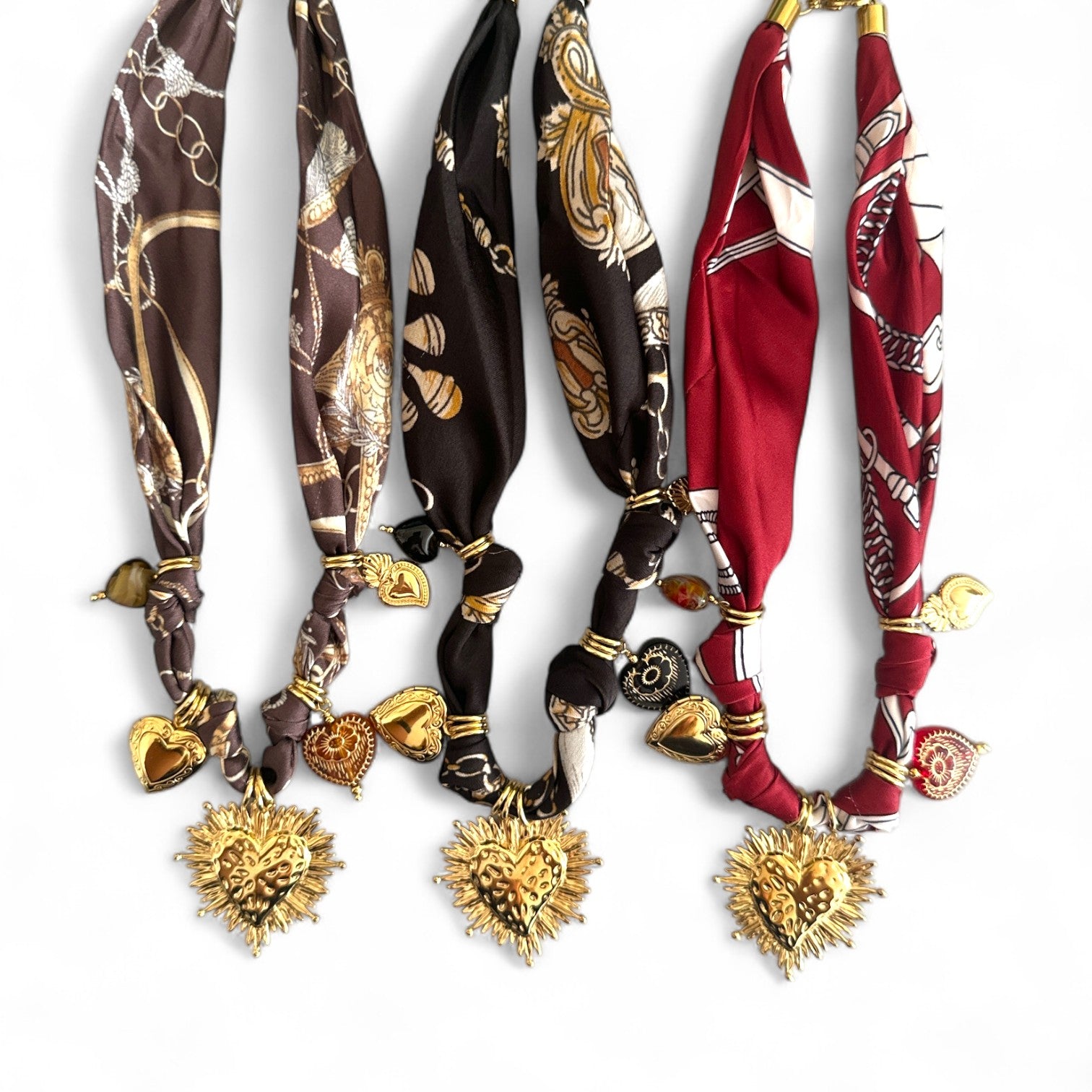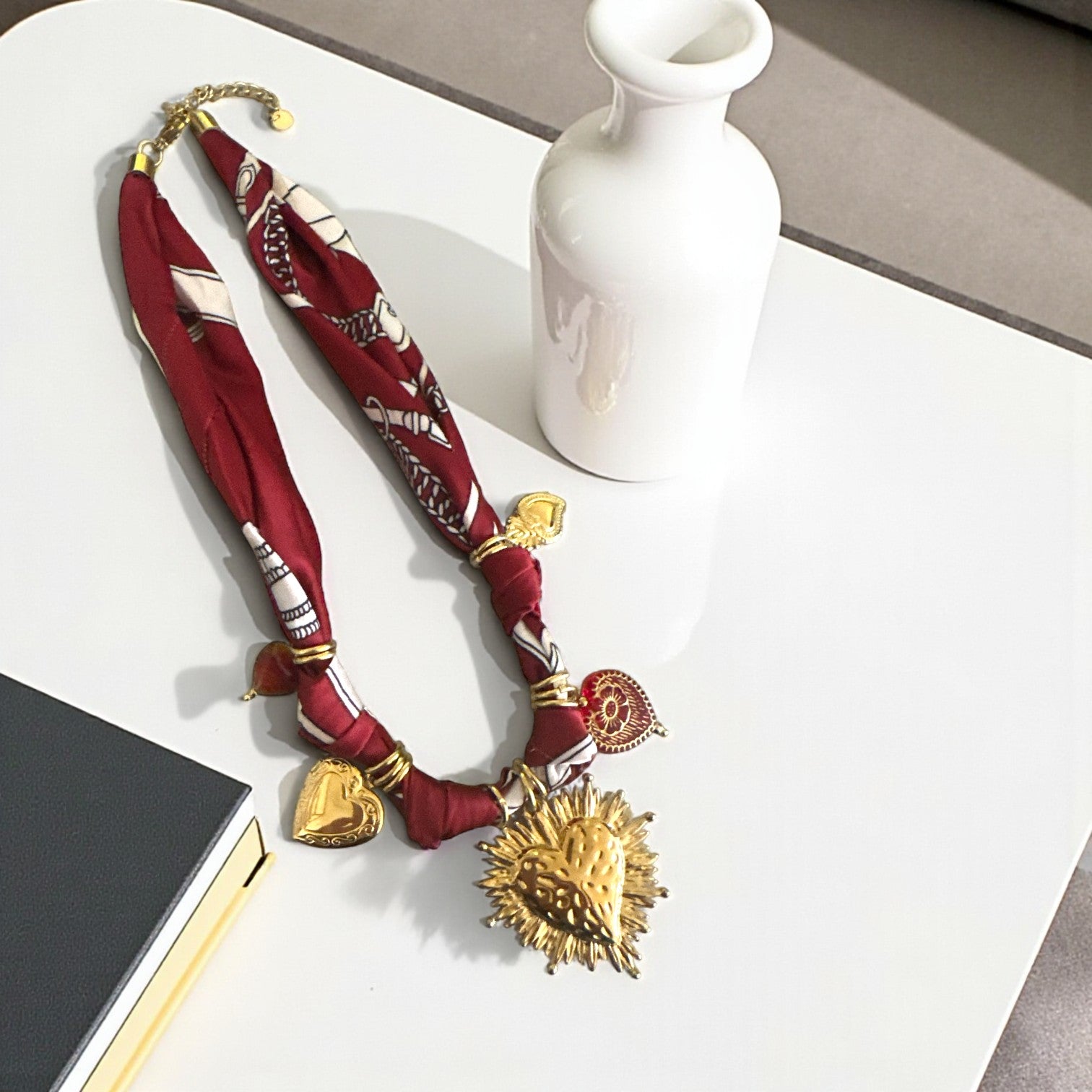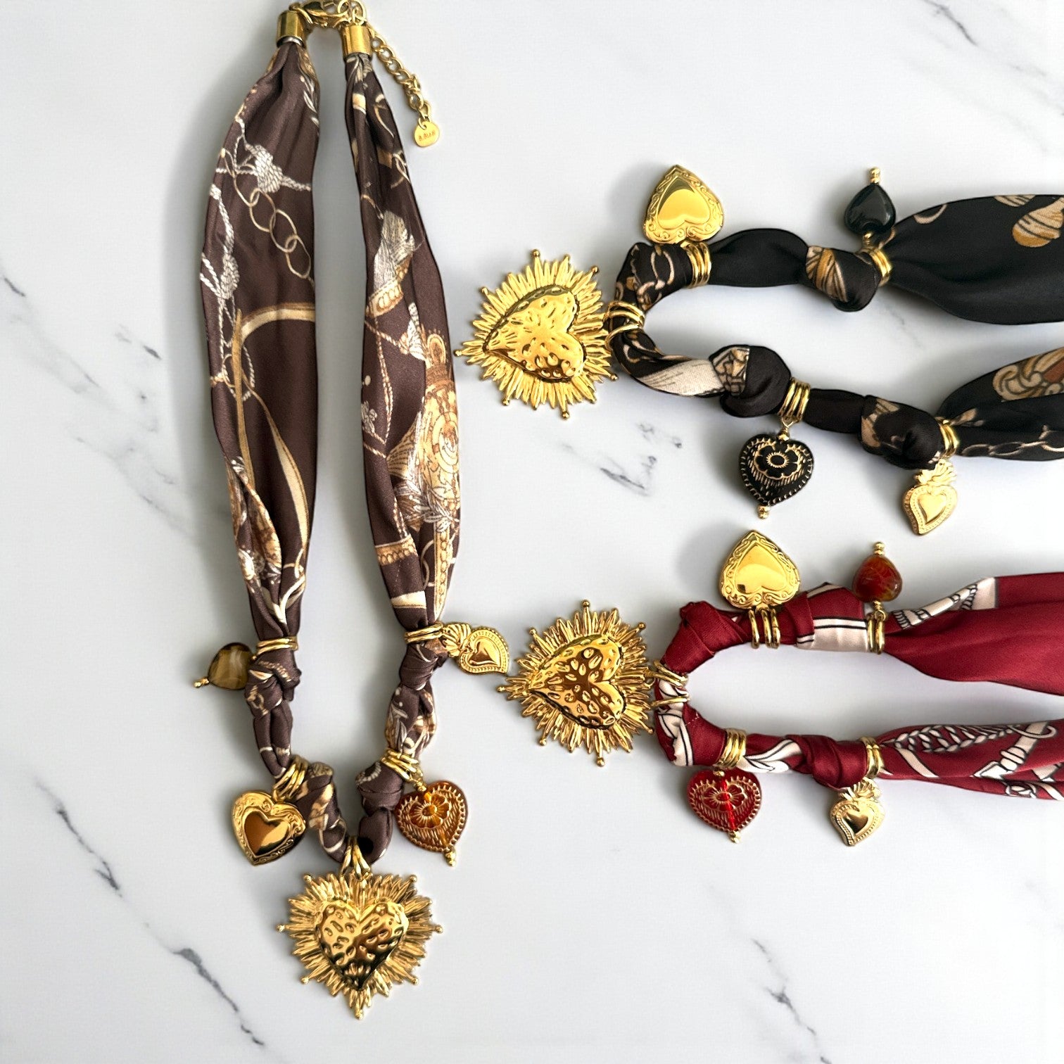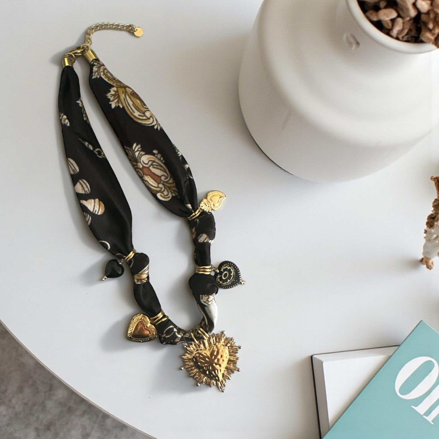 Το Satin Heart Charm Necklace συνδυάζει πολυτελές σατέν φουλάρι με χρυσά charms καρδιές και εντυπωσιακό μενταγιόν σε σχήμα ιερής καρδιάς – για ένα look που θυμίζει ιταλική κομψότητα τύπου Dolce Vita.