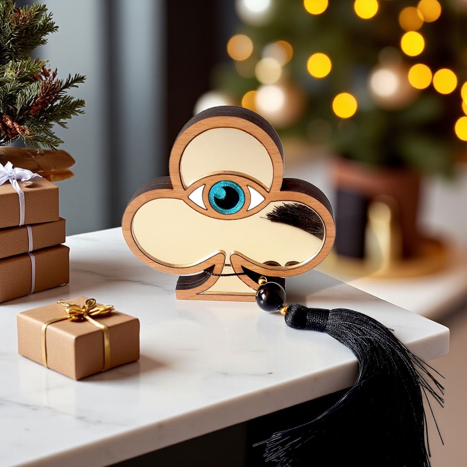 Φέτος παίξε το παιχνίδι της τύχης με το πιο ιδιαίτερο γούρι! Το Lucky Club Eye είναι ένα χειροποίητο επιτραπέζιο γούρι σε σχήμα σπαθί τράπουλας, διακοσμημένο με μοτίφ ματιού από plexiglass καθρέφτη. Συνοδεύεται από μαύρη φούντα και χάντρα που χαρίζουν πολυτέλεια και κίνηση.
