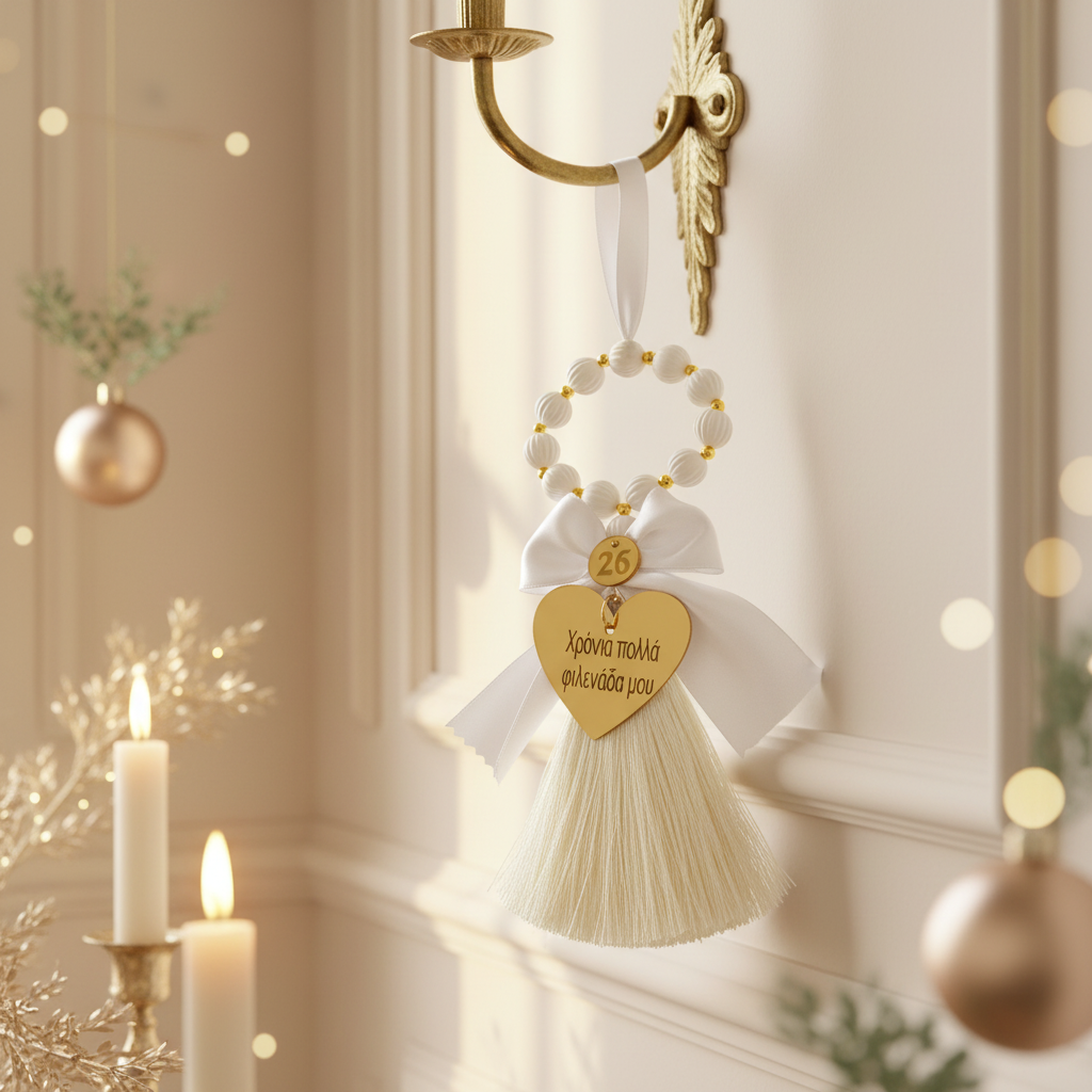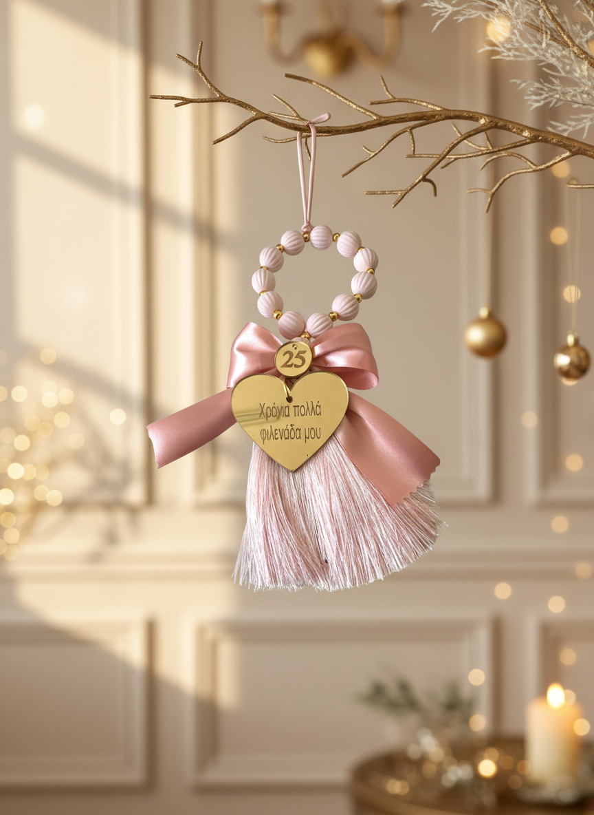 Το εντυπωσιακό “βραχιόλι” από χάντρες συνδυάζεται με σατέν φιόγκο, πλούσια φούντα και καρδιά από χρυσό plexiglass καθρέφτη, χαραγμένη με τη φράση “Χρόνια πολλά φιλενάδα μου”.