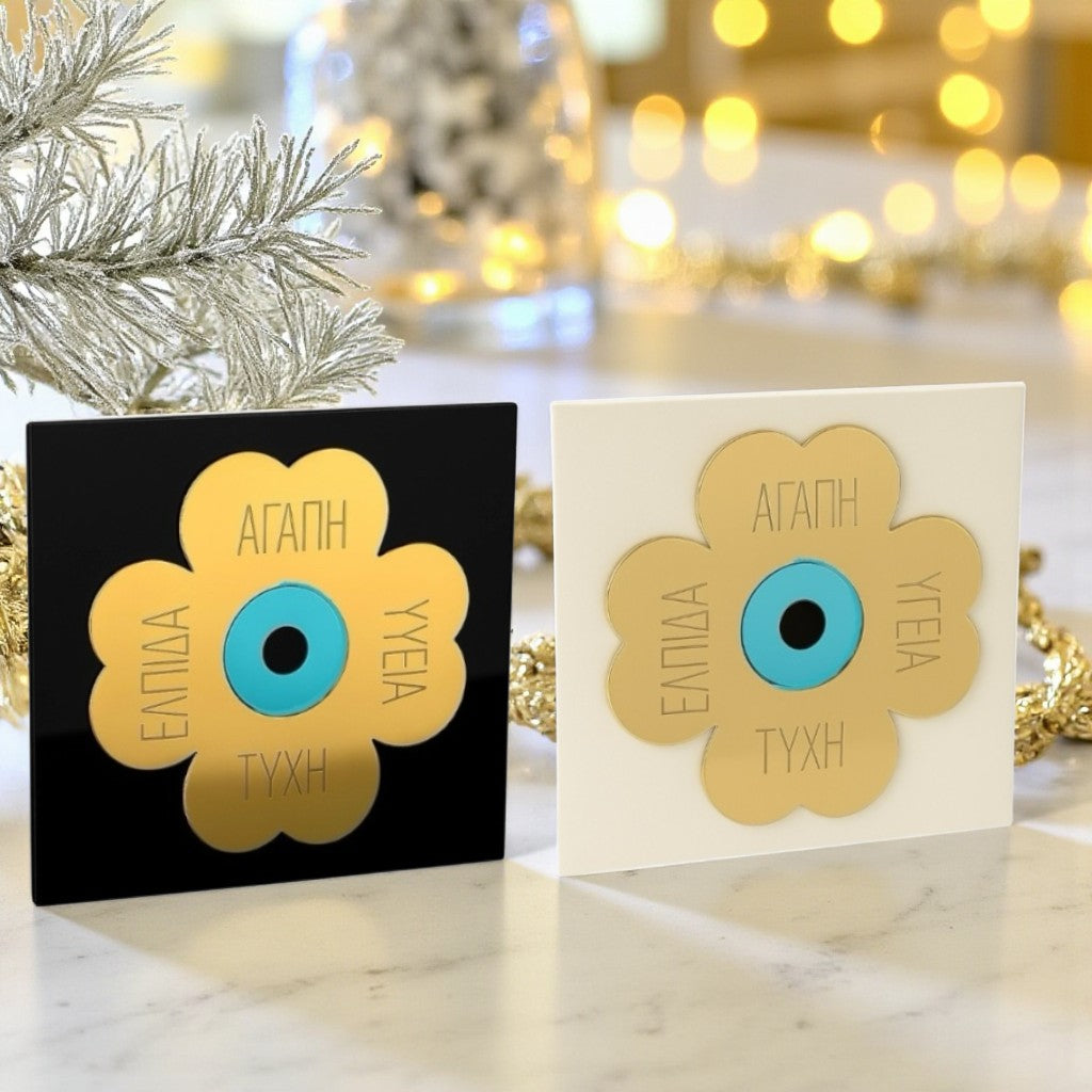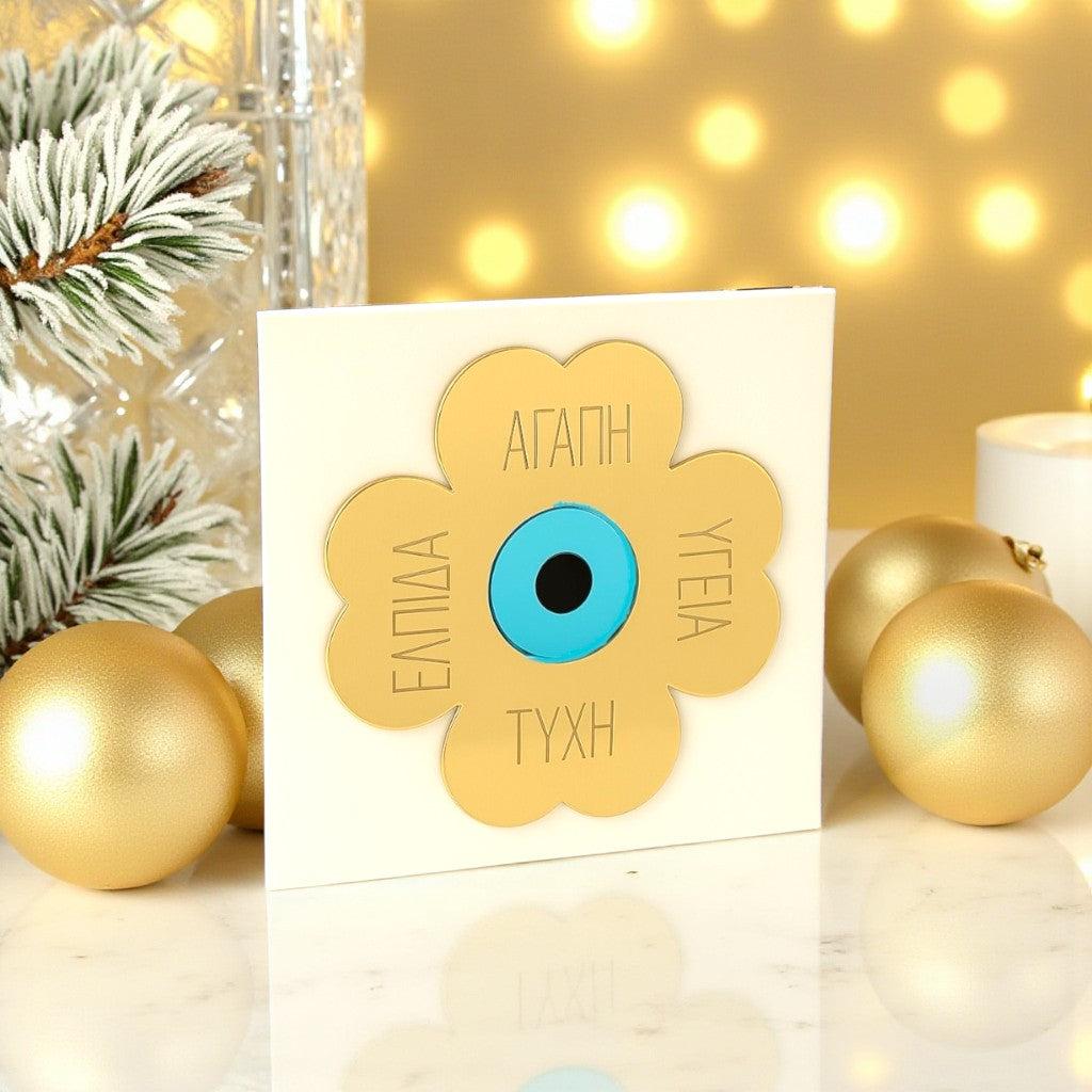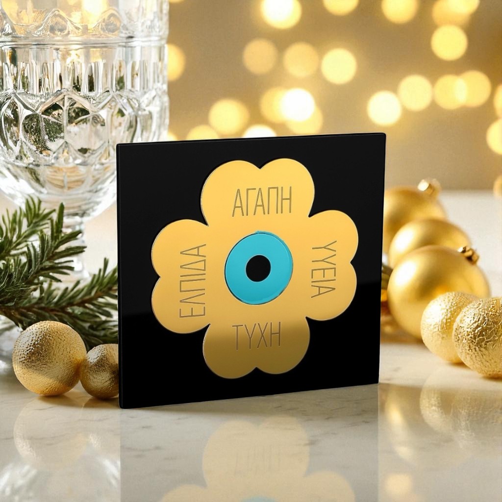 Οι χαραγμένες ευχές Υγεία, Αγάπη, Τύχη και Ελπίδα αναδεικνύουν τον συμβολισμό του, ενώ το εσωτερικό τυρκουάζ μάτι από plexiglass καθρέφτη ολοκληρώνει την πολυτελή αισθητική.
