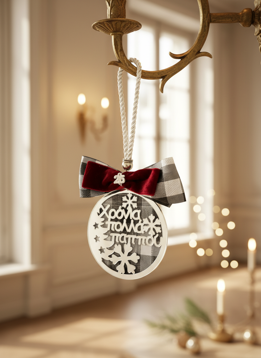 Χειροποίητο κρεμαστό γούρι με σατέν κορδόνι, διπλό φιόγκος με καρό και βελούδινη κορδέλα, μοτίφ με χάραξη 25 και στοχείο από πλεξιγκλάς ασημί καθρέφτη με χάραξη Χρόνια πολλά Παππού.