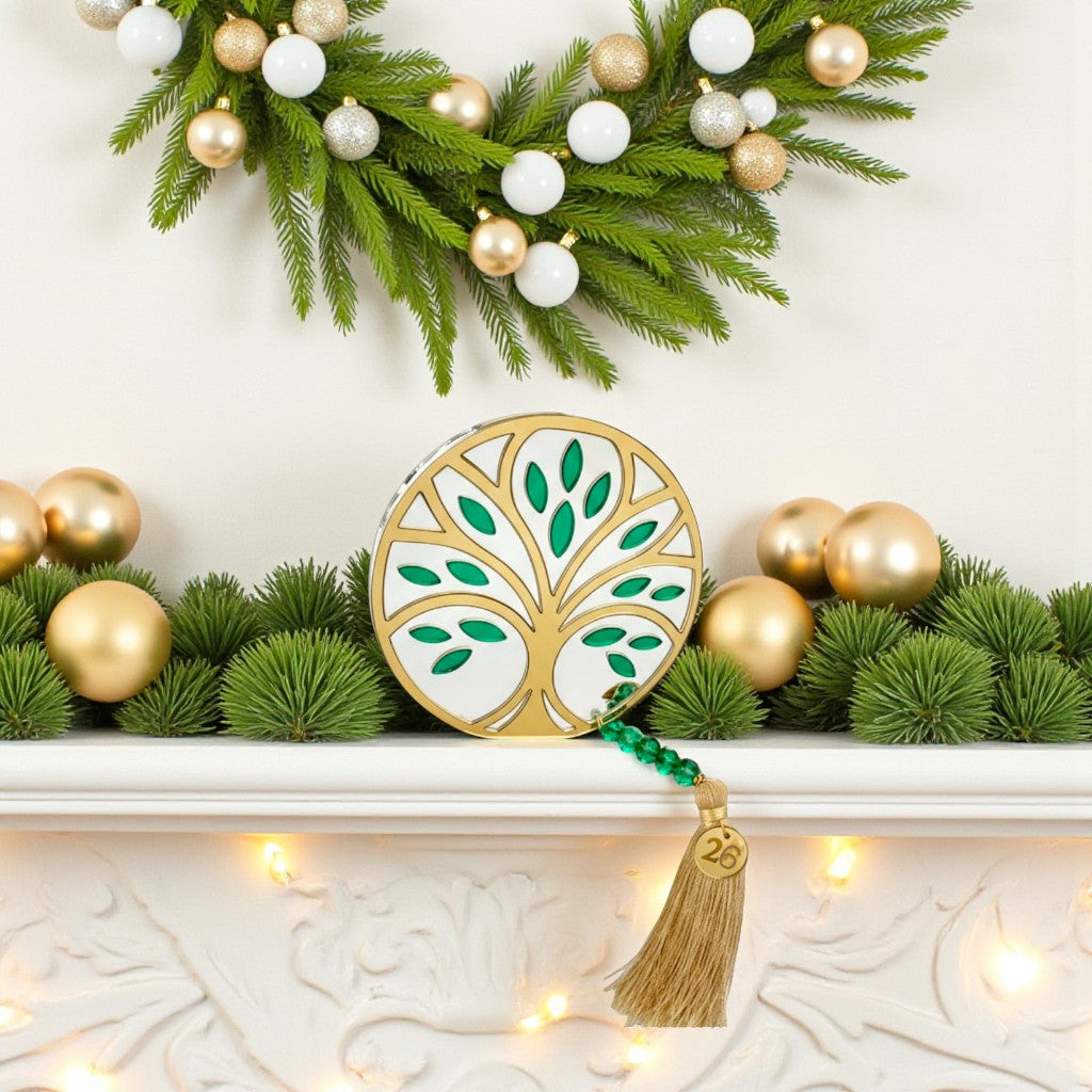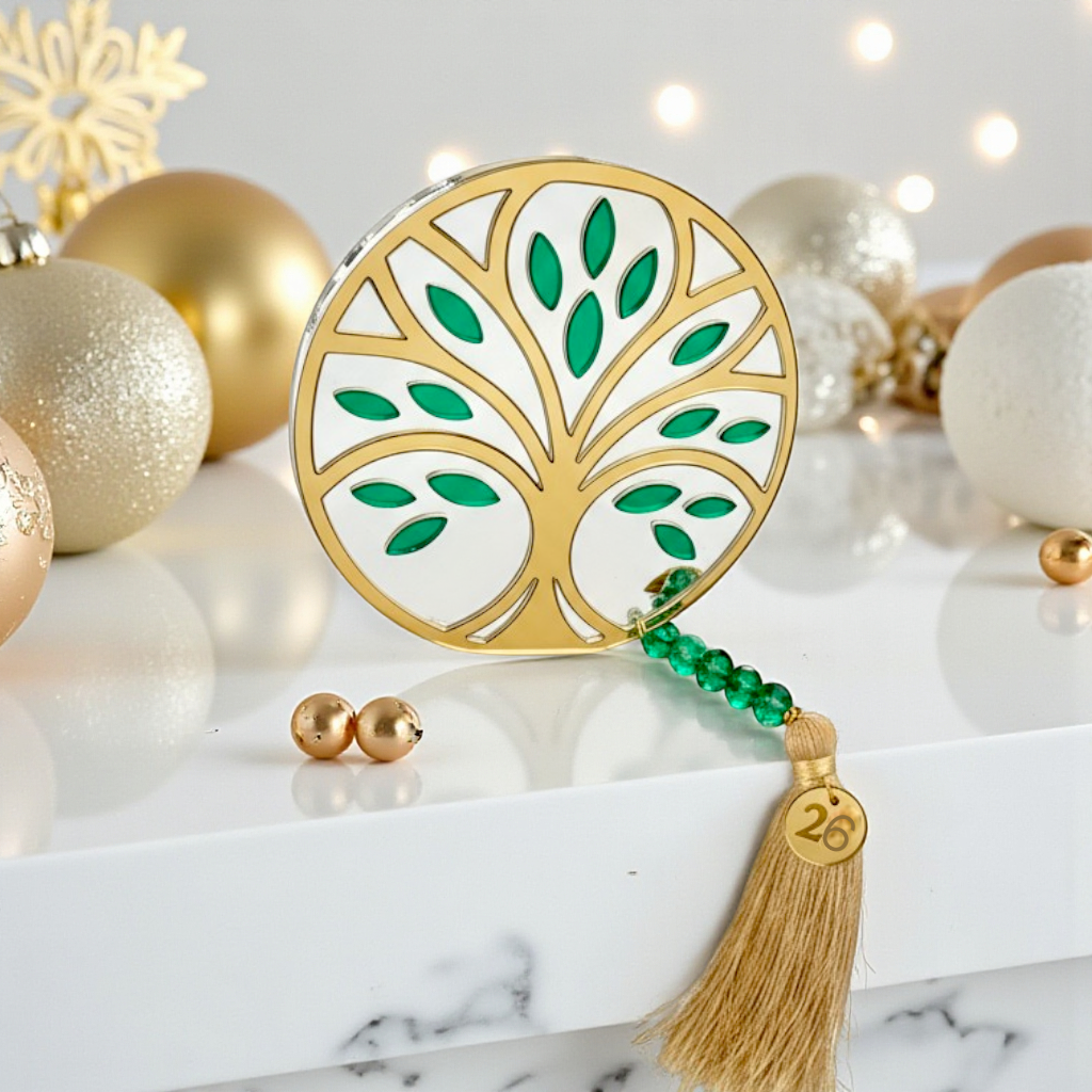 Κατασκευασμένο από πλεξιγκλάς καθρέφτες σε χρυσό, ασημί και πράσινο χρώμα, στολίζεται με κρυστάλλινες χάντρες, μεταλλικό charm “26” και πλούσια φούντα που ολοκληρώνει το elegant σύνολο. ✨