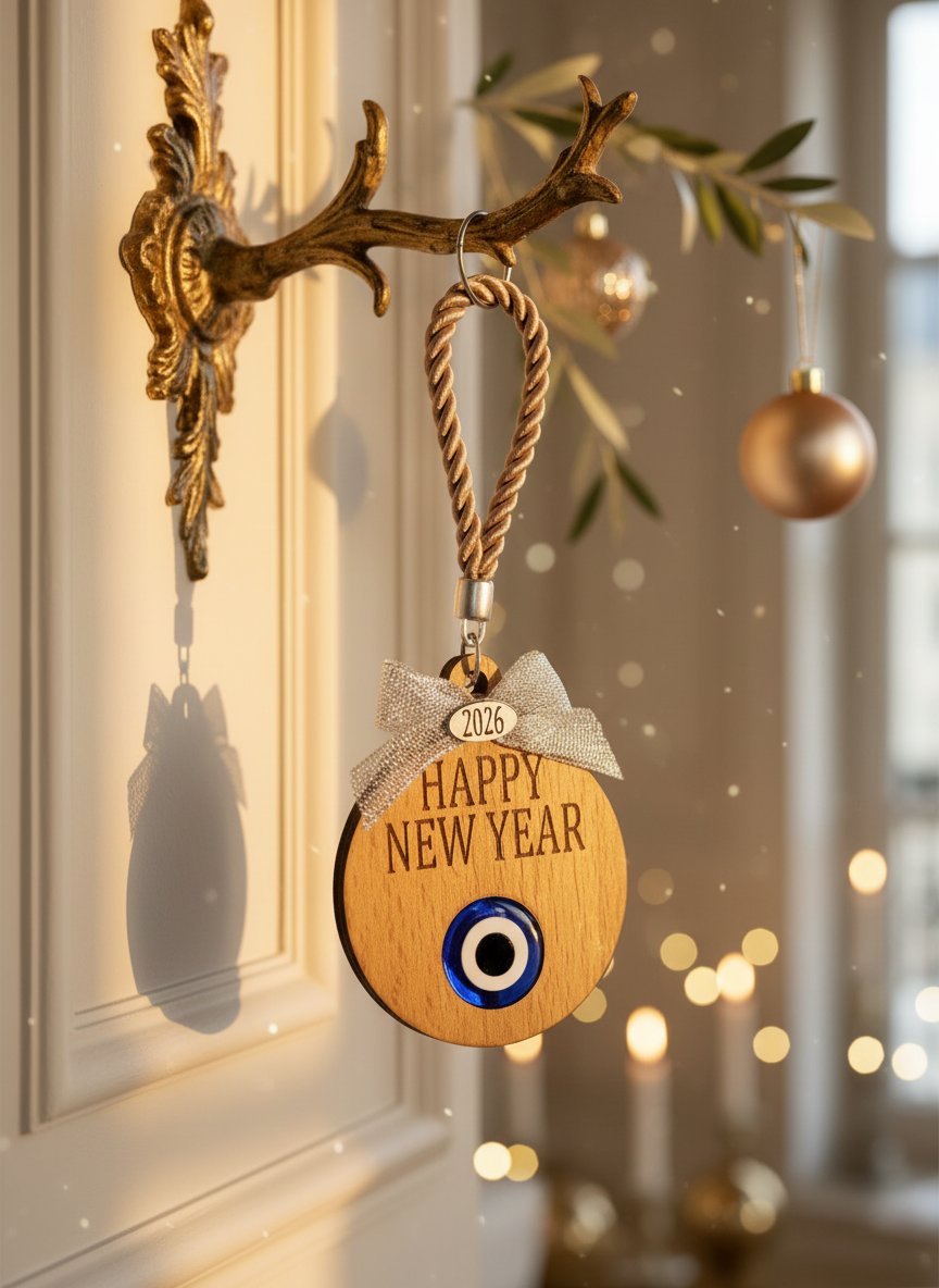 Ένα διαχρονικό, χειροποίητο γούρι που συνδυάζει φυσικά υλικά και συμβολισμούς καλοτυχίας. Το στρογγυλό μοτίφ από MDF οξιάς φέρει χαραγμένη την ευχή “Happy New Year” και στολίζεται με ένα εντυπωσιακό γυάλινο μάτι σε βαθύ μπλε. Ο φιόγκος σε ασημί glitter και η μεταλλική ετικέτα με το έτος 2026 ολοκληρώνουν την elegant εμφάνιση. Το χοντρό σαμπανιζέ κορδόνι κάνει το γούρι έτοιμο για ανάρτηση.