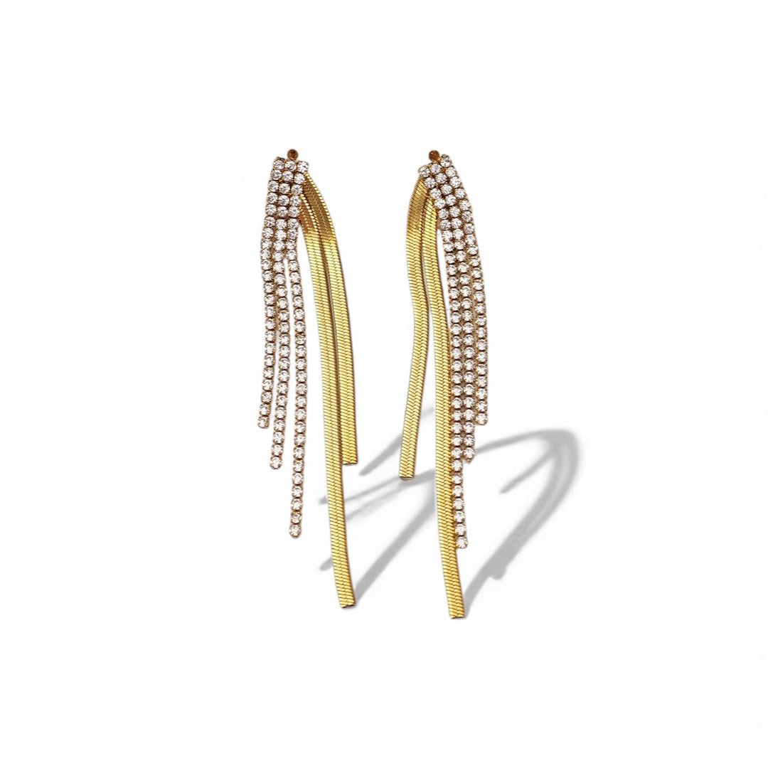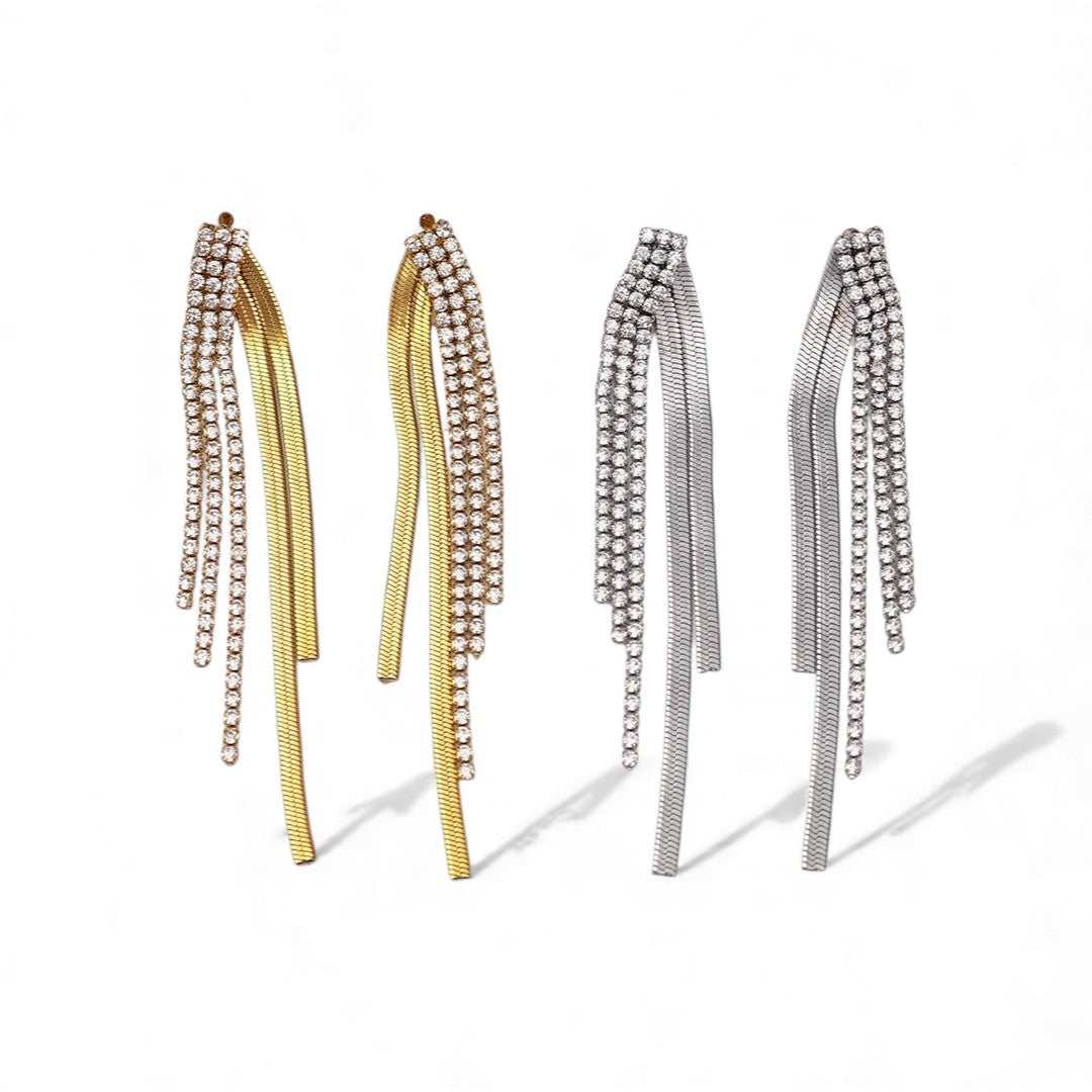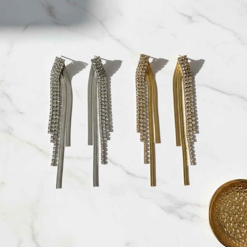 Κρεμαστά σκουλαρίκια από ανοξείδωτο ατσάλι, με διπλή αλυσίδα strass και λεπτές μεταλλικές γραμμές που δημιουργούν εντυπωσιακή κίνηση σε κάθε βήμα. Το μήκος τους (7 εκ.) τα κάνει statement χωρίς να βαραίνουν το μάτι – ιδανικά για βραδινά looks, ρεβεγιόν, cocktail εμφανίσεις αλλά και chic parties.