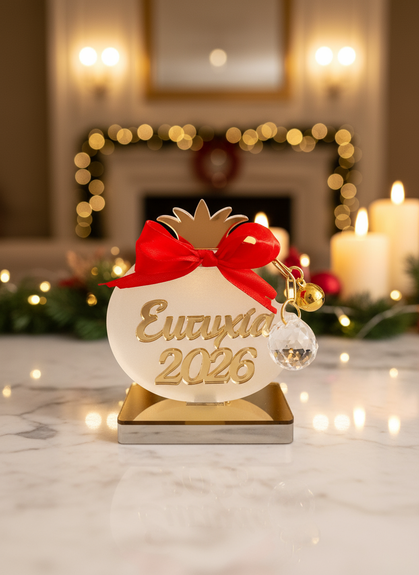 Υποδέξου τη νέα χρονιά με το χειροποίητο επιτραπέζιο γούρι ρόδι από plexiglass, διακοσμημένο με κόκκινο φιόγκο, κρυστάλλινη μπάλα και κουδουνάκι. Με την ευχή Ευτυχία 2026, το ρόδι – αιώνιο σύμβολο αφθονίας και καλοτυχίας – γίνεται το απόλυτο δώρο για το νέο έτος.