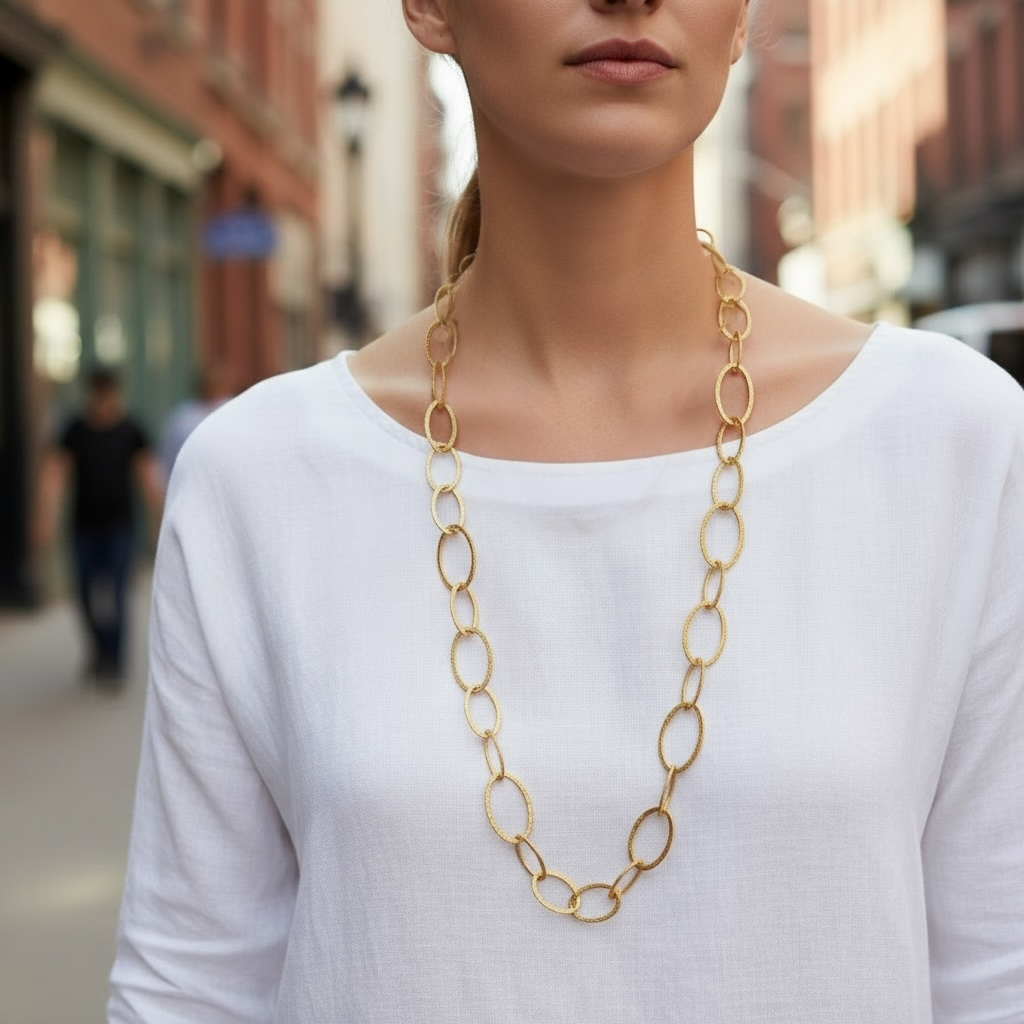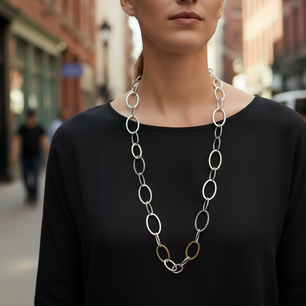 Minimal αλλά εντυπωσιακό — το κολιέ από ατσάλι με σφυρήλατους κρίκους προσθέτει λάμψη σε κάθε εμφάνιση. Διαθέσιμο σε χρυσό ή ασημί, είναι το απόλυτο must για layering ή solo statement look.