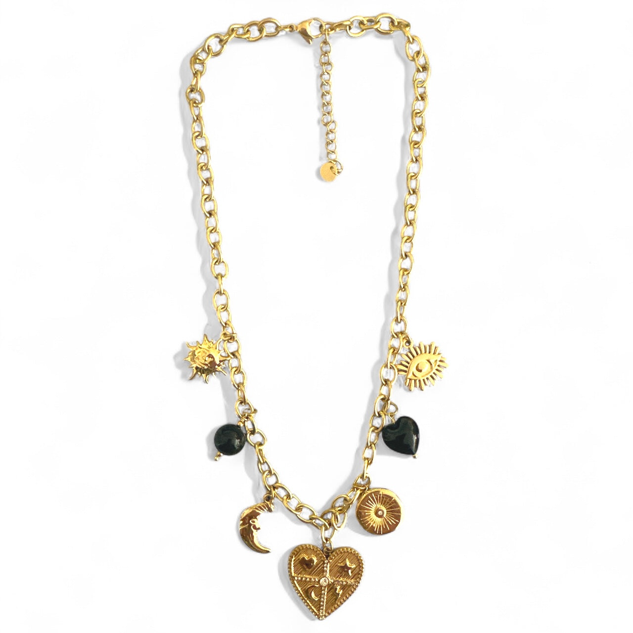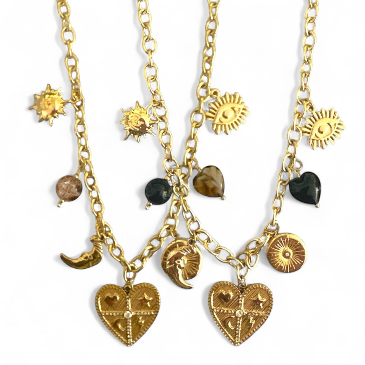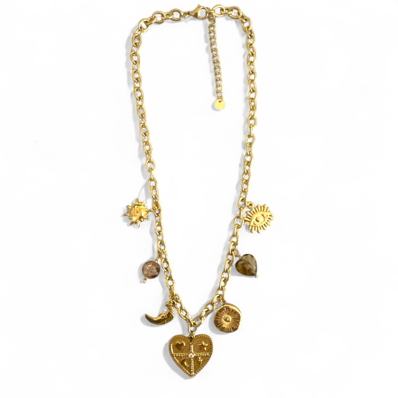 • Σχέδιο: Κολιέ με κρεμαστά charms (καρδιά, μάτι, φεγγάρι, ήλιος) & χάντρες