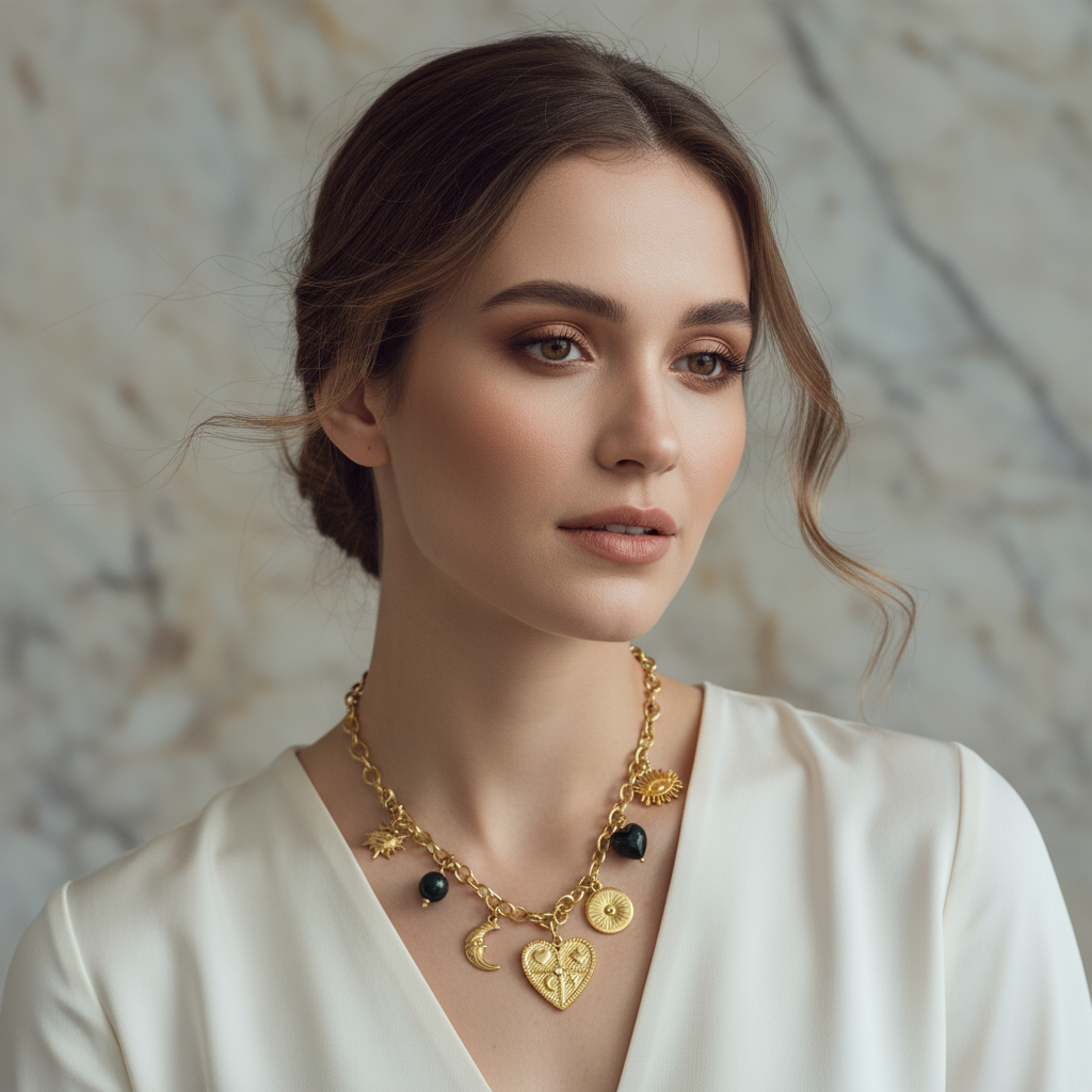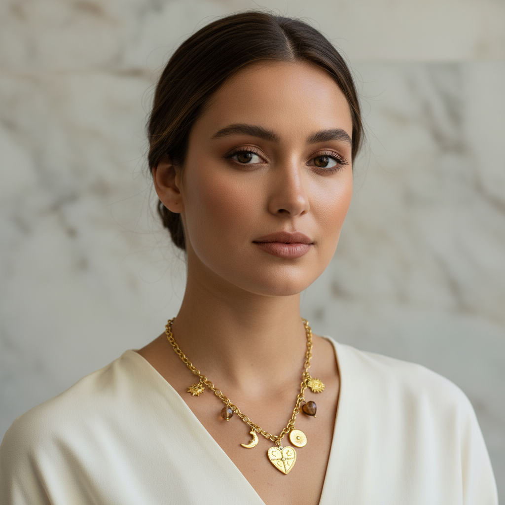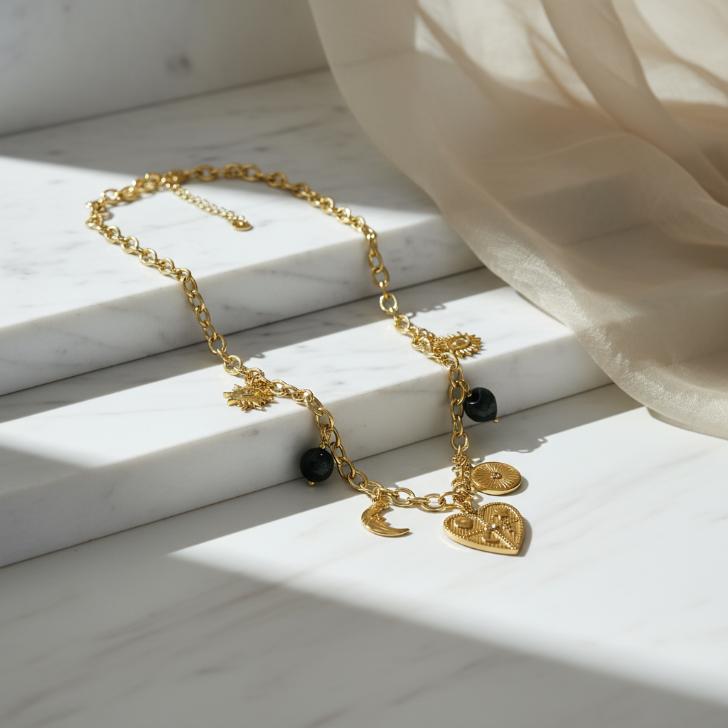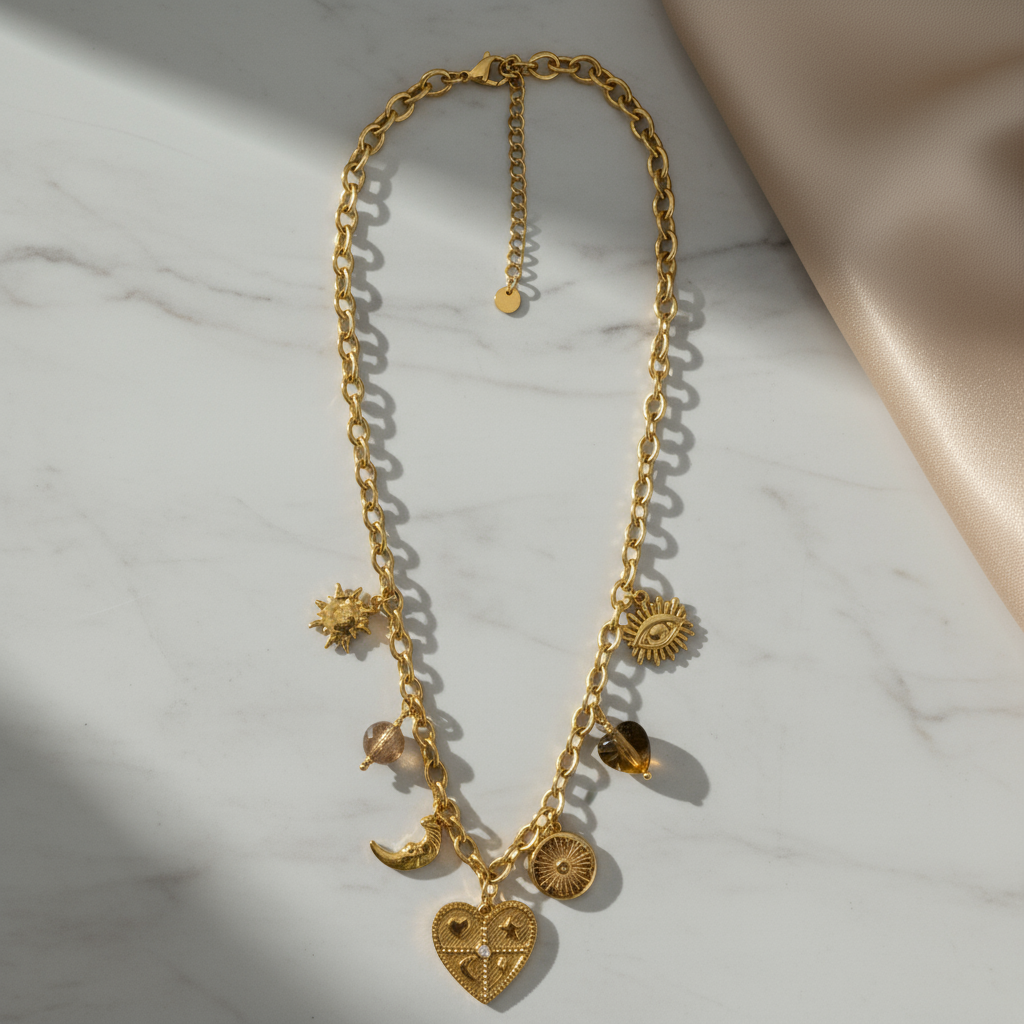Σχέδιο: Κολιέ με κρεμαστά charms (καρδιά, μάτι, φεγγάρι, ήλιος) & χάντρες