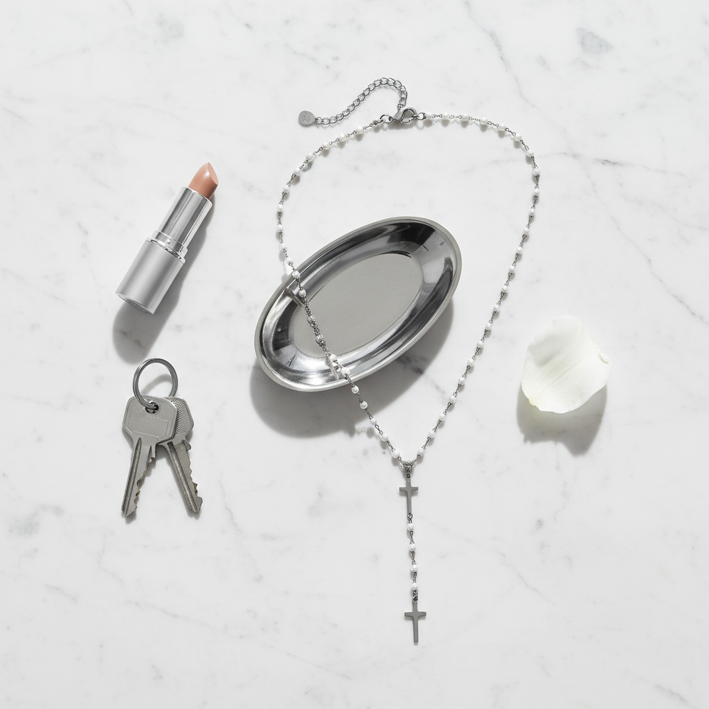 Το Cross & Pearls Necklace είναι το πιο elegant κόσμημα της σεζόν — με λεπτές πέρλες, διακριτικούς σταυρούς και μια χρυσή ή ασημί λάμψη που αναδεικνύει το ντεκολτέ.