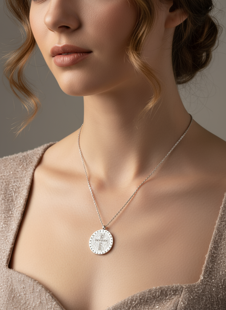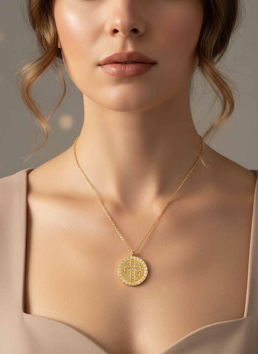 Το Divine Glow είναι ένα λαμπερό κόσμημα με διακριτικό χριστιανικό συμβολισμό και έντονη γοητεία. Το στρογγυλό μενταγιόν φιλοξενεί έναν ανάγλυφο σταυρό γεμάτο στρας, πλαισιωμένο από ματ ανάγλυφη υφή και λαμπερές λεπτομέρειες που μαγνητίζουν το φως.