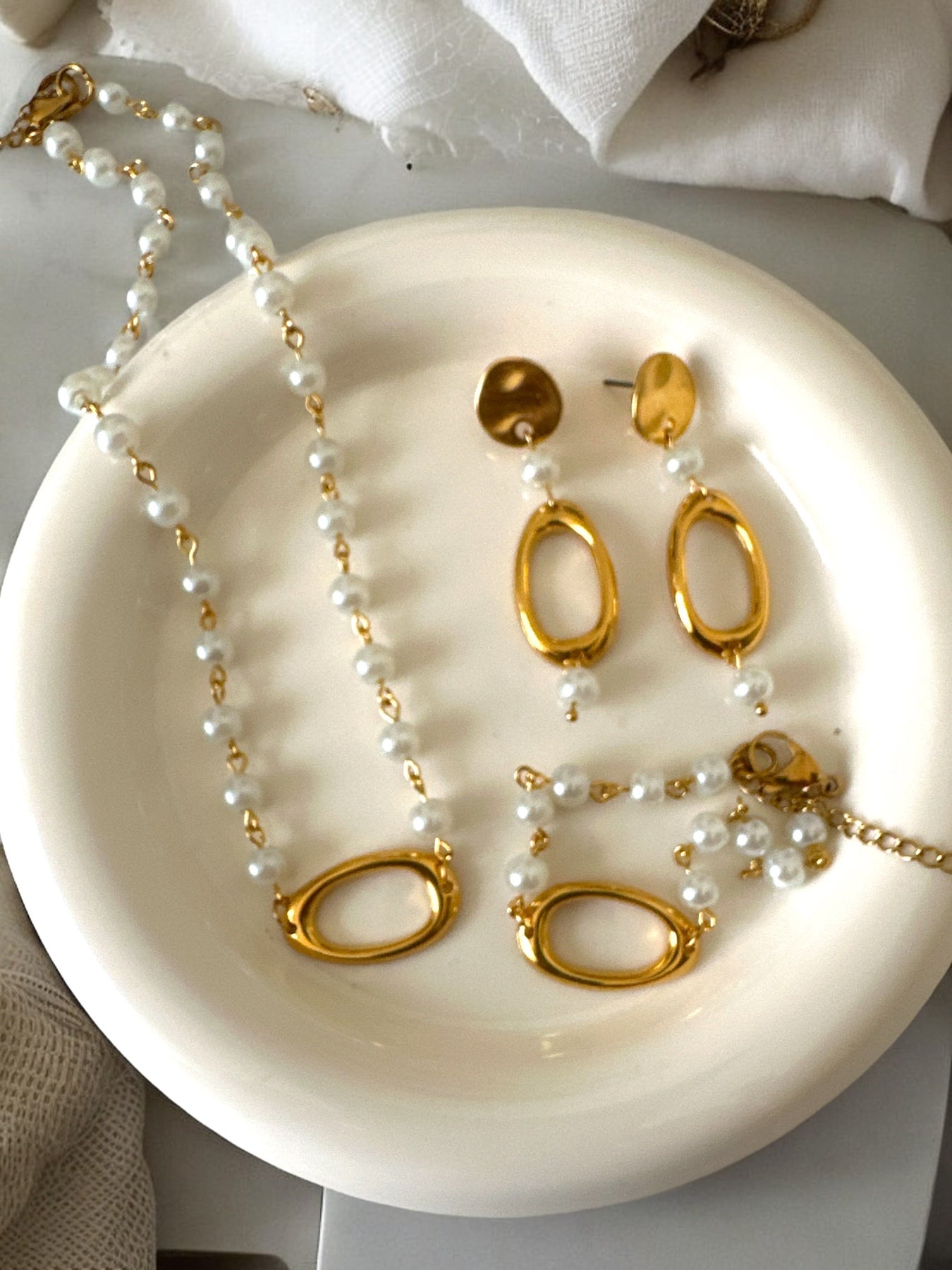 Χειροποίητο κολιέ με πέρλες και οβάλ επίχρυσο μοτίφ. Ατσάλινο κούμπωμα.