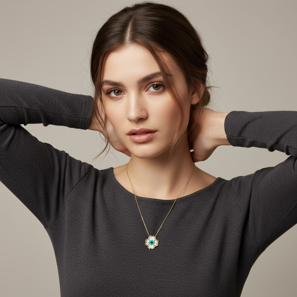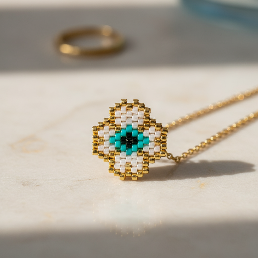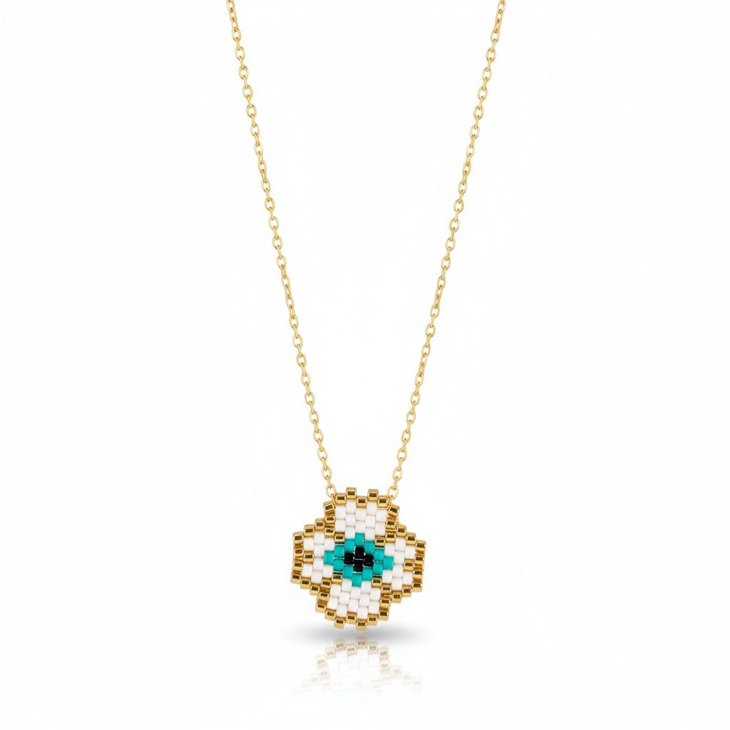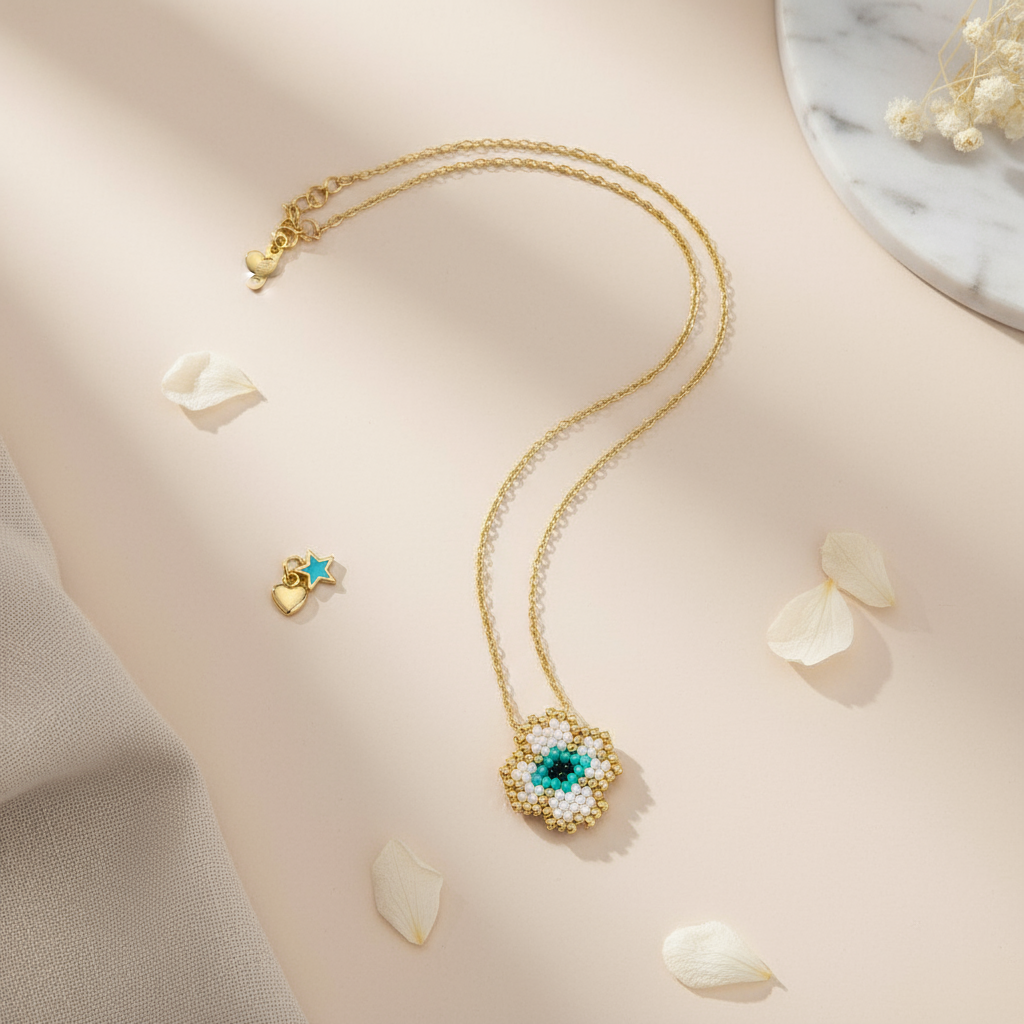 Το Lucky Clover Eye είναι ένα κολιέ που συνδυάζει δύο πανίσχυρα σύμβολα: το τετράφυλλο τριφύλλι, που φέρνει τύχη και ευημερία, και το μάτι, που προστατεύει από την αρνητική ενέργεια. Το μοτίφ, φτιαγμένο από χάντρες Miyuki σε μπεζ, χρυσές και τιρκουάζ αποχρώσεις, δίνει στο κόσμημα χειροποίητη λεπτομέρεια και girly-boho αισθητική. Ένα charm που θα γίνει το προσωπικό σου φυλαχτό και θα σε συνοδεύει καθημερινά με στυλ και θετική αύρα.