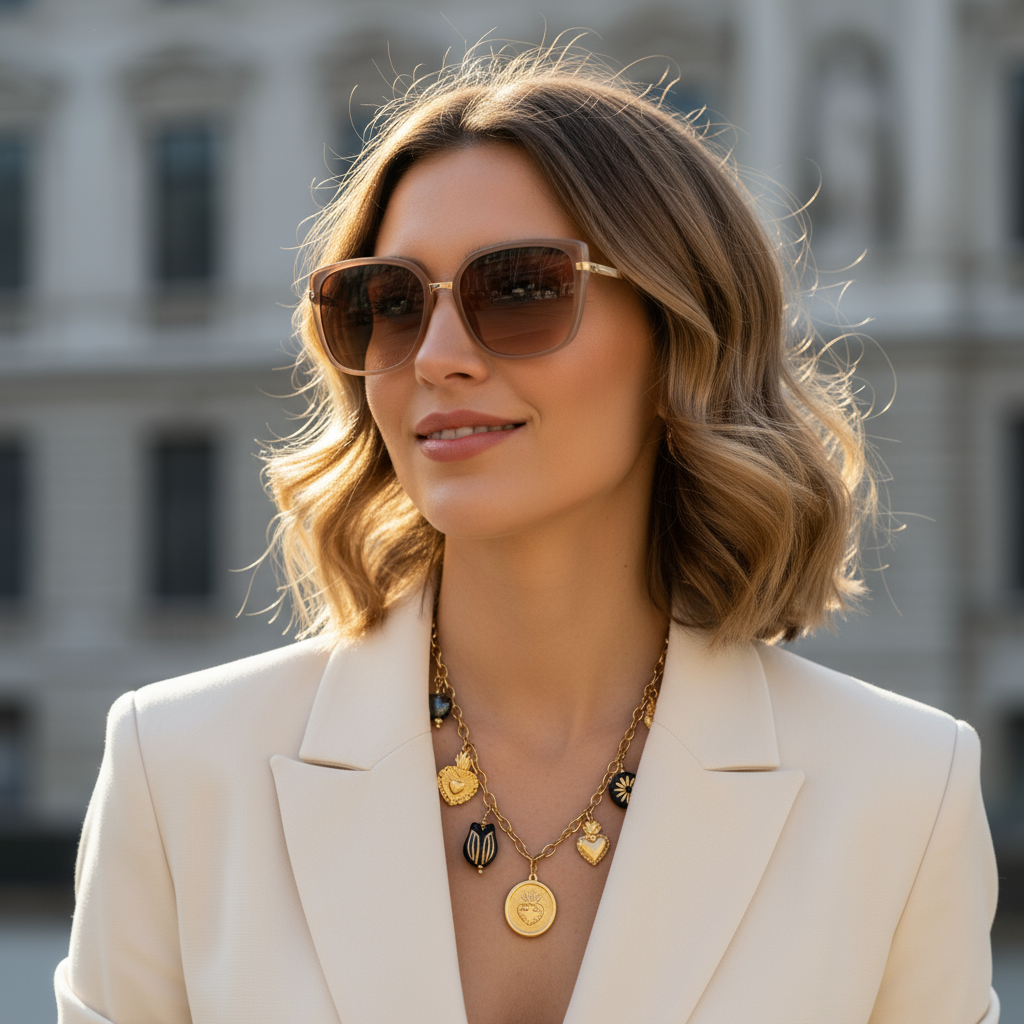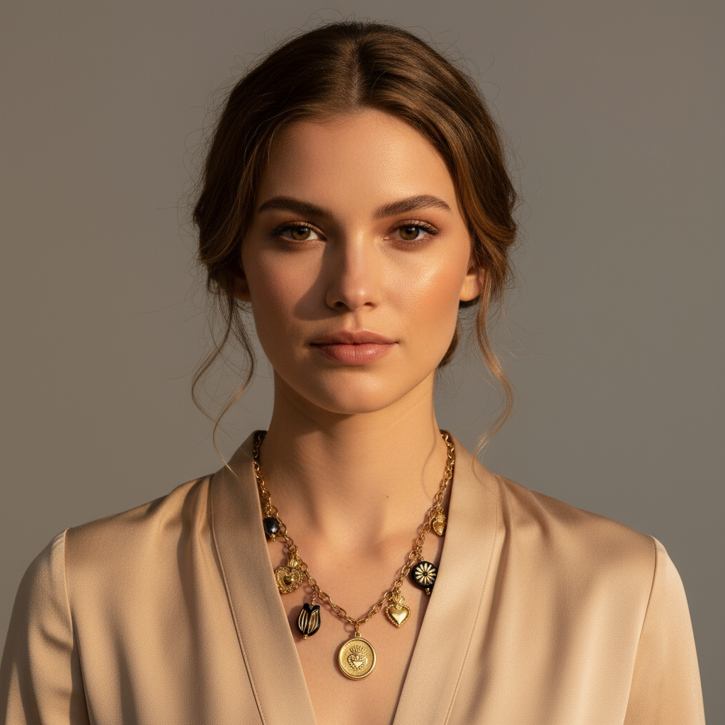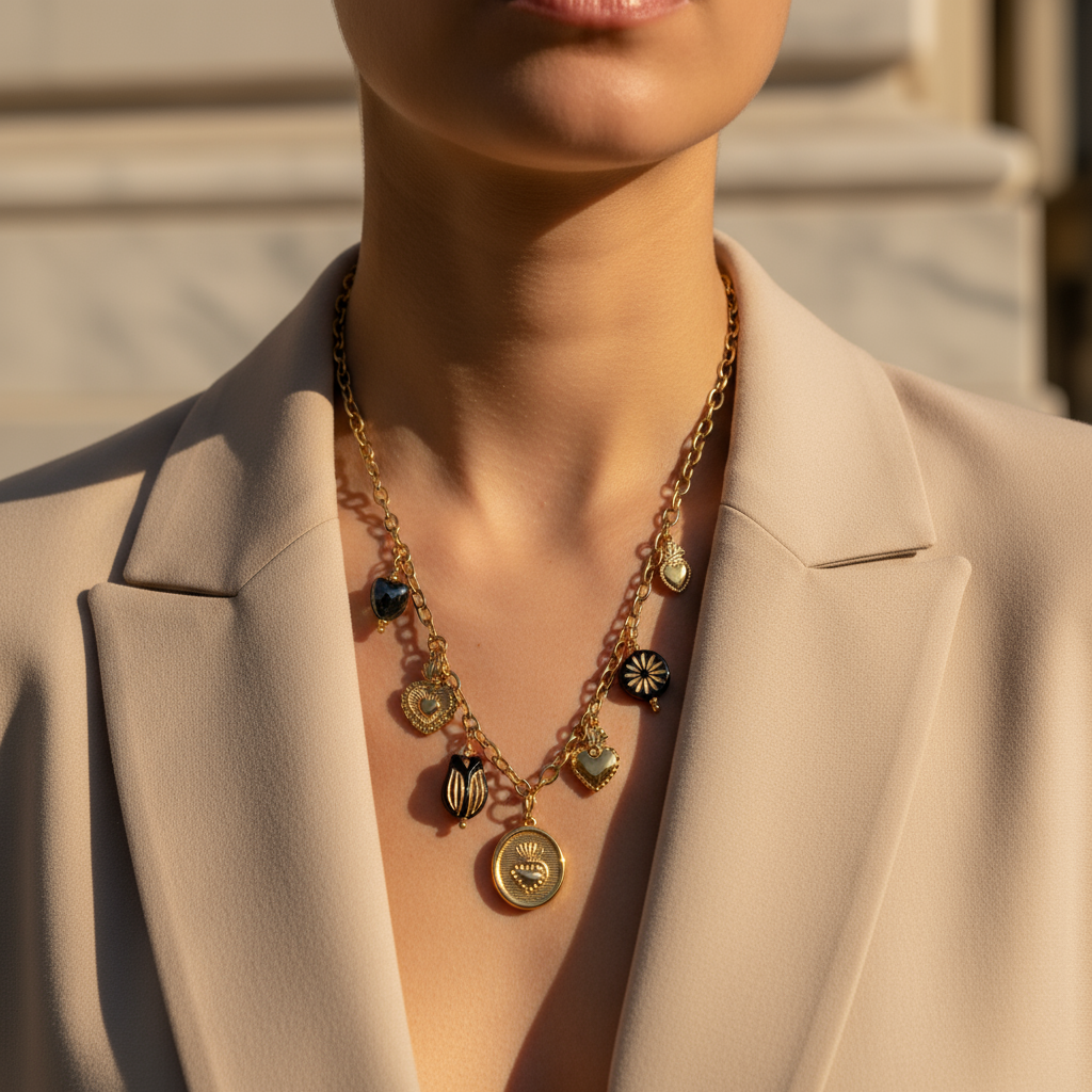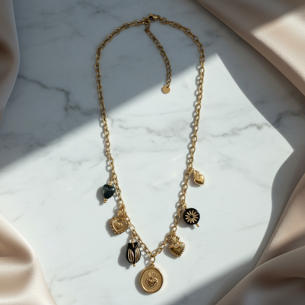 Ένα κομμάτι γεμάτο συμβολισμούς και στυλ ✨ Το Mystic Charms Necklace είναι ατσάλινο κολιέ με χρυσή αλυσίδα και μοναδικά charms: ιερά καρδιές, λουλούδι, φυλαχτά και μαύρες λεπτομέρειες που χαρίζουν μυστήριο και boho–luxury ύφος.