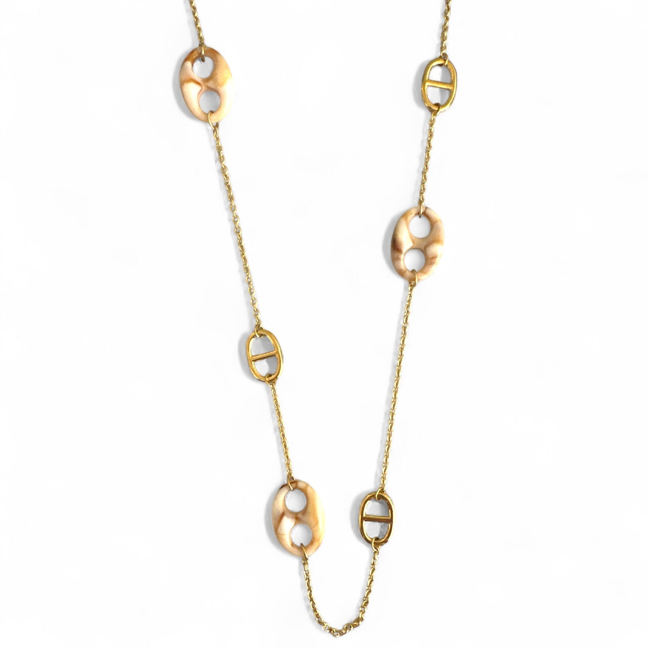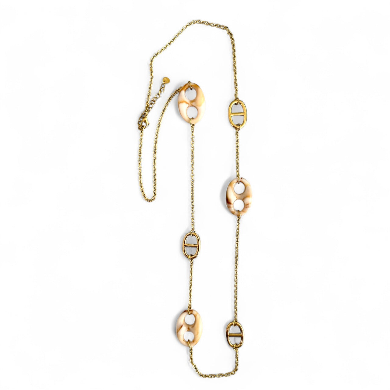 Minimal αλλά εντυπωσιακό, το Oval Charm Chain είναι ένα ατσάλινο μακρύ κολιέ που συνδυάζει χρυσή αλυσίδα με οβάλ στοιχεία σε μπεζ–καφέ αποχρώσεις και χρυσές λεπτομέρειες.