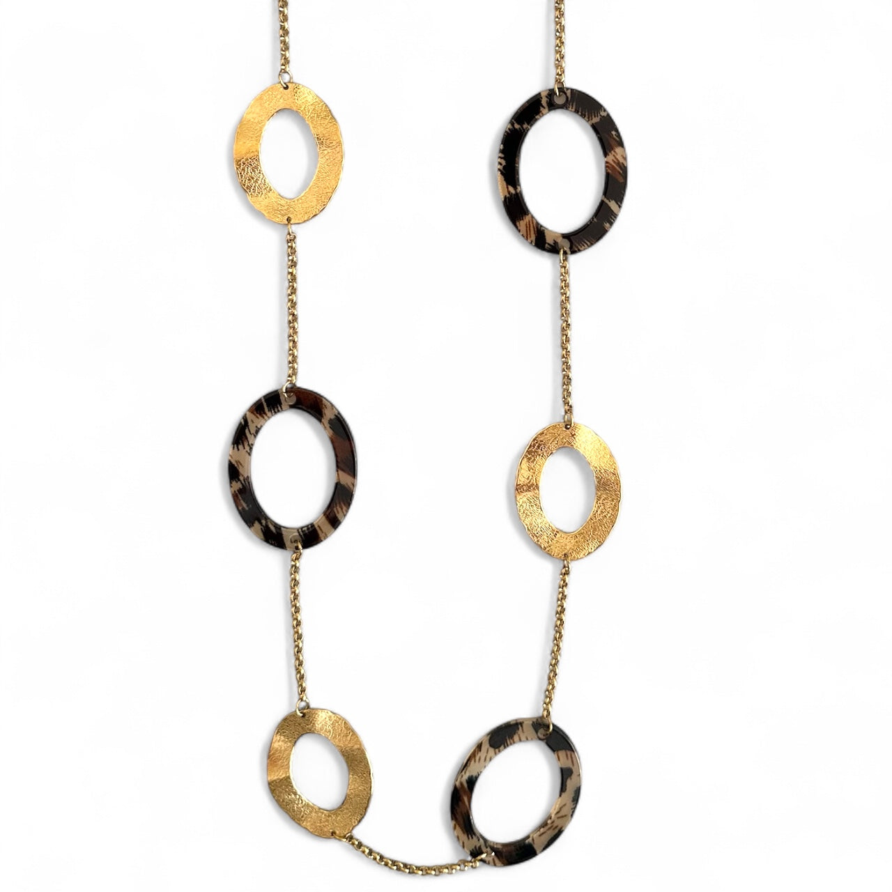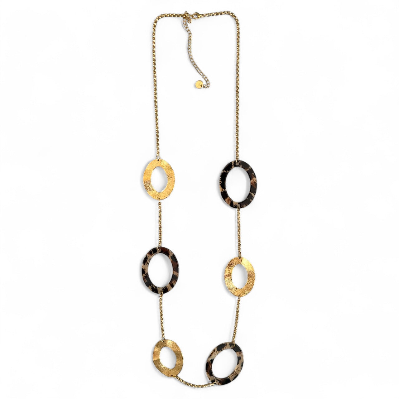 Ένα μακρύ ατσάλινο κολιέ με χρυσή αλυσίδα και εναλλασσόμενους οβάλ κρίκους σε animal print και χρυσό φινίρισμα.