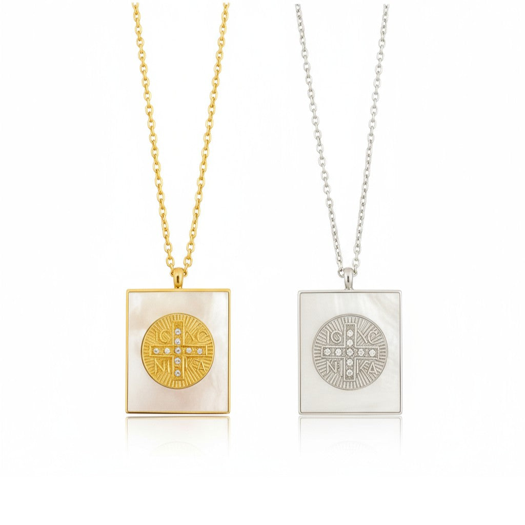 Το Sacred Block είναι ένα εντυπωσιακό statement κολιέ εμπνευσμένο από τη βυζαντινή παράδοση. Η τετράγωνη βάση από όψη φίλντισι φιλοξενεί ένα λεπτοδουλεμένο IC XC NI KA σταυρό, με λεπτομέρειες σε χρυσό ή ασημί. Ένα μοντέρνο φυλαχτό που συνδυάζει πίστη και αισθητική.